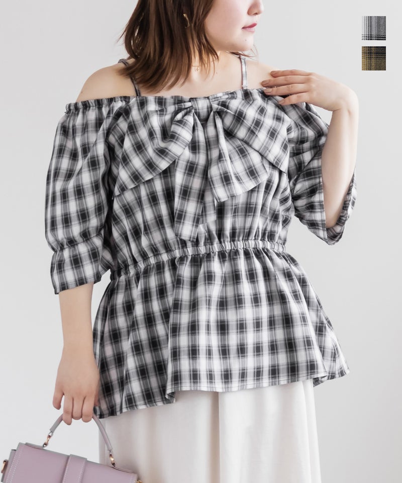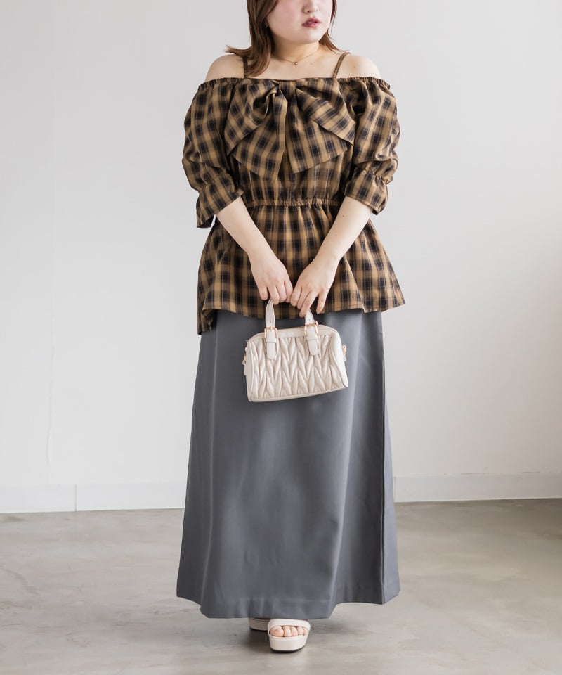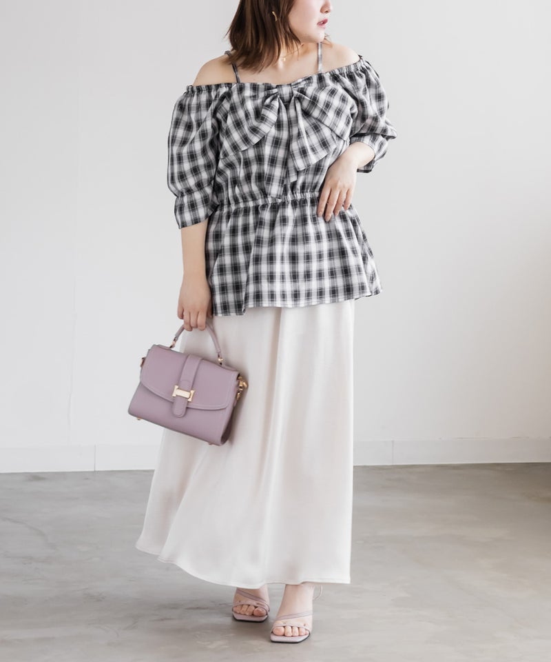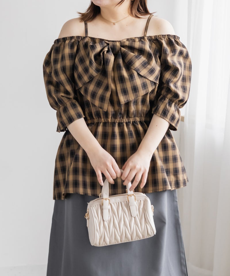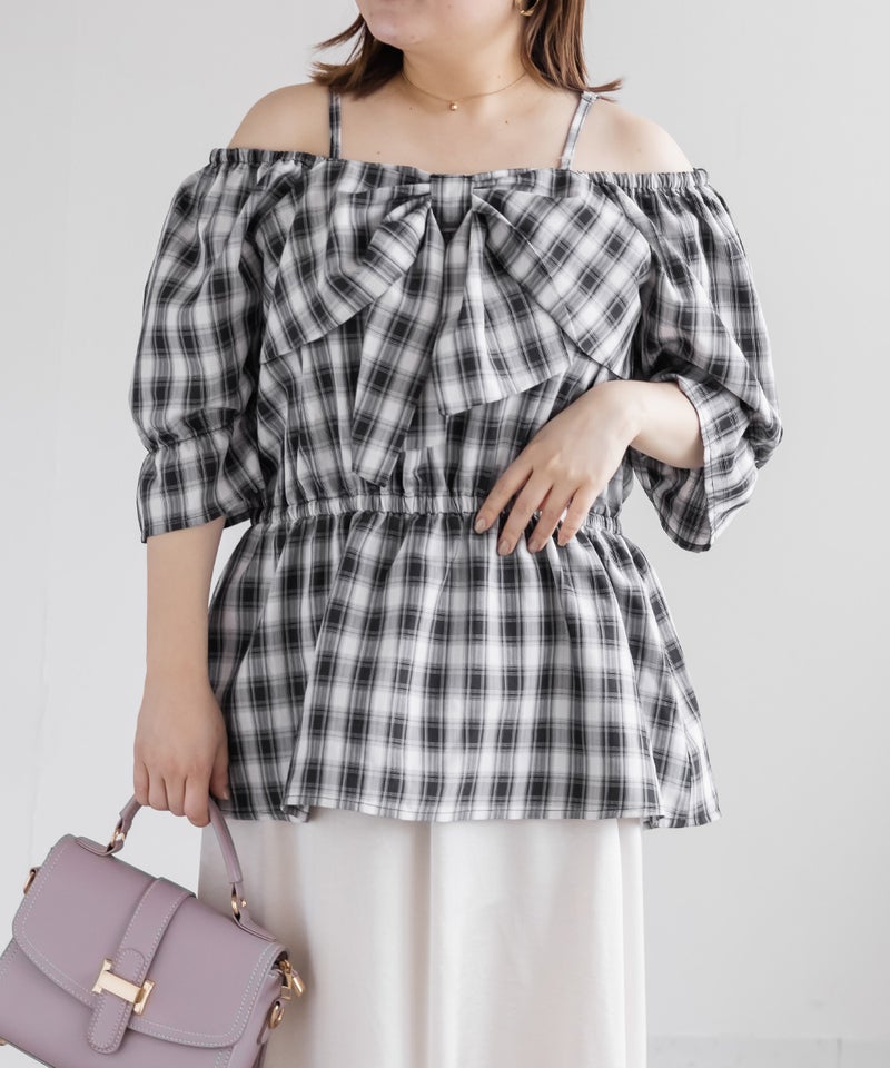 3Lを着てちょうどいい着心地でした。肩紐がついていてオフショルでもずり落ちる心配はないです◎チェック柄と大きめのリボンが可愛くて、トレンド感もたっぷりなデザインです!オフショルなのでデコルテや顔回りがすっきりした印象なって、着やせも抜群です。ウエストからふわっと広がるペプラムデザインになっていて、お腹周りもしっかりカバーしてくれます♪