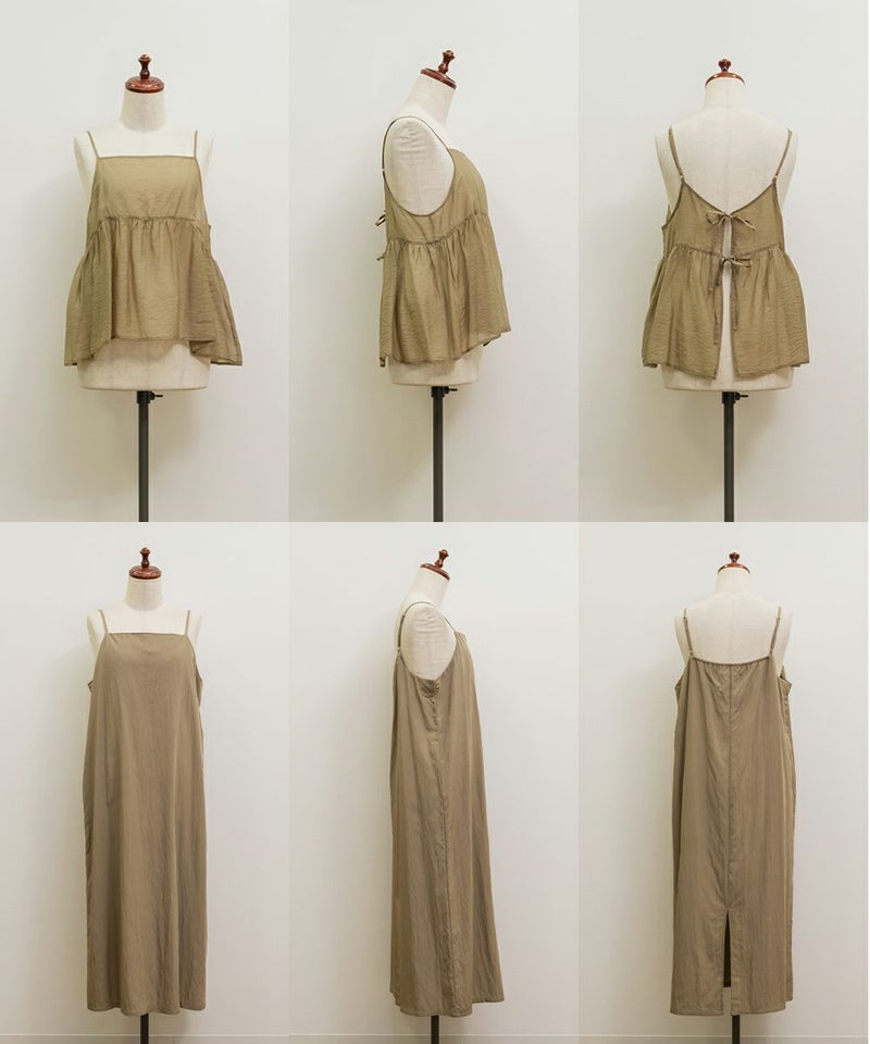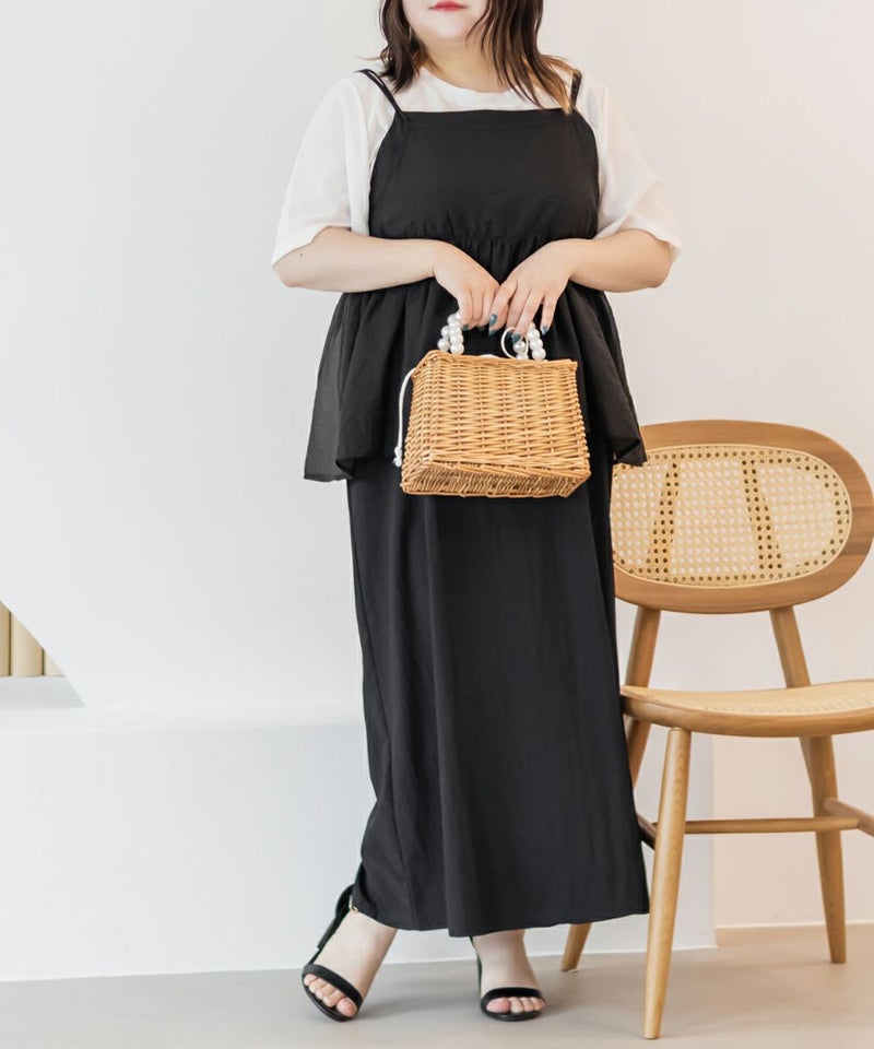 3Lを着て程よくゆとりのあるサイズ感でした。ワンピースはゴム入りですが、すっきりとしたシルエットなので、心配な方はサイズ確認をお勧めします◎シアー感がかわいいビスチェがセットになったキャミワンピースで、重ねて着るのが今っぽくて、ビスチェのふんわりペプラムがお腹周りもカバーしてくれる、優秀アイテムです♪それぞれ単品でも使いやすい色味・デザインなので、1セットあると着回しに便利なアイテムです!オールシーズン着られて、たくさんコーデを楽しめます!