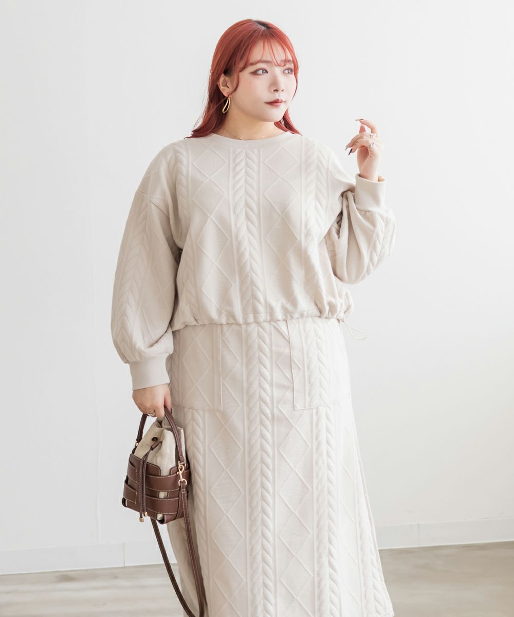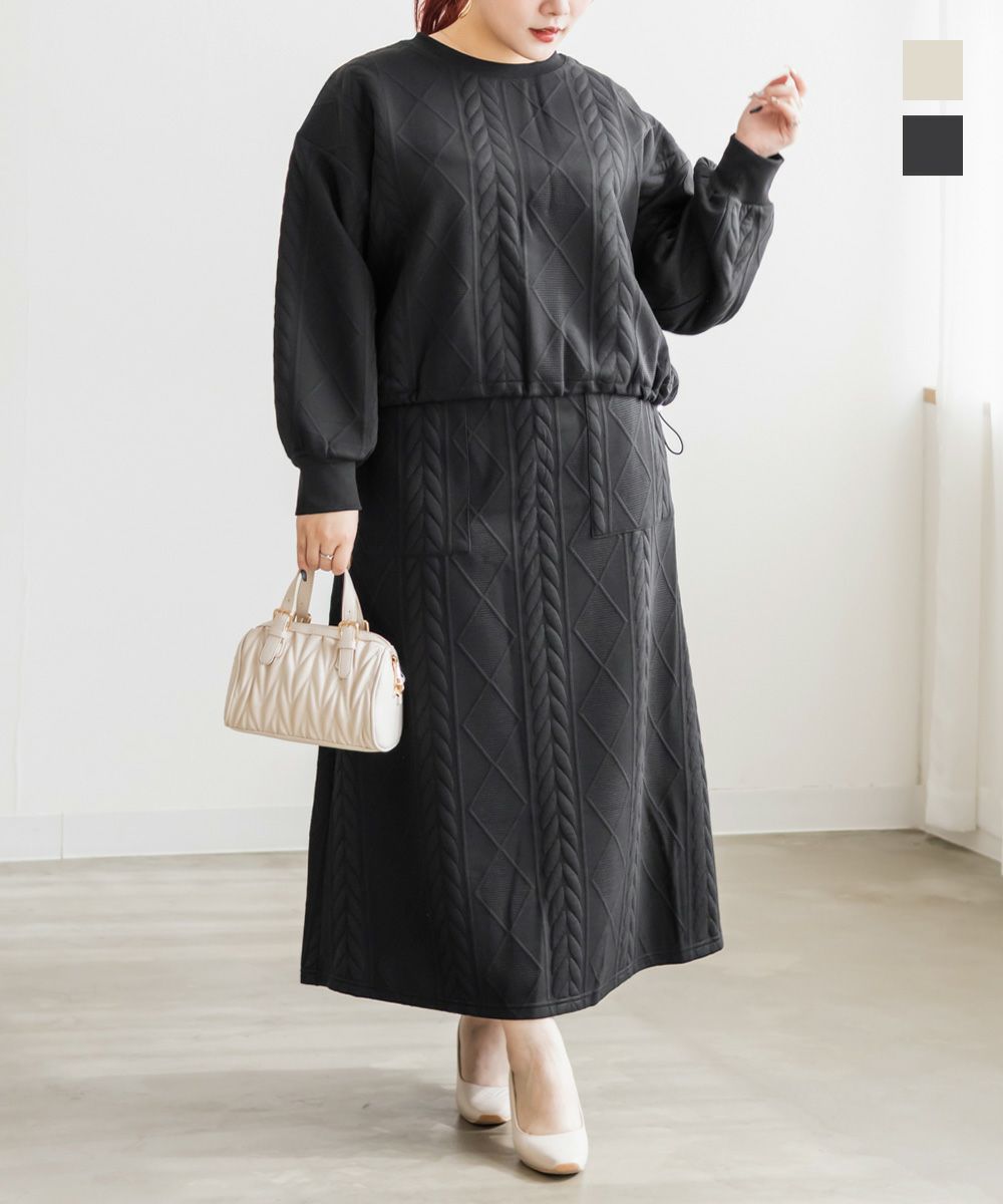 3Lサイズを着用して、ちょうどよく窮屈感無く着られました。スカートはフレアシルエットなので腰回りなど気になる所もカバーしてくれます♪トップスはドロストできる仕様で、絞って着用すると野暮ったくならずメリハリを持って着れました!軽くてやわらかい伸縮のある生地で着心地はとってもらくちんです◎セットアップになっているのでコーデいらずでこなれ感のある着こなしになれます。それぞれ単品でも着回しできるので1セットあると便利なアイテムです!