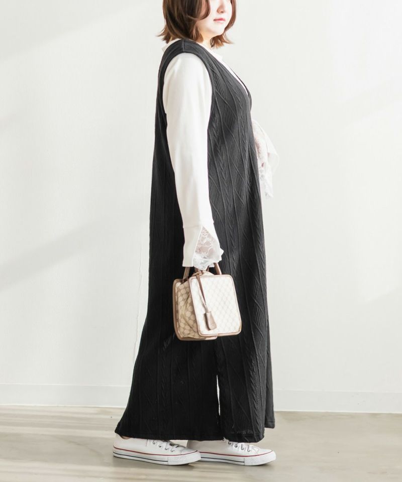3Lサイズを着用して、ゆとりのあるサイズ感でした。3Lのサイズ感です。縦ラインのシルエットのワンピースですっきりとスタイルアップも期待できます!ケーブル編みのデザインのような生地だけど伸縮性もあり着心地が楽なのも嬉しいです。ブラウスやTシャツ、シアーインナーなどインナー次第でたくさん着回ししていただけます◎