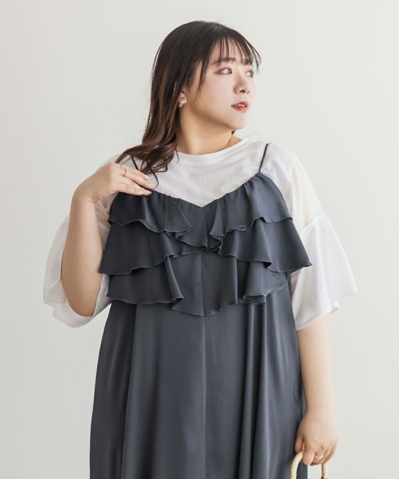 3Lを着て丁度いいサイズでした。胸元のラッフルデザインがかわいく、顔回りをすっきりさせてくれる効果も◎全体的にすっきりした縦のシルエットで着用出来るので、華奢な印象です♪さらりとした艶感のある生地が今っぽくて一気にトレンドコーデに!大人っぽい印象になれちゃう1枚でデートや旅行におすすめのワンピースです!