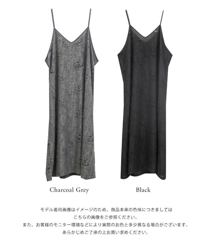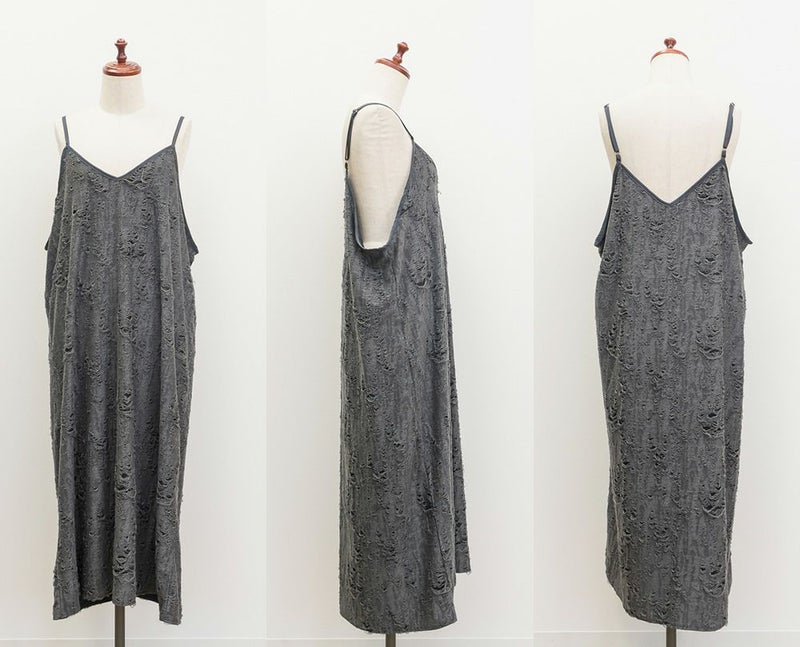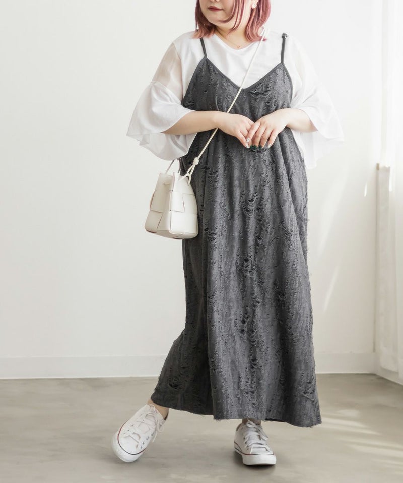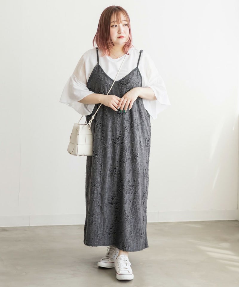 3Lサイズを着用して、ゆとりのあるサイズ感でした!肩紐は調整可能なので、自分の身長や好みに合わせて着丈を微調整できるのがうれしいポイント♪Aラインに広がるシルエットで、足さばきがよく、見た目にも軽やかです◎ダメージカットデザインがアクセントになっていて、シンプルながらもお洒落感のある着こなしが楽しめます♪インナー次第で着回せるので、季節問わず活躍しそうです◎ウエスト周りも締め付け感がなく、リラックスして着られました!今っぽい加工感のある生地がかわいく、簡単にいトレンドコーデが完成します!