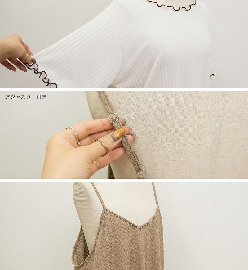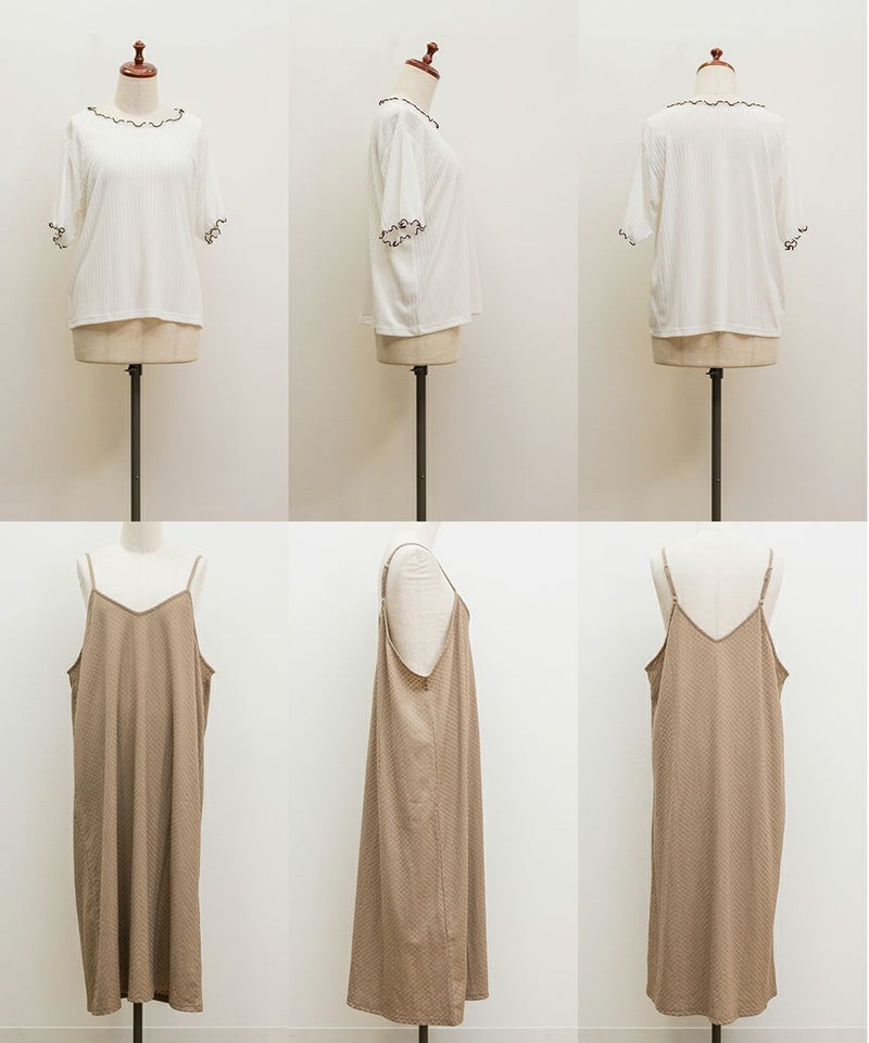 3Lサイズを着用してゆとりのある着心地でした。インナーは伸縮性がある柔らかい生地なので着脱も問題なく、楽な着心地でした◎インナーとワンピースがセットになっていて、コーデいらずでかわいく着こなせます♪それぞれ単品で着回しができるので、1セットあるとたくさん着回しができちゃいます!
