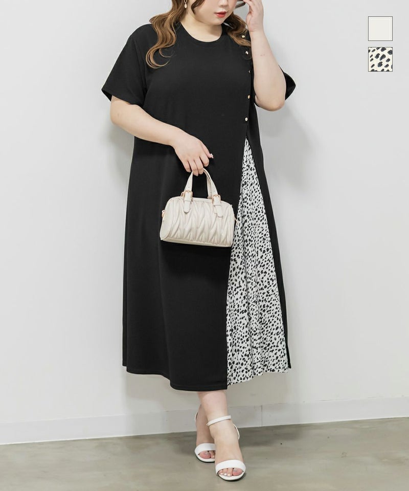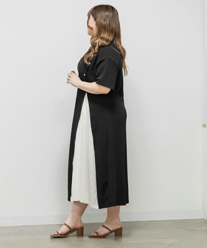 3Lを着て、ちょうどいい着心地でした。らくちんなシルエットながら、プリーツ切替やボタンデザインでしっかり抜け感もある1枚です♪1枚でサマになるワンピースなので、小物を変えるだけでオン・オフどちらにも使えそうです!