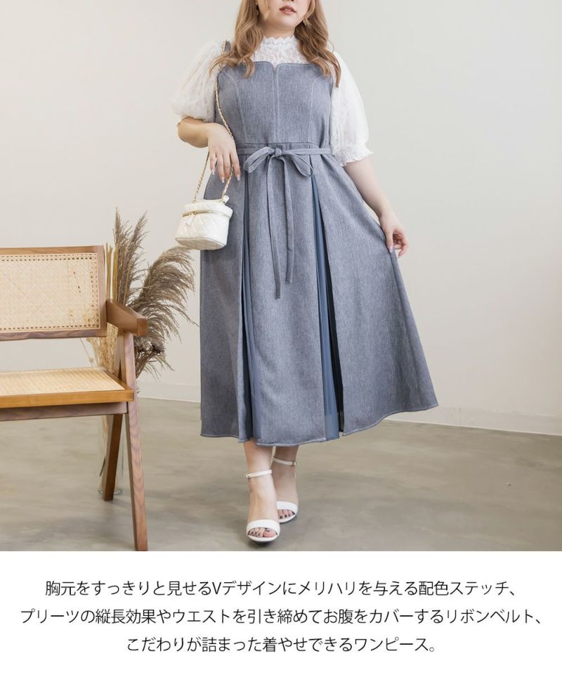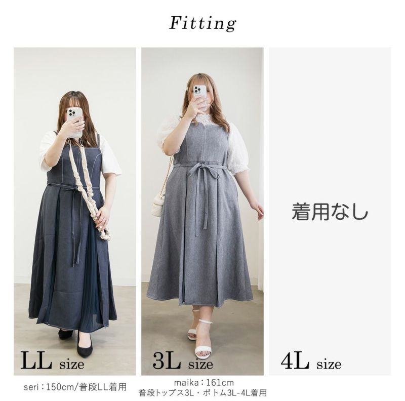 3Lを着てちょうどいいサイズでした。フィット&フレアシルエットで、配色ステッチやウエストリボン、プリーツ切替の縦長効果で着やせ効果の高いデザインです!着心地も窮屈感はまりません◎プリーツは動くと見えるような感じで、派手にならずにアクセントになっています。胸元のV切替もさりげないけど可愛いです♪