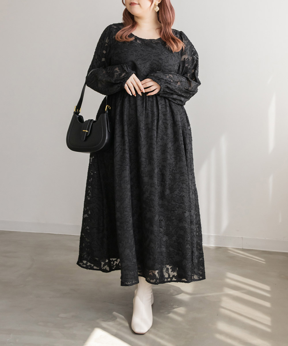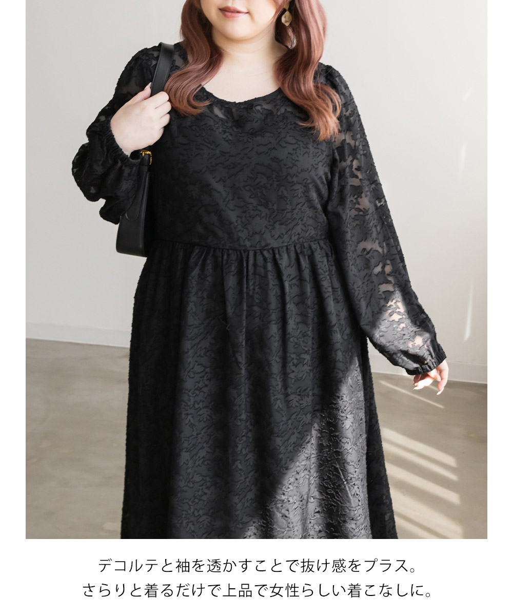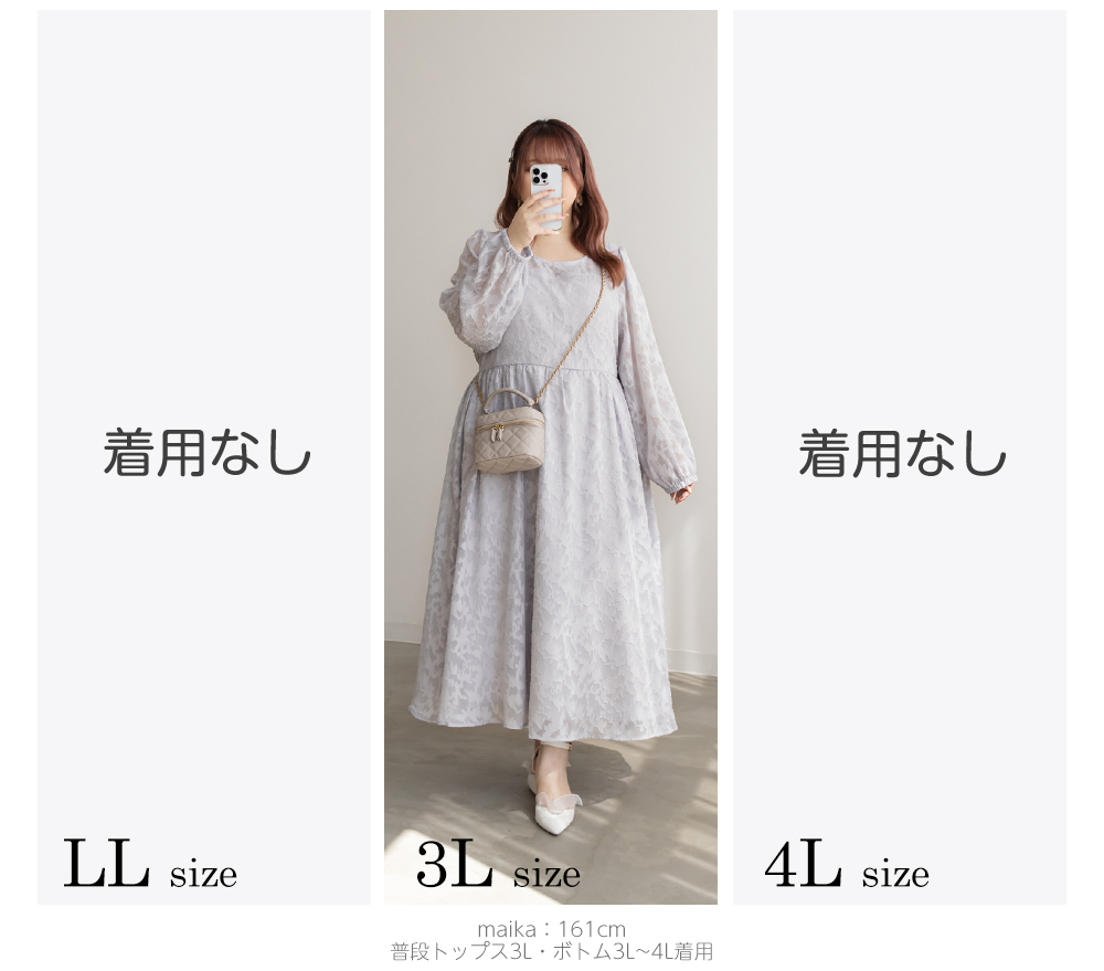 3Lを着てちょうどいいサイズでした!シンプルなデザインだけど透け感のある花柄調の生地が可愛くて大人っぽく着ることができます。デコルテから袖が透け感があるデザインで女性らしいです。春夏も使えますが、秋冬にはこの上にさらっとカーディガンを羽織ったりしてレイヤードするのもお勧めです!かさばらないすっきりとしたデザインだから、ビスチェを上に合わせたりするのもトレンド感があって可愛いです◎上品な印象なので、二次会など、ちょっと綺麗めなシーンにも使えちゃいます!
