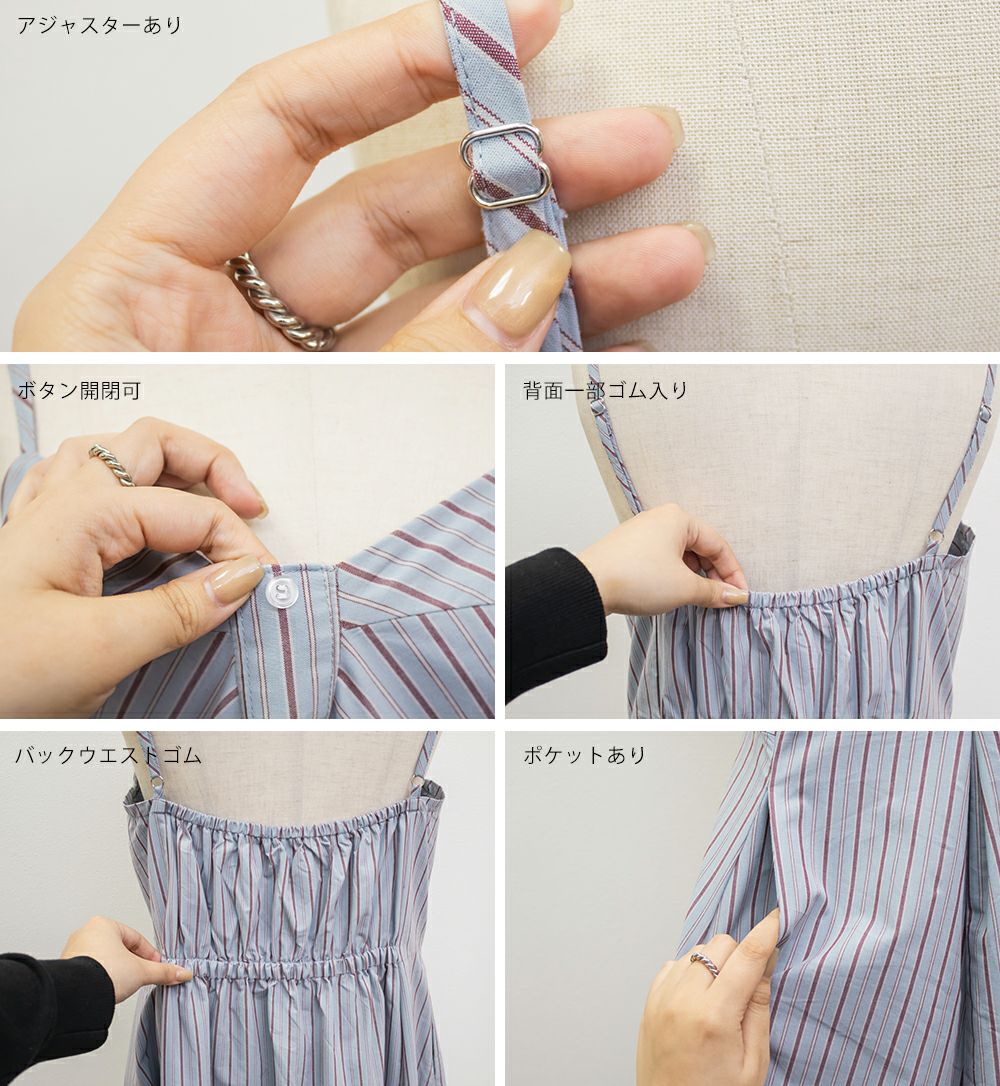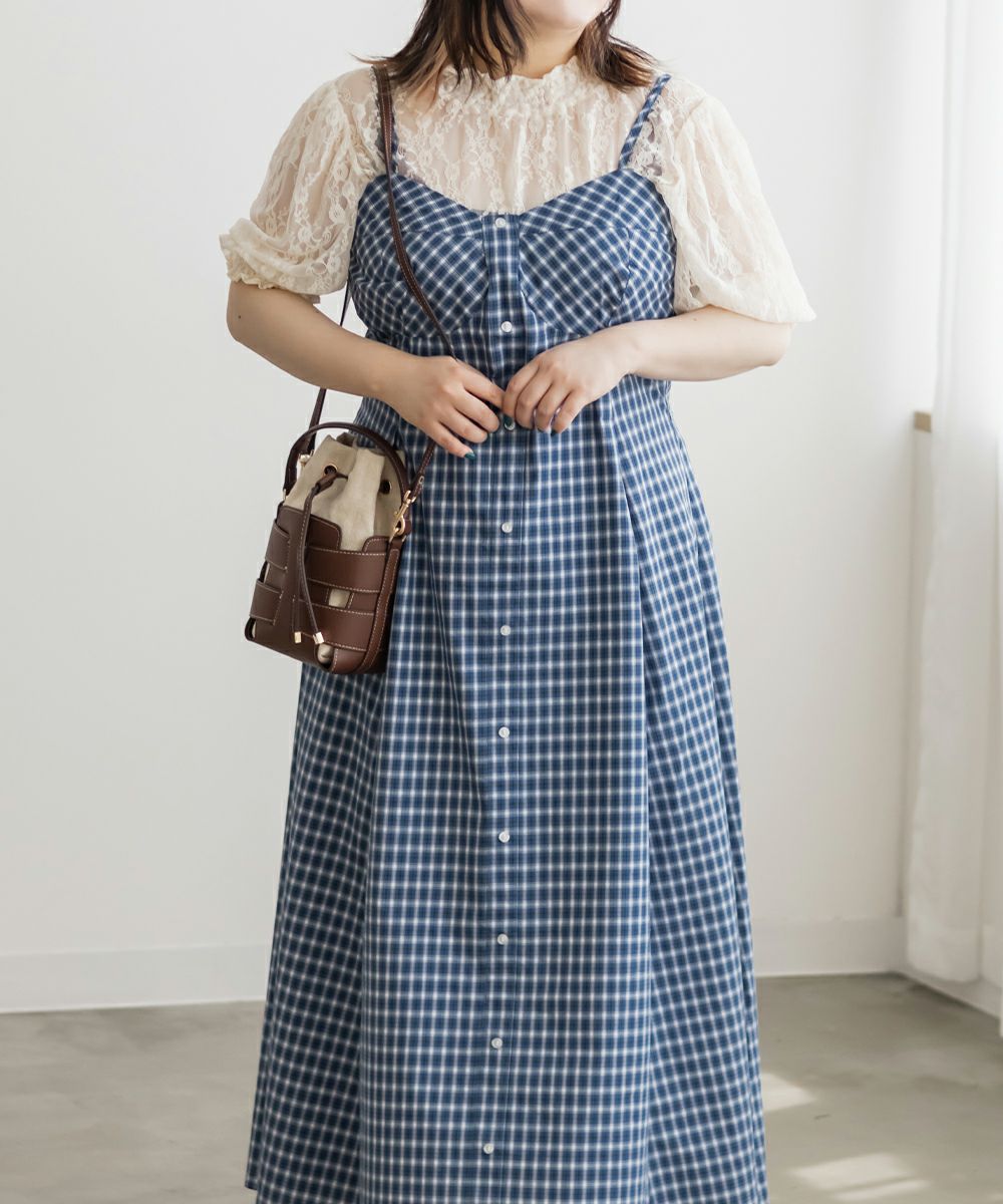 LLサイズを着用しましたが、着心地はちょうどよく、程よく身体のラインを拾わず安心感のあるサイズ感でした◎肩ひもはアジャスター付きで長さ調整できるので、低身長さんでもバランス良く着こなせるのが嬉しいポイント♪ウエストは自然にくびれて見える構築的なディティールでスタイルアップ見えも叶いました!フロントのボタンデザインが縦ラインを強調してくれるから、キャミワンピでも大人っぽく仕上がります。コルセットっぽい胸元のデザインが今っぽく、大人フェミニンに着こなせます♪トレンド感のあるストライプとチェックの展開で、あわせるアイテムによってカジュアルにもガーリーにもなれちゃいます!インナーを変えれば季節を問わず着回せる万能アイテムです♪