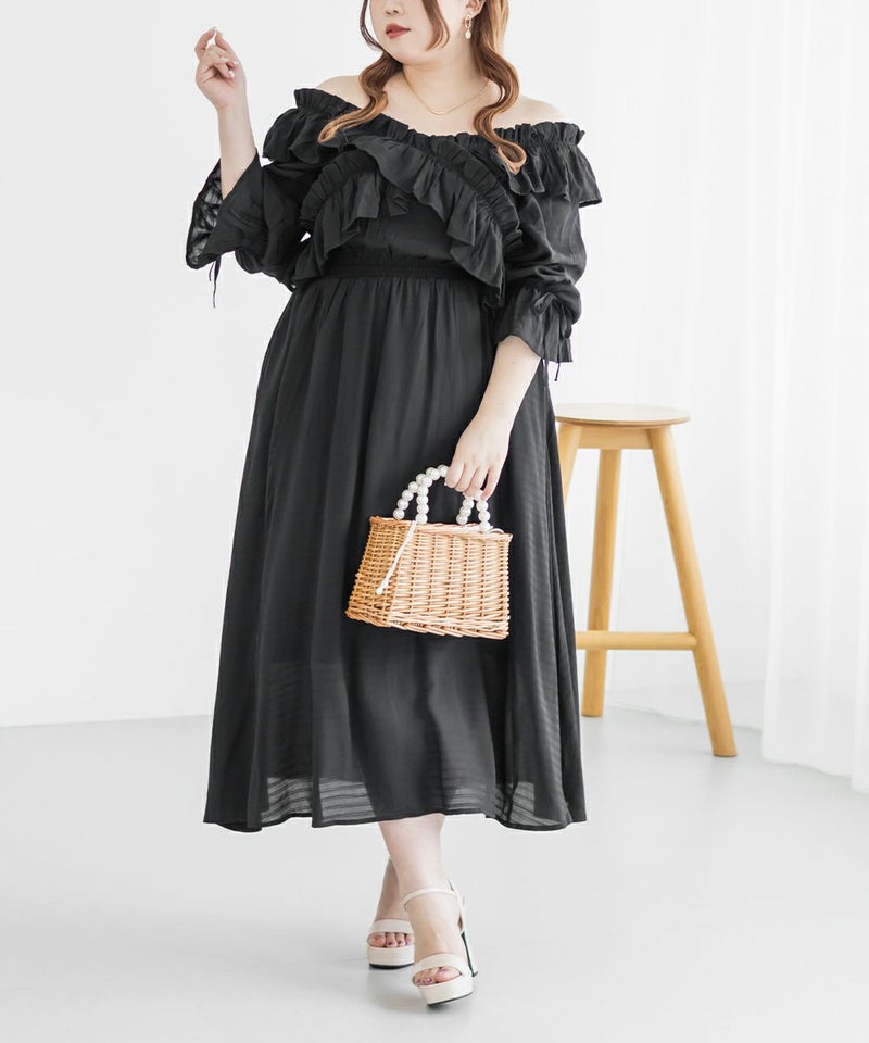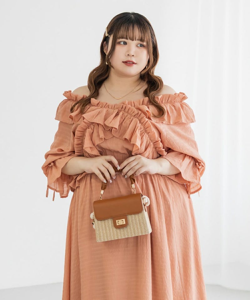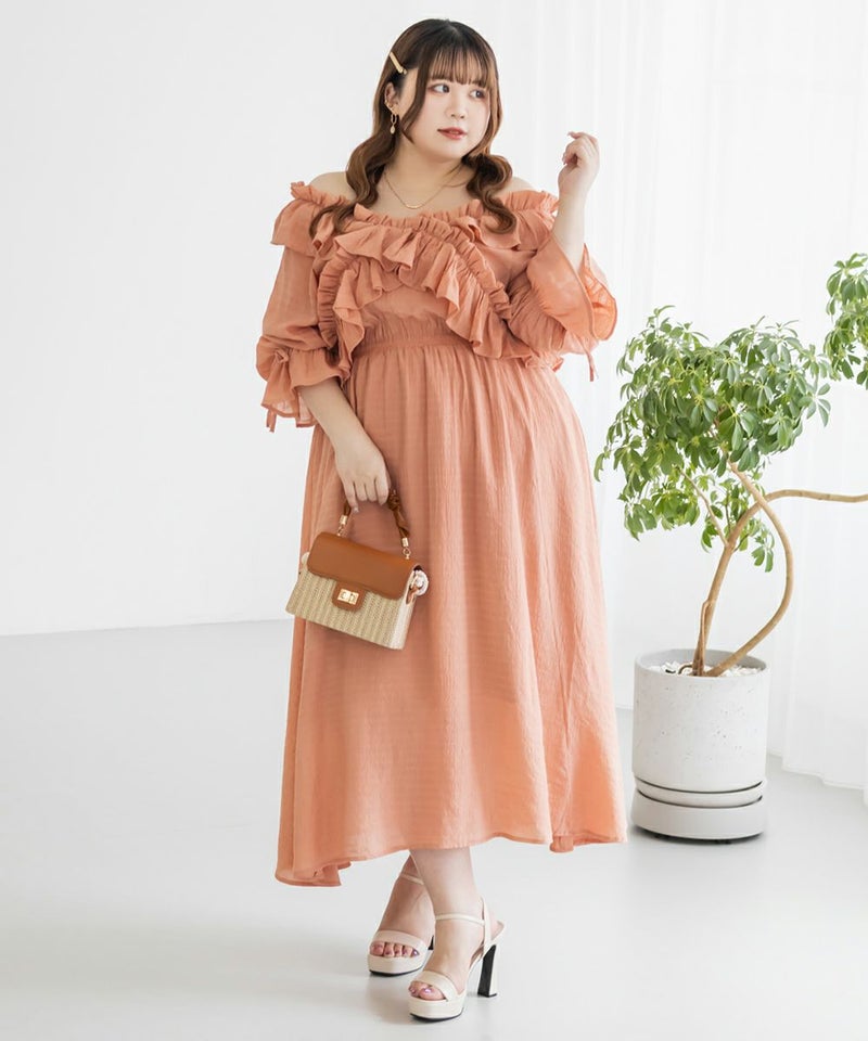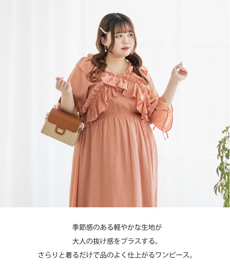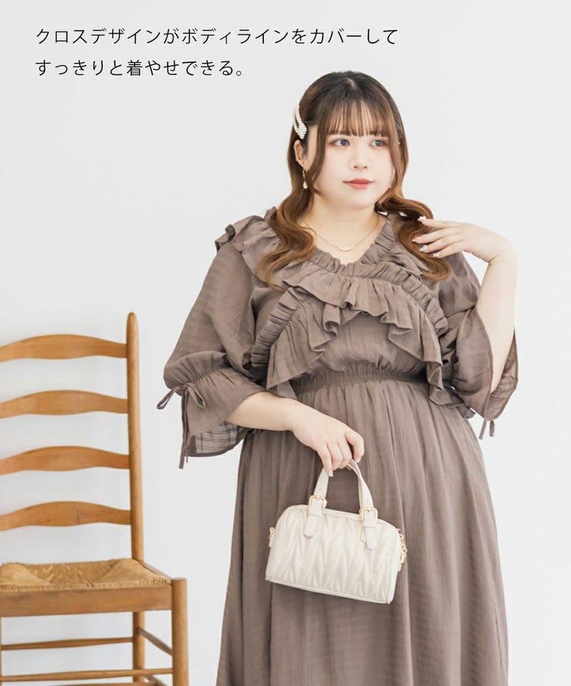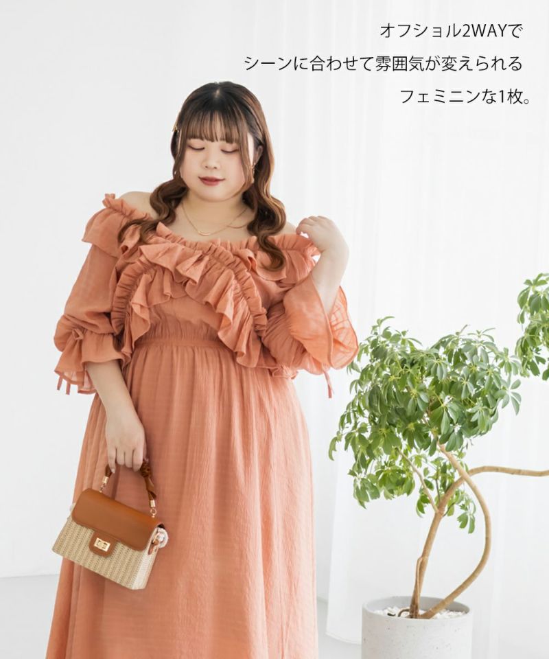 3Lサイズを着用しました。肩まわりやバストにも窮屈感がなく、全体的にちょうどいい着心地です♪ クロスデザインのフリルが顔まわりを華やかに見せてくれて、1枚でおしゃれ映えが叶います◎オフショルとしても着られる2WAY仕様で、気分に合わせて雰囲気を変えられるのも魅力。ウエスト位置が高めに設定されているので、足長効果もバッチリでスタイルアップが叶いました!軽やかな素材感で夏にぴったりな1着です。