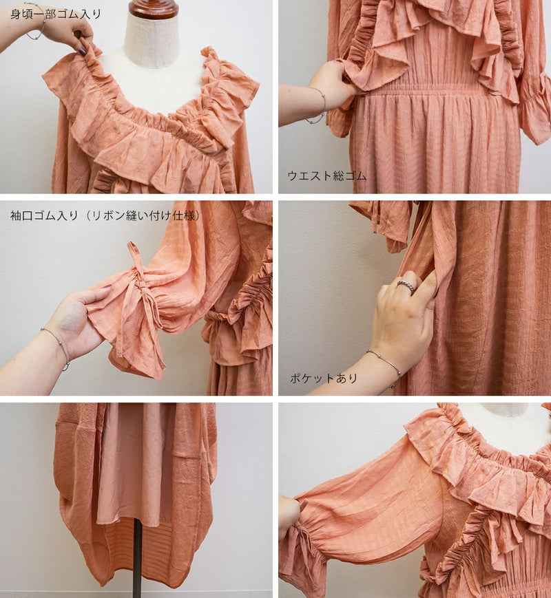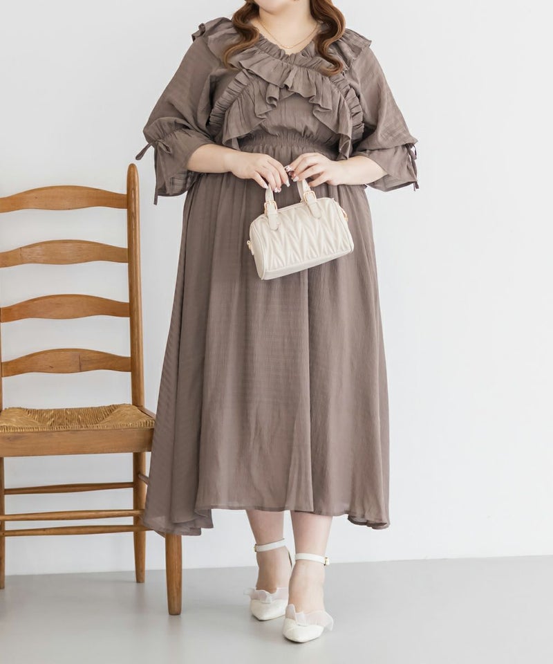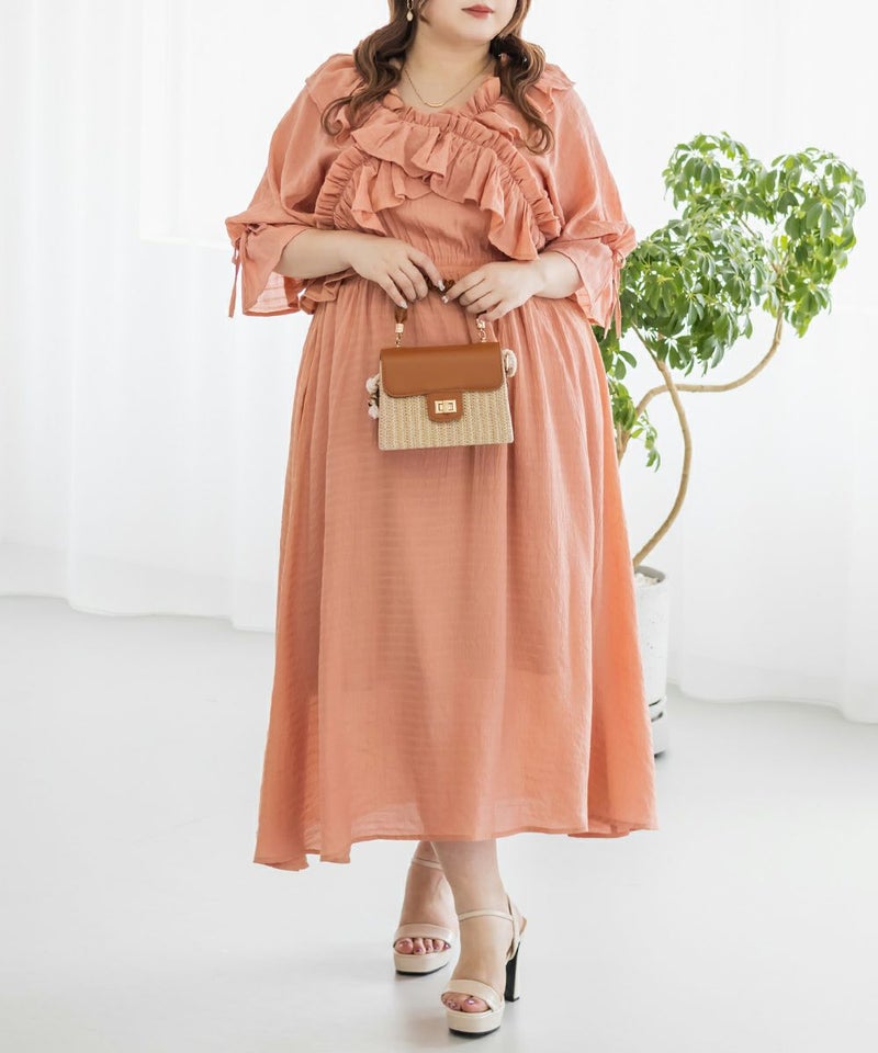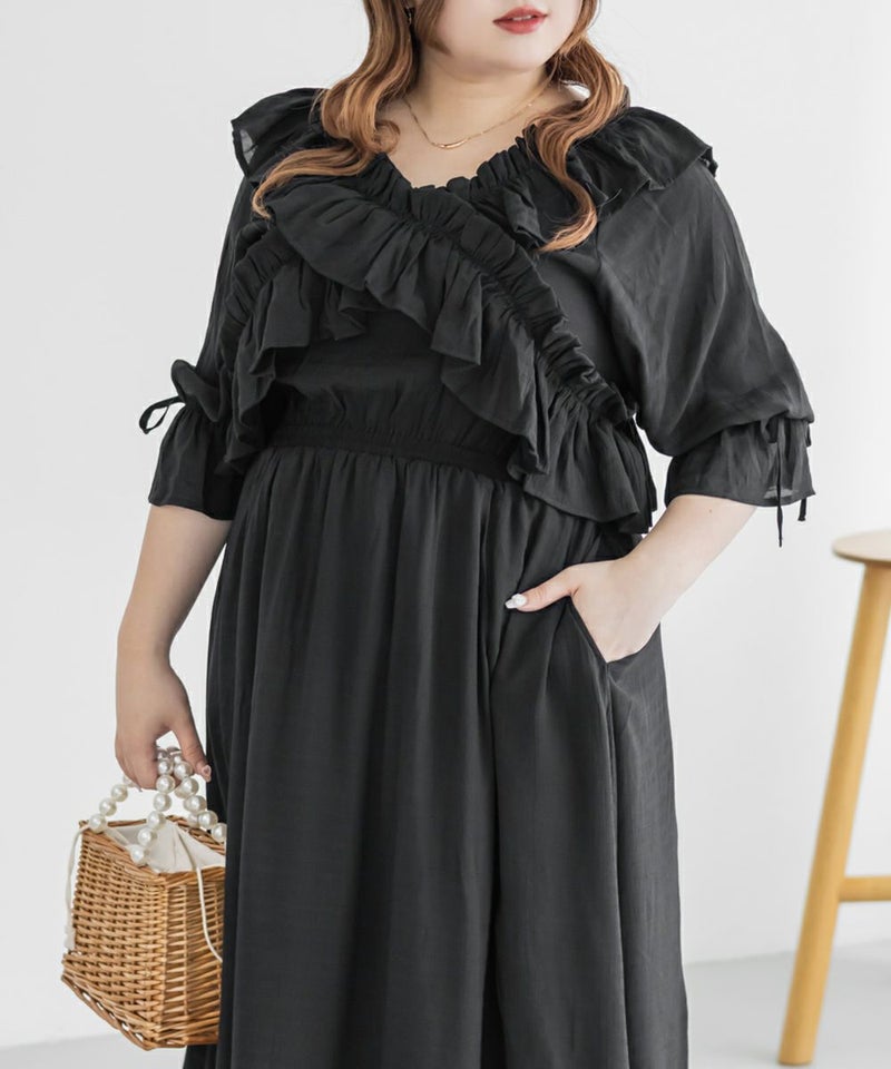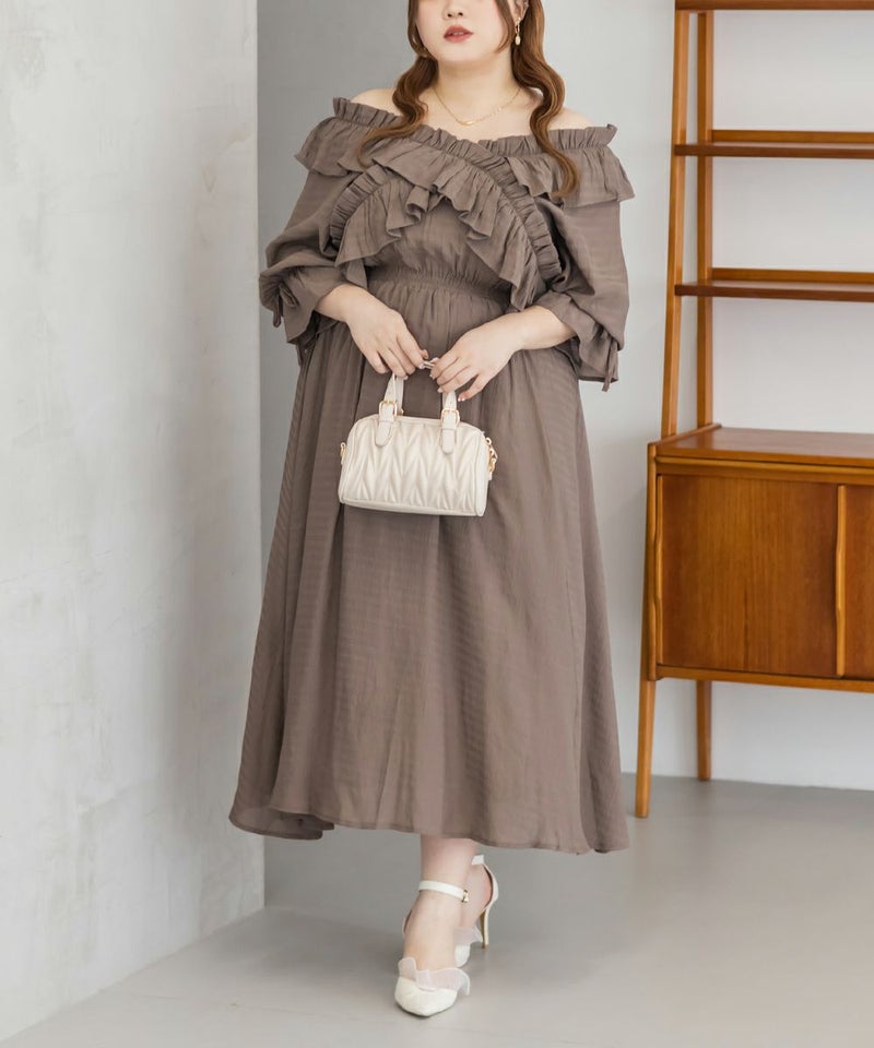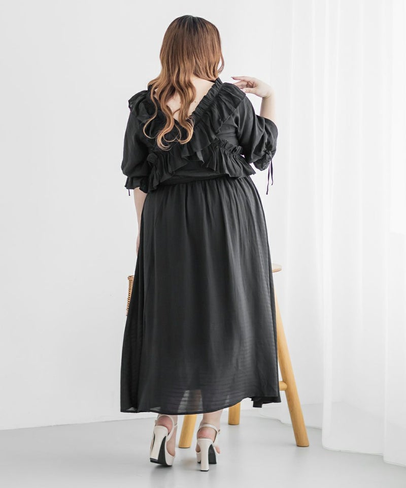 3Lサイズを着用しました。肩まわりやバストにも窮屈感がなく、全体的にちょうどいい着心地です♪ クロスデザインのフリルが顔まわりを華やかに見せてくれて、1枚でおしゃれ映えが叶います◎オフショルとしても着られる2WAY仕様で、気分に合わせて雰囲気を変えられるのも魅力。ウエスト位置が高めに設定されているので、足長効果もバッチリでスタイルアップが叶いました!軽やかな素材感で夏にぴったりな1着です。