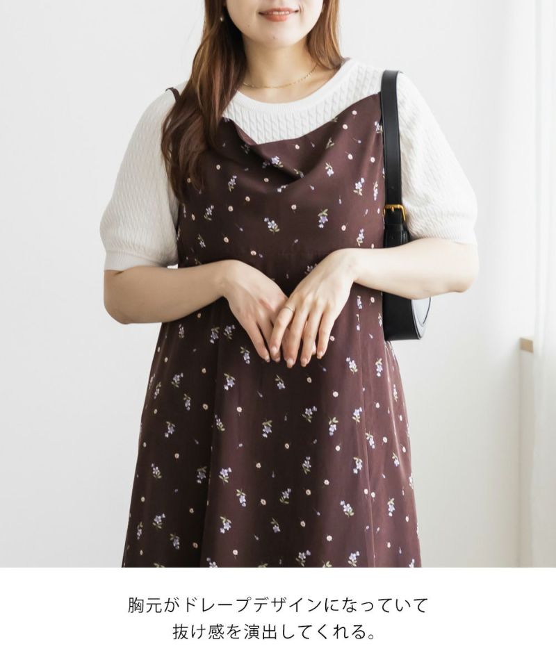 3Lサイズを着用して、ウエストやヒップまわりまでゆとりがあり、背中とウエストは紐で調節するので、自分好みのサイズ感で着用出来ました。ゴムが入っていないので、心配な方はサイズ確認をお勧めします!すっきりしたシルエットだけどパネル切替でラインを拾わずリラクシーな着心地でした◎胸元と背中はのドレープデザインになっていて女性らしい印象で、繊細な花柄と相まって、着るだけで華やか見えが叶います♪肩紐はアジャスター付きで調節可能なので、インナーや合わせるトップスによってバランスが取りやすく、好みの着丈に合わせやすいのも嬉しいポイント。裏地付きで透け感も気にならず、1枚でさらっと着られるのも◎Tシャツやシアートップスとレイヤードして、春夏らしい軽やかなスタイリングがおすすめ!ロングシーズン着回しできるのも嬉しいです。
