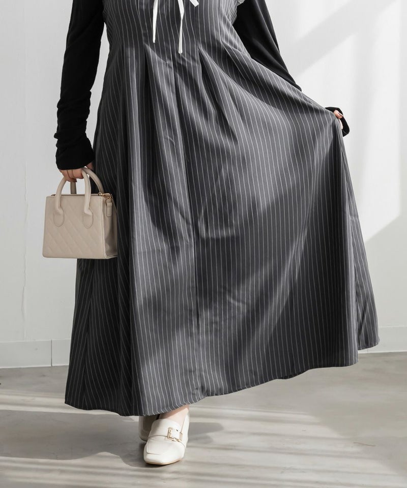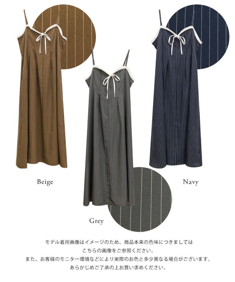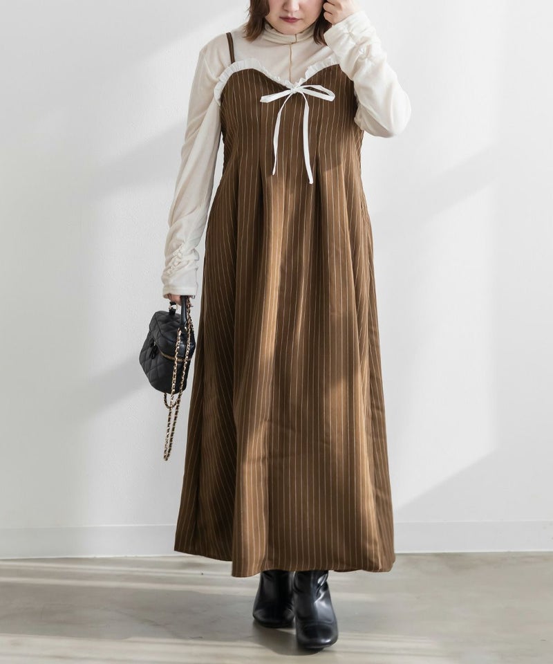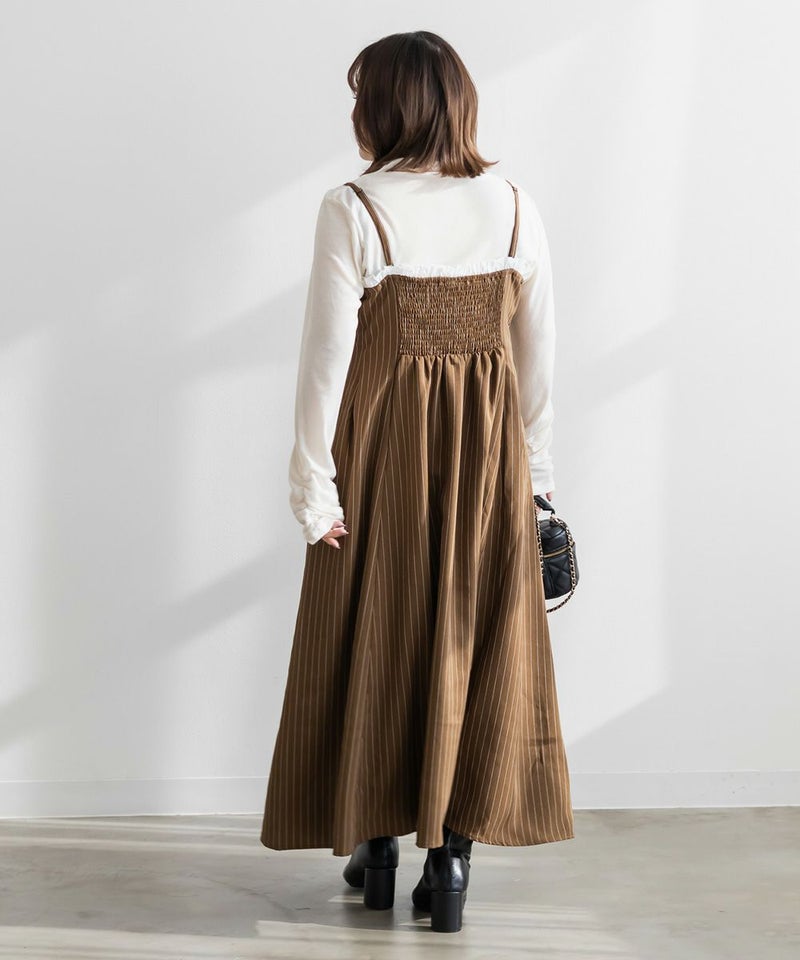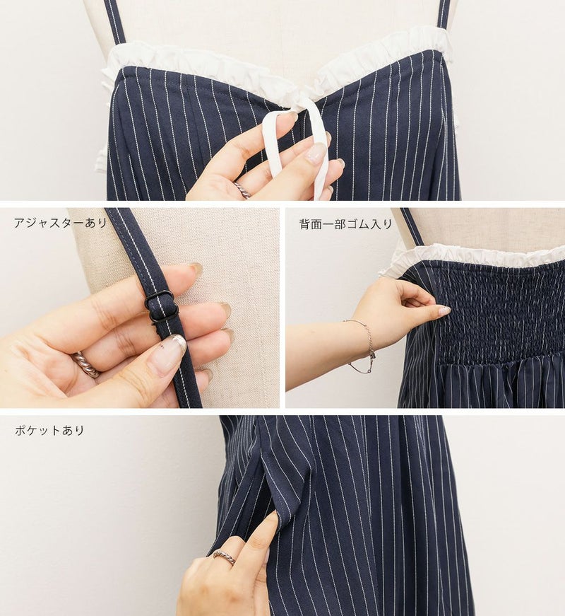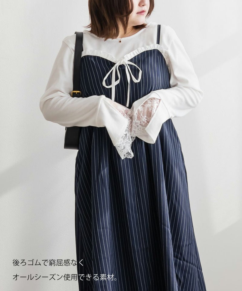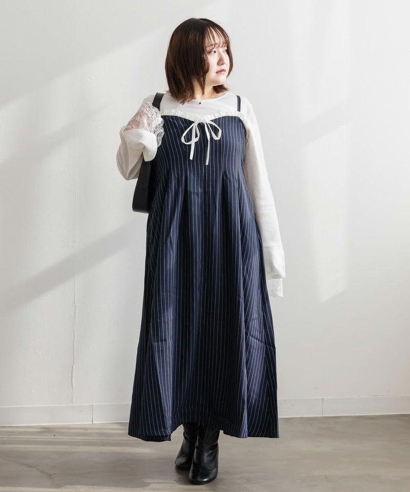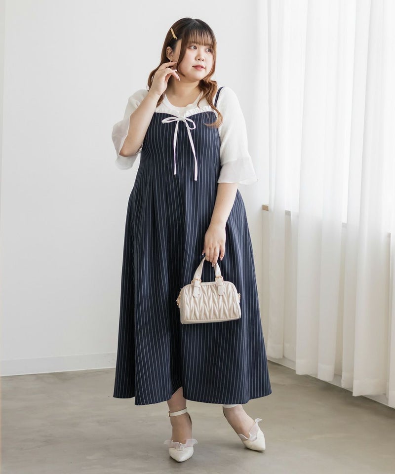 3Lを着て、見頃なども丁度良くすっきり綺麗に着用出来ました。後ろはゴムなので、フィット感がありながら窮屈感はなかったです!ウエスト部分にタックがたっぷり入っていてお腹周りもすっきりカバーしてくれます!すらっとしたシルエットながら、しっかりボディラインをカバーしてくれるディティールでした。ストライプ×リボン×フリルのときめき要素が詰まったキャミワンピで、アジャスター付きで肩紐の長さを調整できるので、バスト位置もちょうどよく着られました。Tシャツやブラウスを合わせて甘めに、シンプルなトップスでカジュアルに、着回し力も抜群の一枚です◎