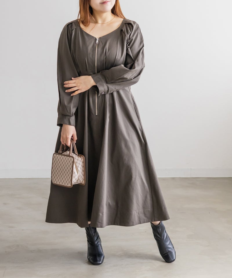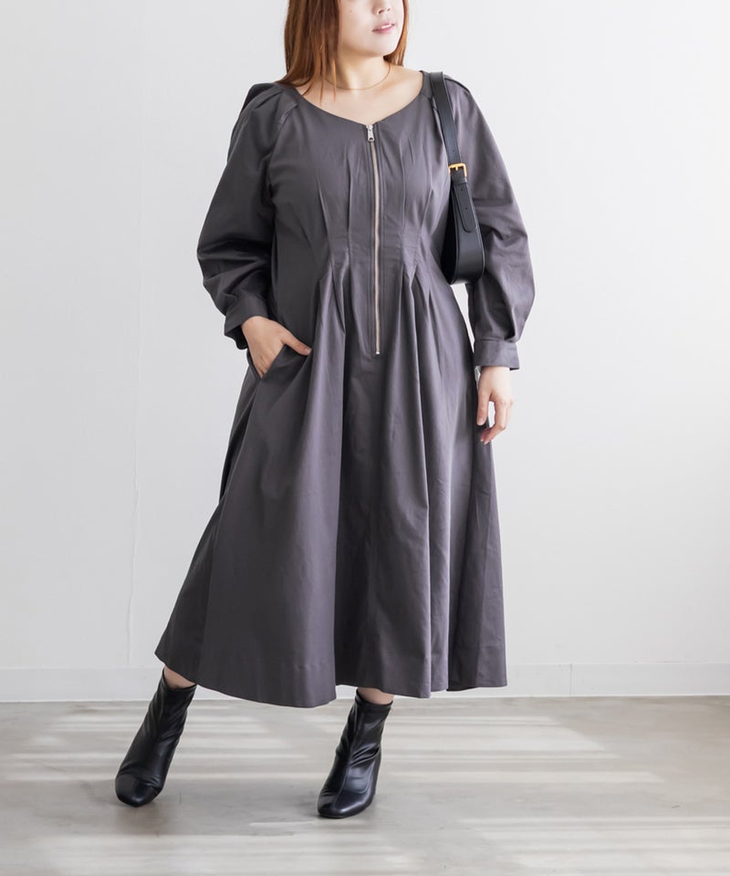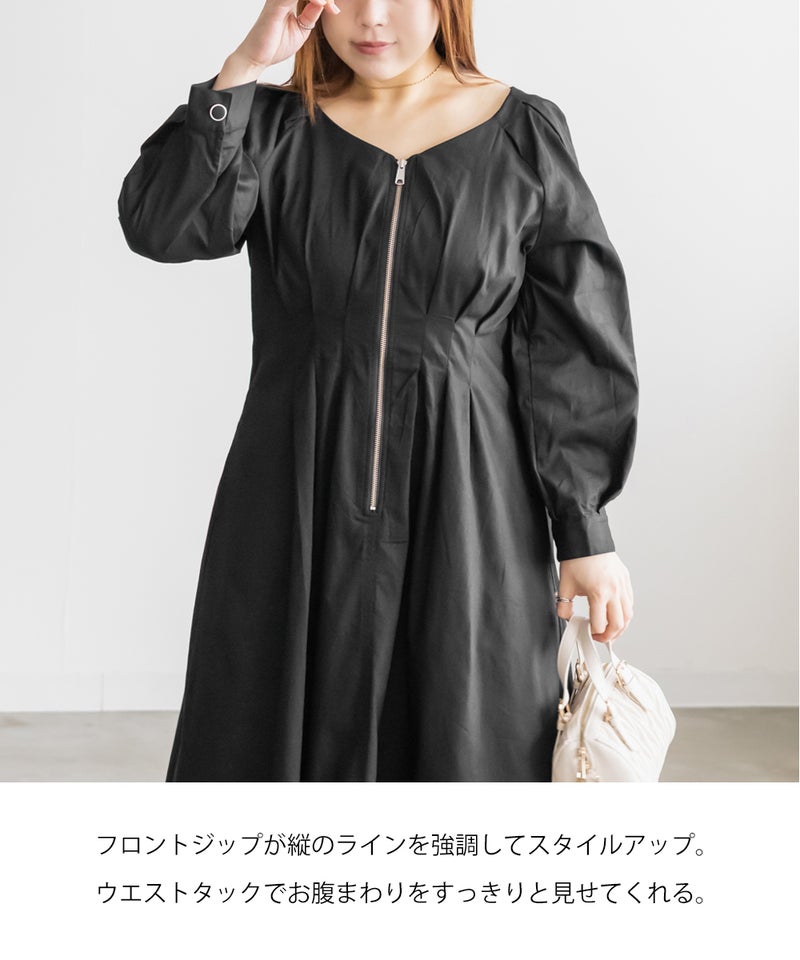 3Lサイズを着てちょうどよく楽な着心地でした!程よくハリのある生地なのでボディラインを拾わないのが嬉しいです♪ウエストにタックが入っていて、フィット&フレアシルエットになって女性らしいシルエットで着られます。ブーツやスニーカー、小物使いを変えるだけで違った印象に変化できます。フロントジップなのでメリハリが付いて、すっきりとした印象です。シンプルながら季節感もあってデザインなので、お出かけやデートにもおすすめです!