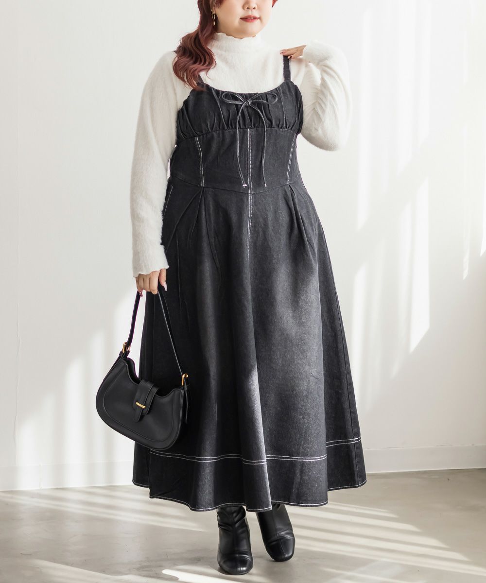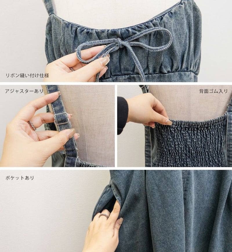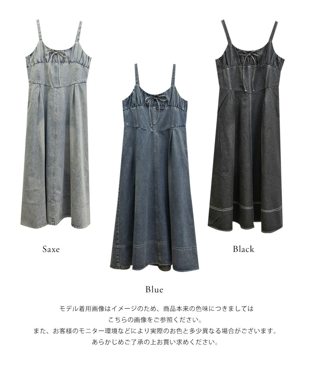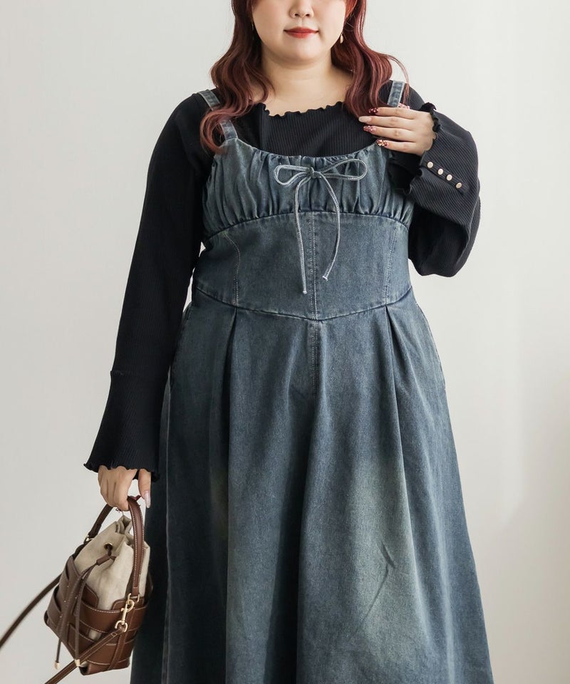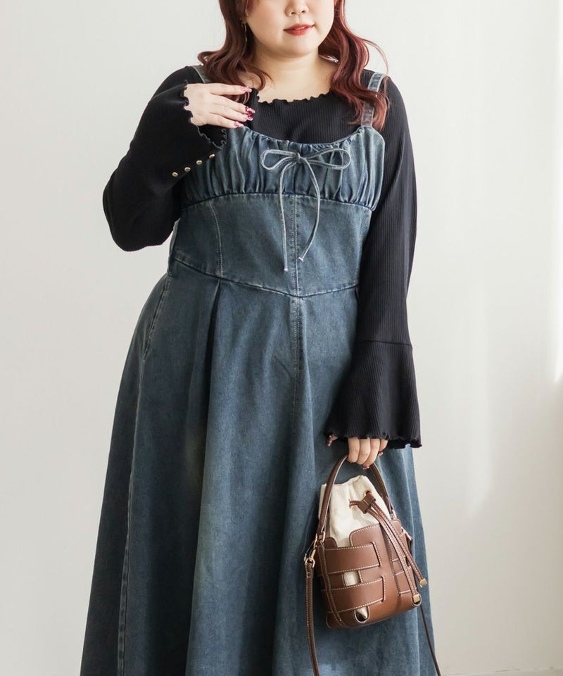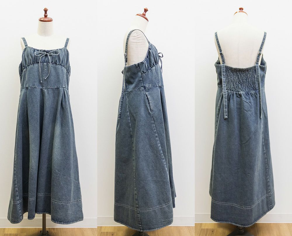 ギャザー入りののビスチェ風デザインが美しいシルエットを演出する、カジュアルになりすぎない女性らしいデニムワンピース。バストを小さく見せる胸元切替と下腹をカバーするウエストタックが綺麗なボディメイクを実現。たっぷりとフレアに広がる裾でレディな印象に。
