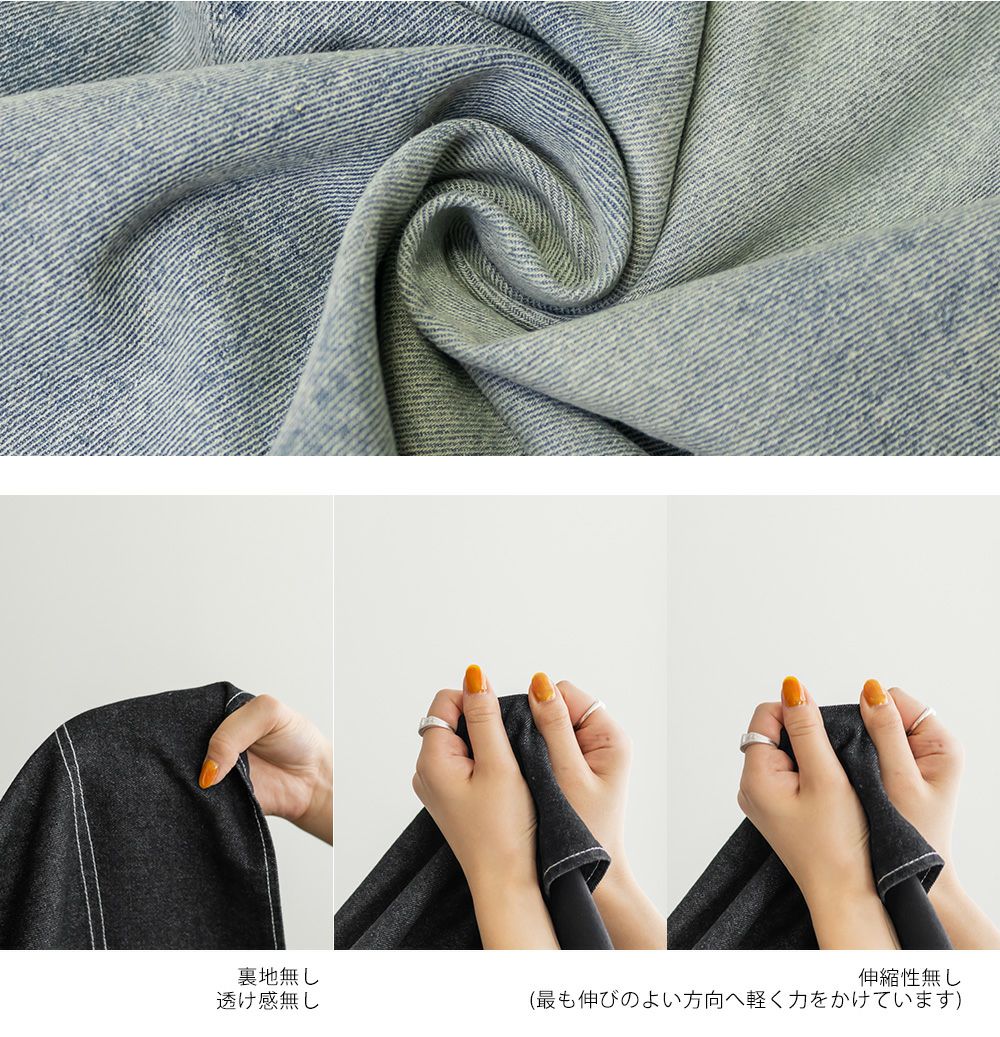 ボディラインを拾いづらい程よくしっかりとしたデニム生地。デニム生地ならではのハリ感が美しいフレアシルエットを作ってくれる。サックスとブルーはヴィンテージ調の洗い加工が今っぽい。ブラックは上品にまとまるので大人っぽく着こなしたい方におすすめ。