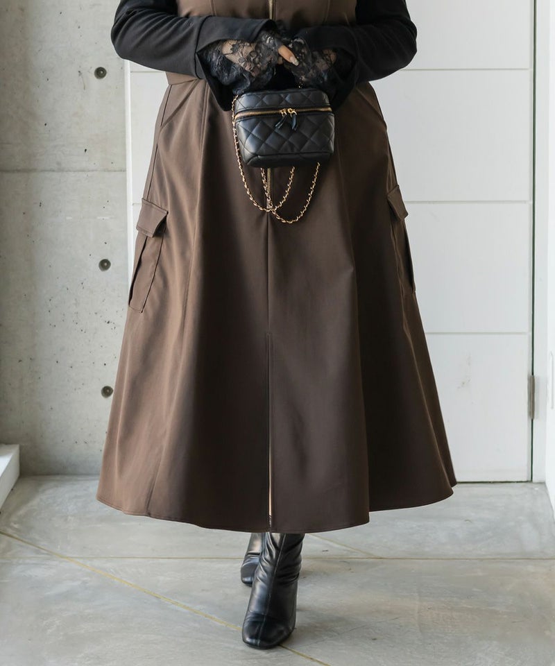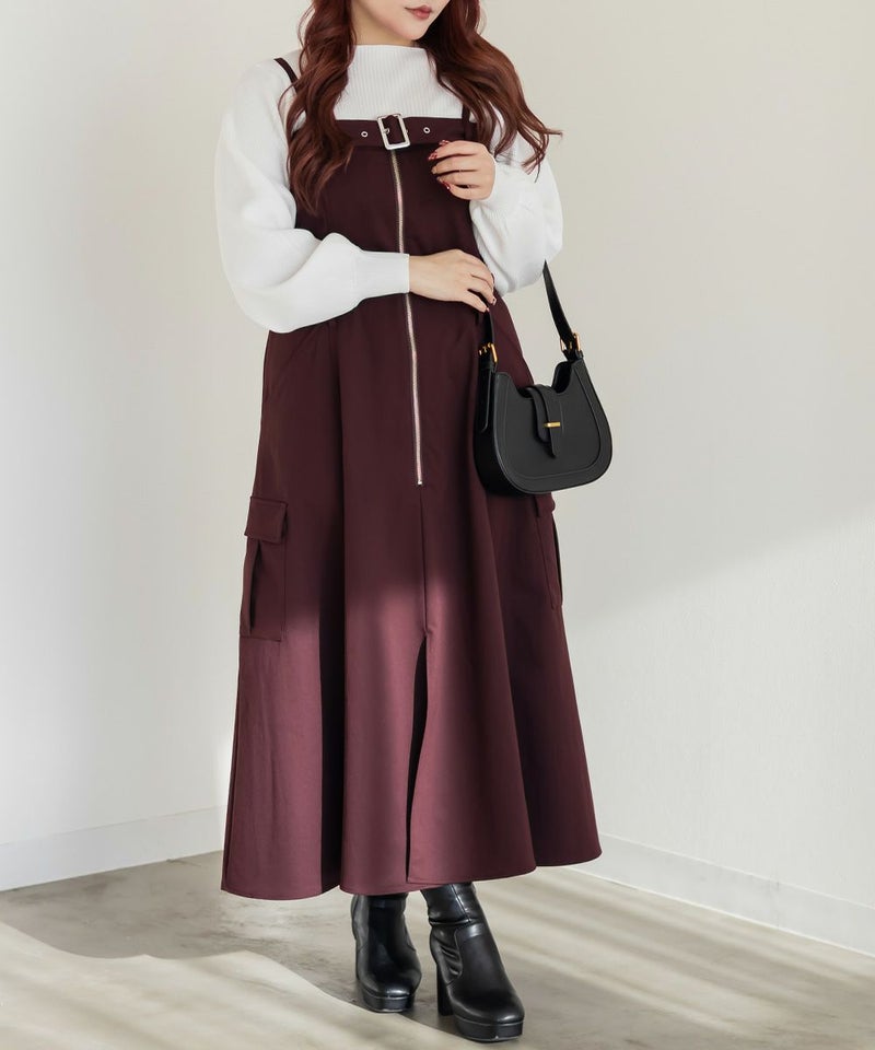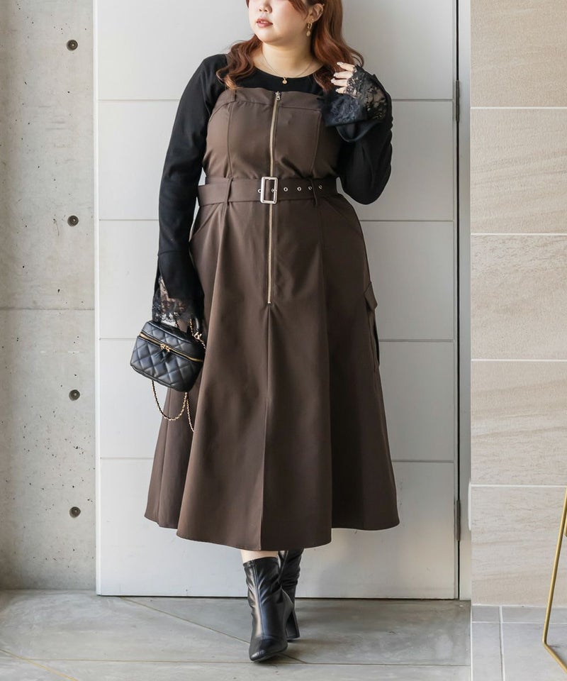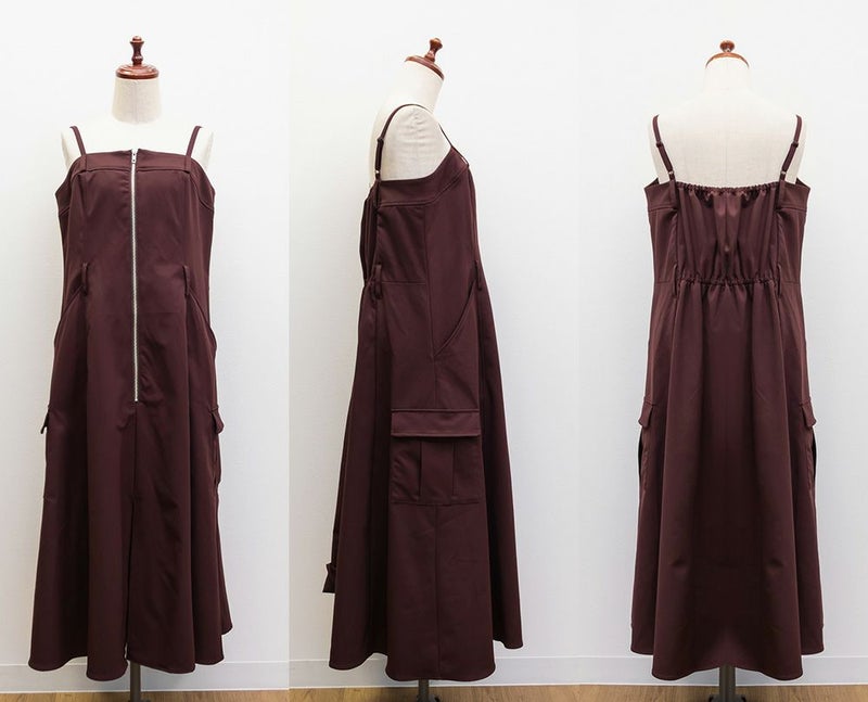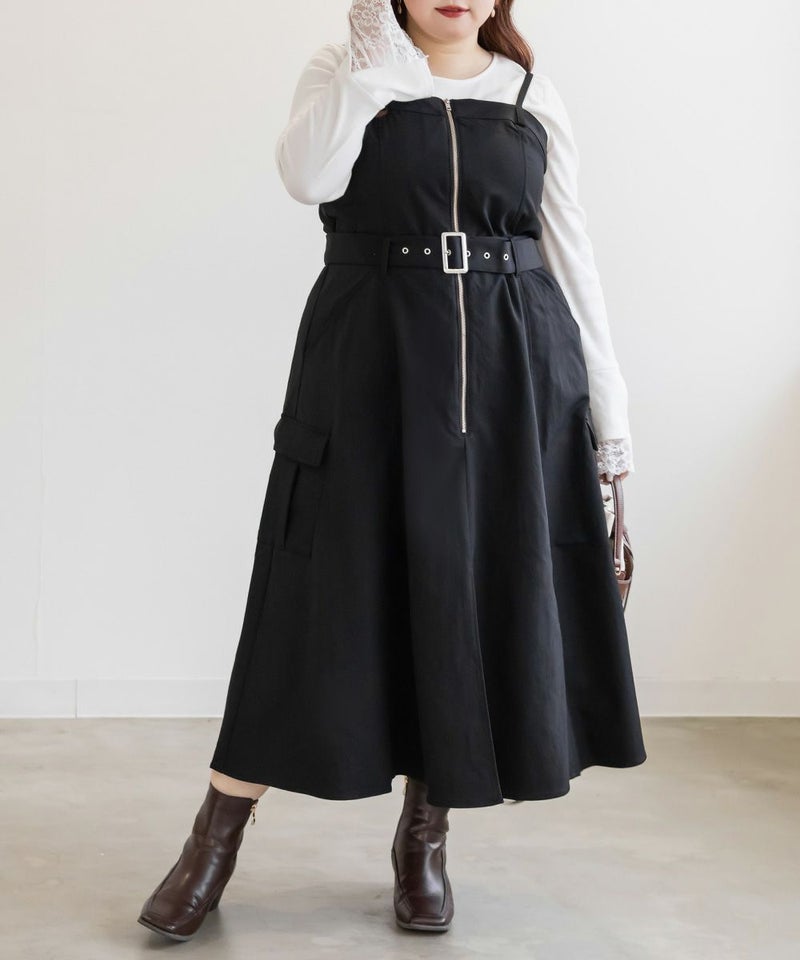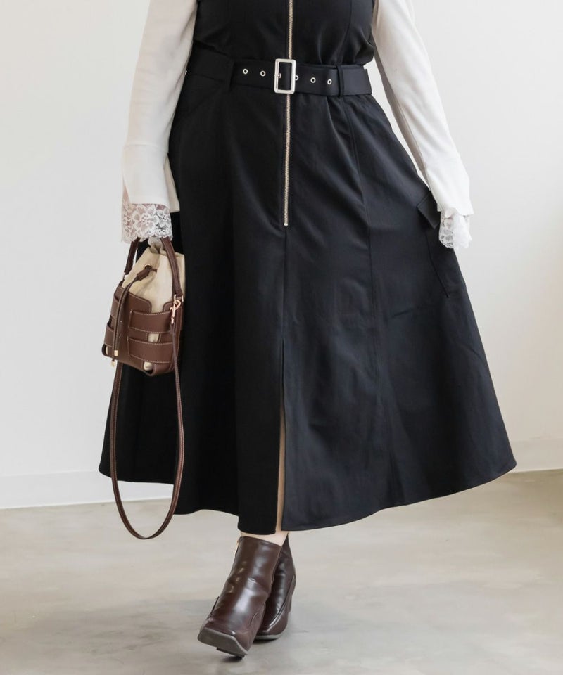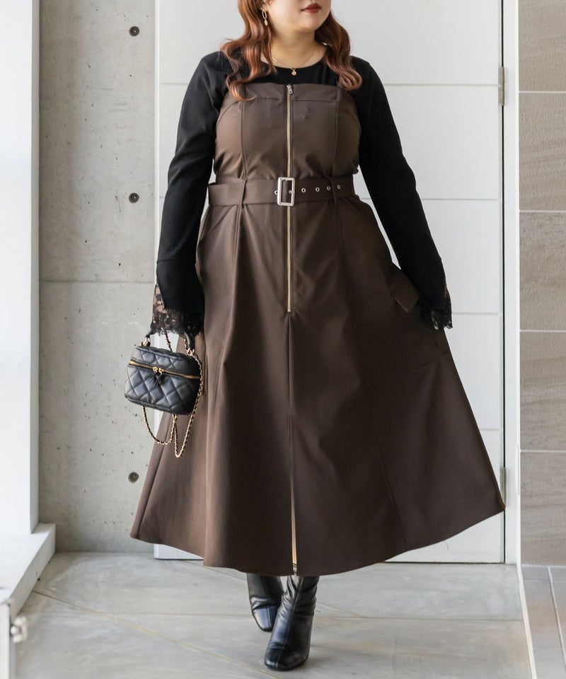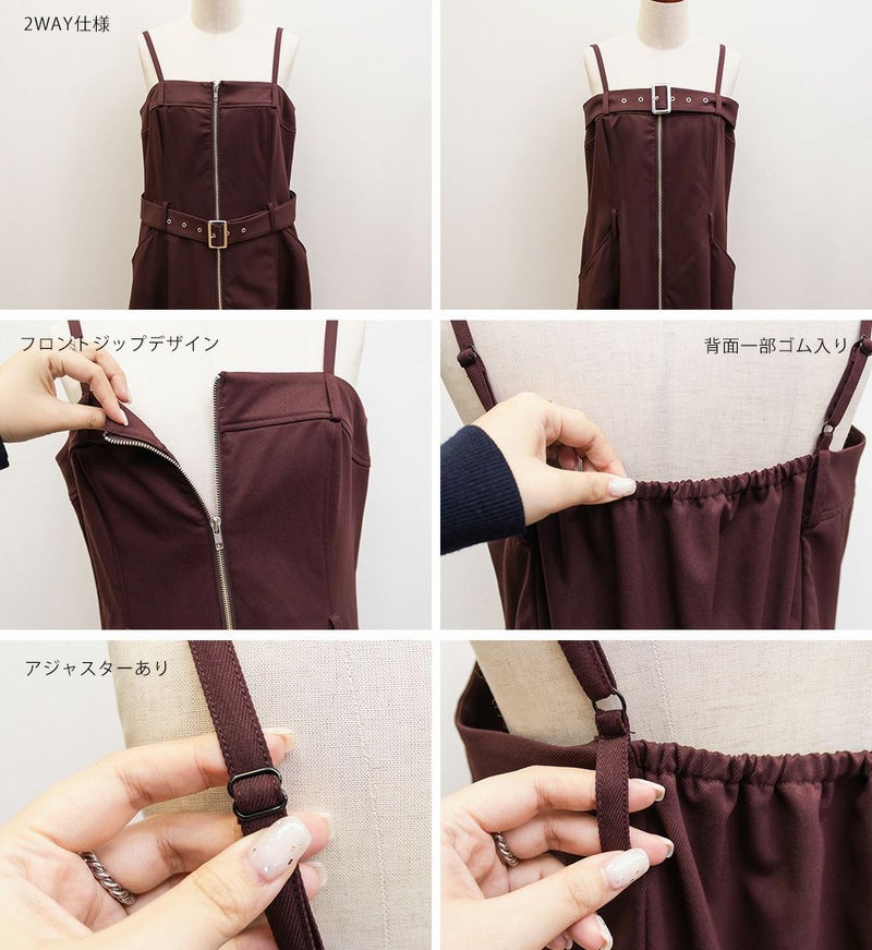 【design】胸元/ウエストどちらにもベルトをまける2WAYデザイン。ベルトの位置を変えるだけで全く違ったシルエットと表情に変化できるワンピース。ベルト・ジップデザイン・サイドポケットがメリハリを与えてすっきりと着やせできる。【material】しっかりとしたハリ感のあるツイル織の布帛生地。ボディラインを拾いづらく、季節問わず着用可能な素材。【styling】甘くなり過ぎないデザイン性の高いワンピースだから、インナーにはシンプルなデザインがおすすめ。夏はTシャツ冬はベーシックなハイネックニットなど、オールシーズン着回し可能。スニーカーなどカジュアルシューズはもちろん、大人の女性らしさがプラスされるショートブーツと合わせもおすすめです。