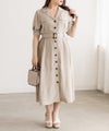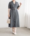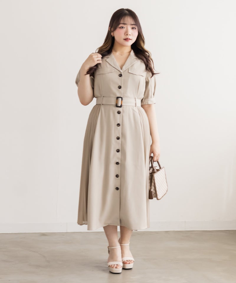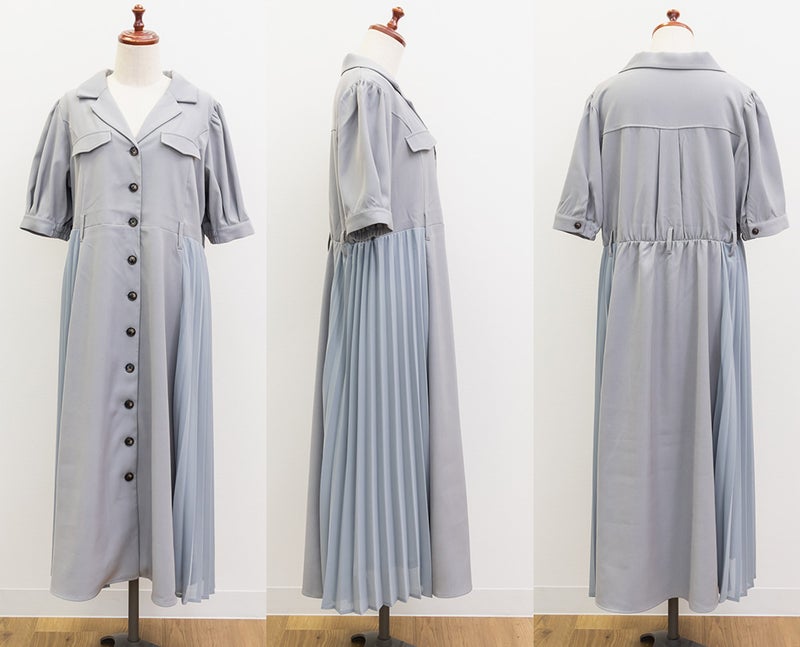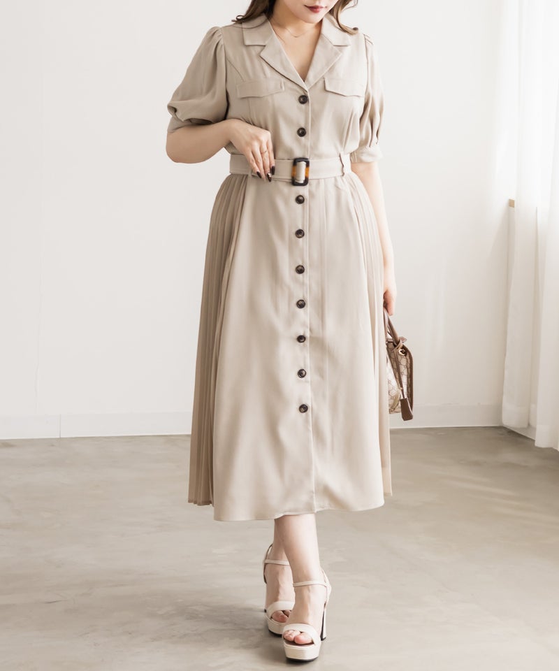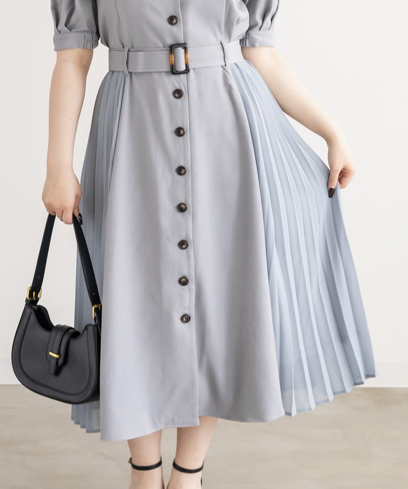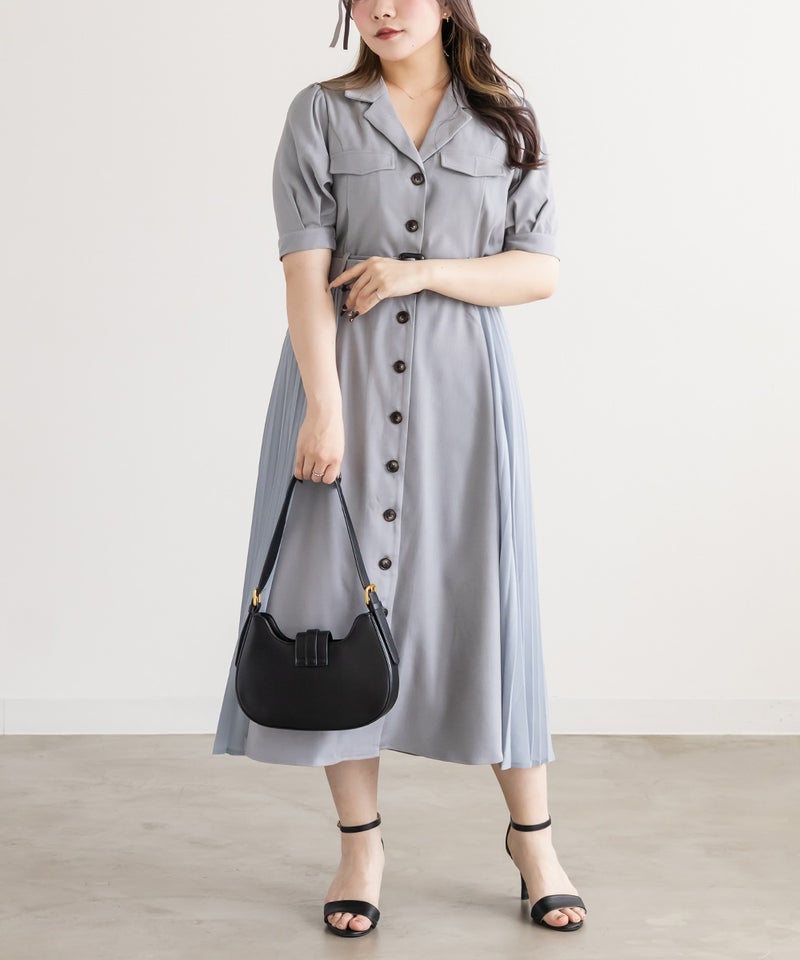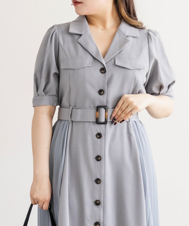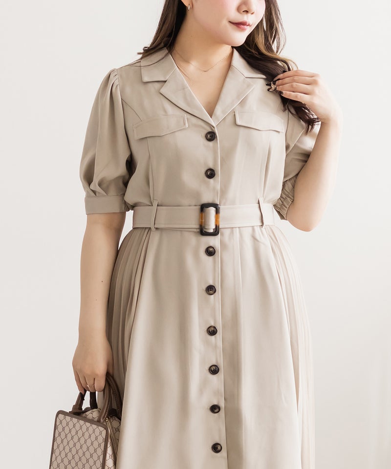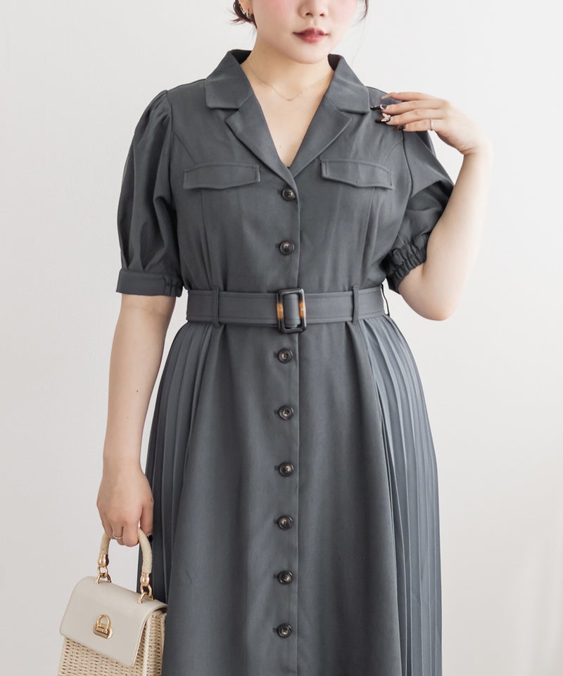 着映えできる華やかさと着やせできるポイントの両方を持ったフェミニンなワンピース。顔回りをシャープにする開襟、縦線のメリハリをプラスする配色ボタン、横幅を削るように施されたサイドプリーツで視覚的着やせが叶う。ウエストベルトでくびれを強調できるのもこだわりポイント。