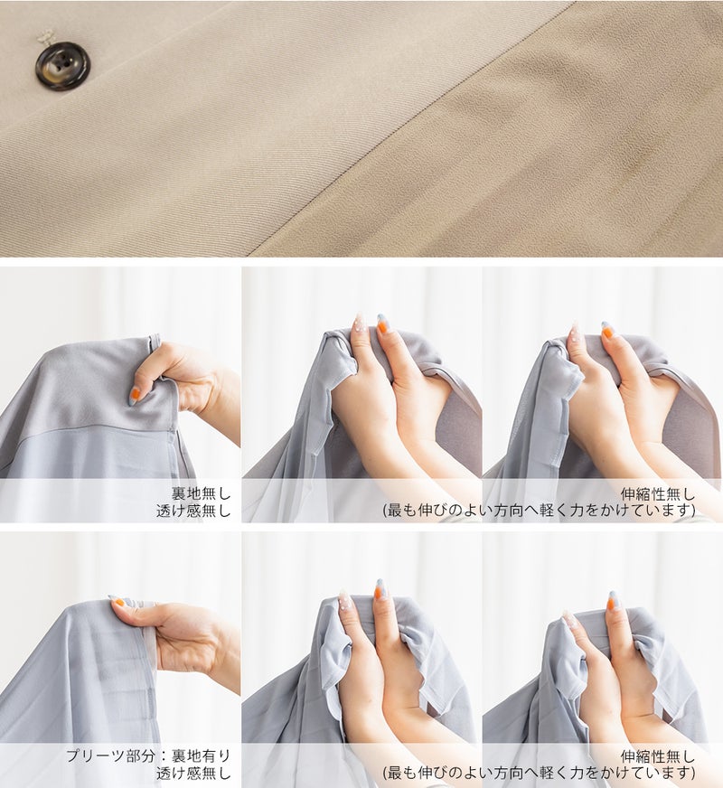 本体素材は程よくしっかりとしたツイル生地、サイドプリーツにはやや透け感のあるジョーゼット素材を使用。ジョーゼット部分には裏地を施して透けない仕様に。ボタン・ベルトバックルはべっ甲調の素材を使って上品さをプラス。