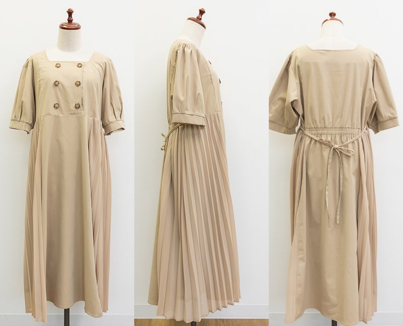 3Lサイズを着用してちょうどいいサイズ感でした!トレンチ風のデザインが上品で、きちんと感がありながらも女性らしく着られる一枚です◎サイドのプリーツが動くたびにふわっと広がって、シルエットにメリハリが出るのが可愛いポイントでした♪ウエスト周りも窮屈感なく楽に着られて、自然とスタイルアップ見えするのも嬉しいです!