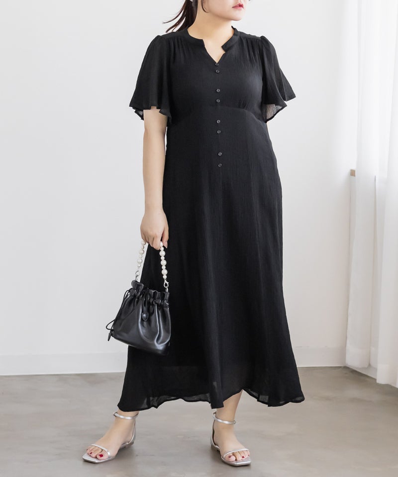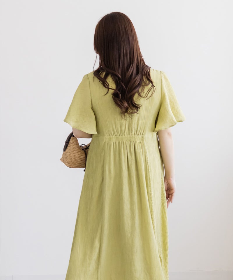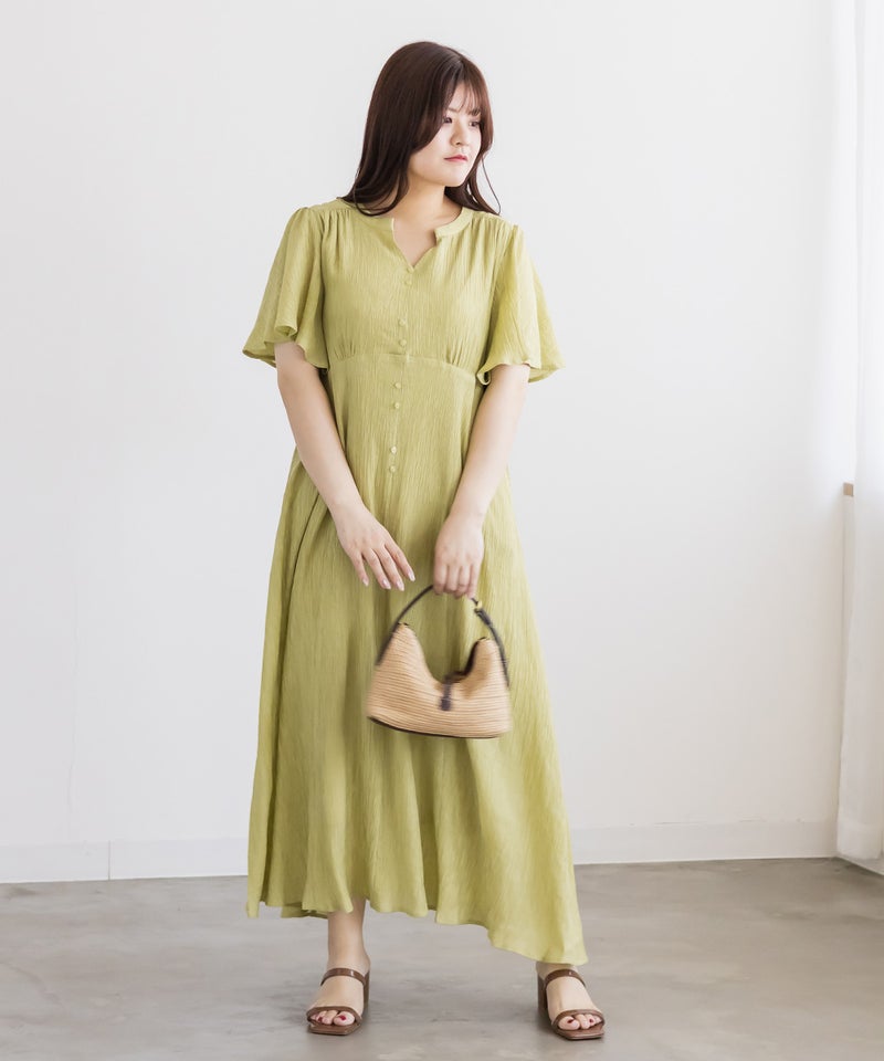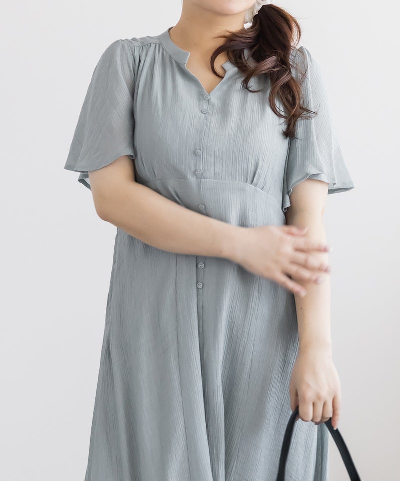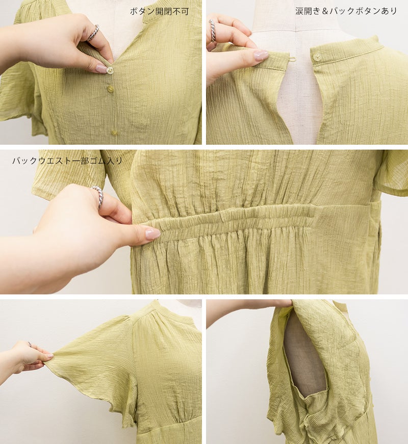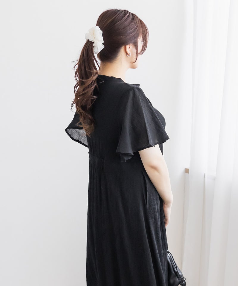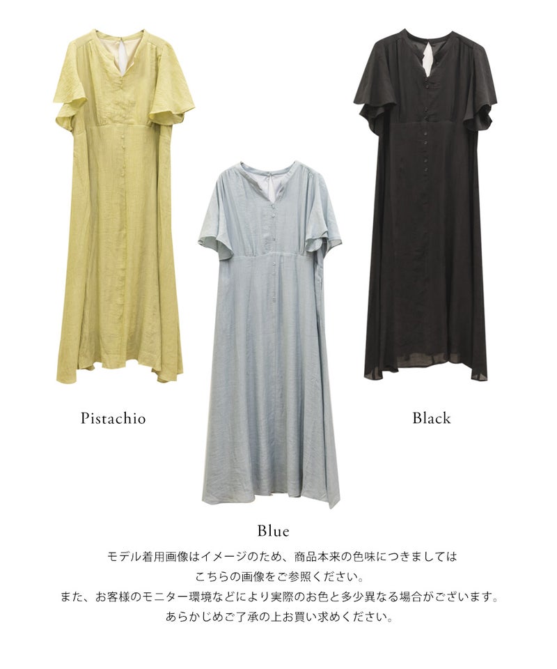 【design】首元の肌見せや上品な透け感が女性らしさをアップし、ほのかに甘みを感じさせてくれる1着。フレアスリーブが二の腕を細く見せ、着やせ効果。今年春夏おすすめのカラーと万能なブラックのカラー展開。【material】表面感のあるさらりとした素材。裏地付き。【styling】ヒールシューズと合わせれば綺麗めな印象がアップします。Vネックがデコルテラインをきれいに見せ、アクセサリー映えも抜群です。