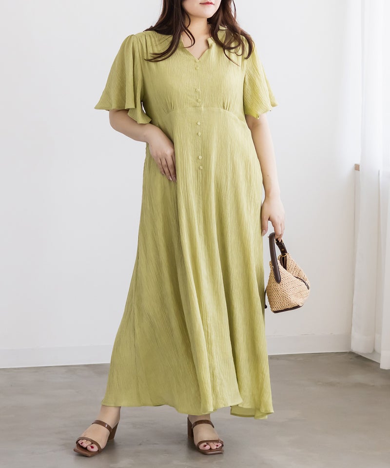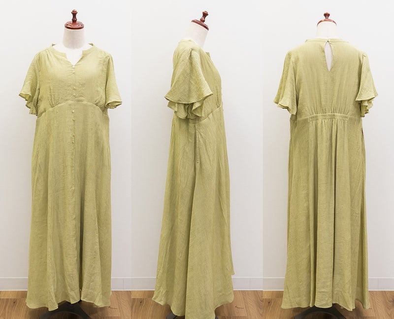 LLを着て丁度いいサイズでした。全体的にスッキリとしたシルエットですらっとした印象でした。後ろゴムで窮屈感も無くらくちんでした。軽くて春夏らしい生地で1枚でさらっと出かけたい時にピッタリです。ネック周りはキーネックになっていて顔回りが華奢見えします◎ネックレスなどアクセサリーも映えるワンピースです!