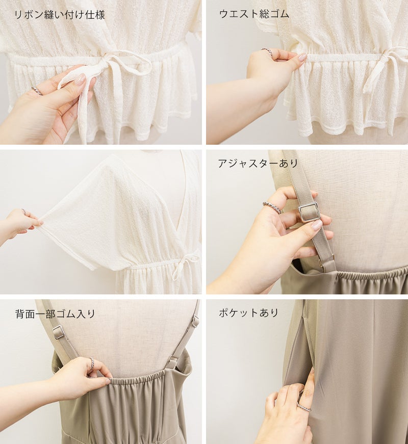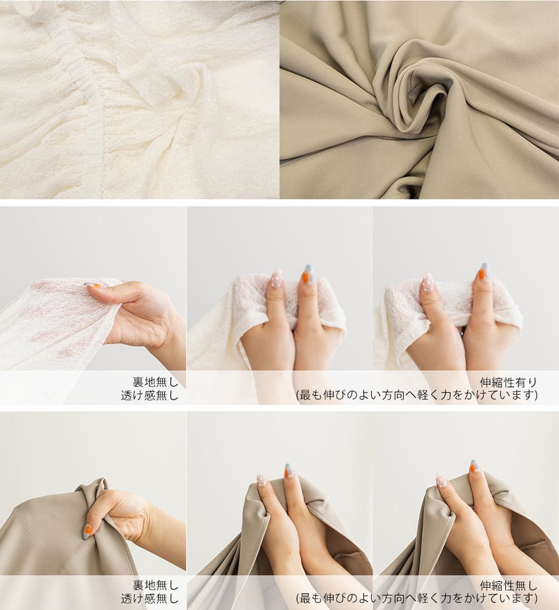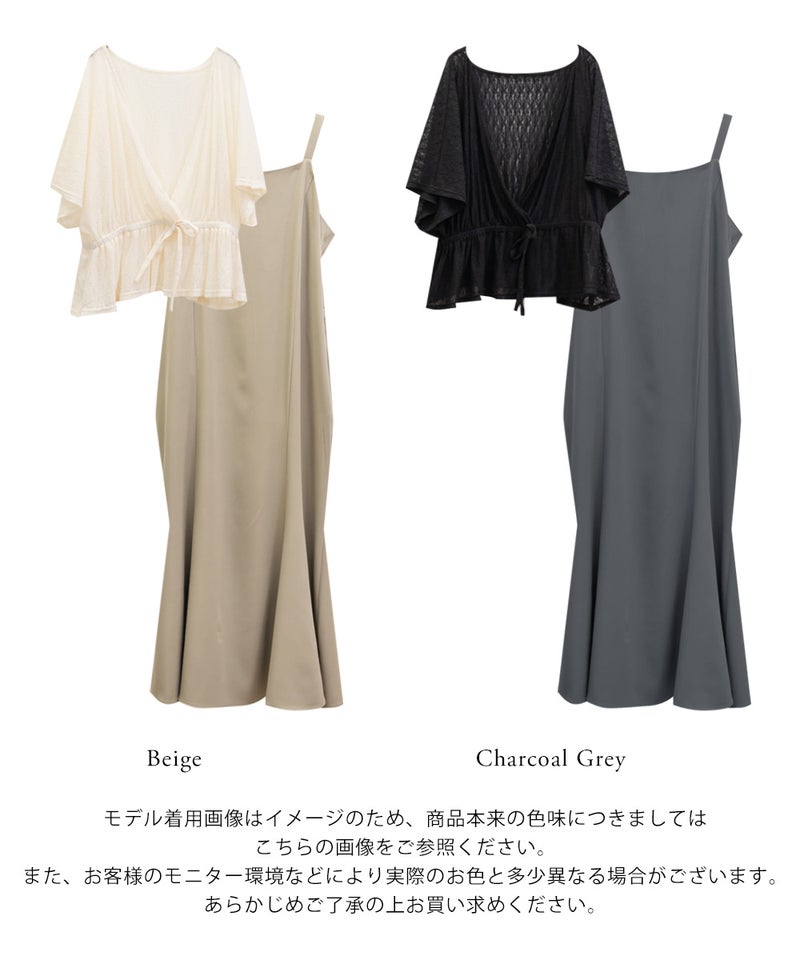 【design】1枚持っておくと即コーデが完成する万能アイテム。旬なレーストップスは二の腕やお腹周りのふくらみをカバーするシルエットかつ、着丈を短くすることでスタイルアップ効果。ワンピースは女性らしさが引き立つセミマーメイドシルエット。【material】トップス:透け感と伸縮性のあるレース素材。ワンピース:さらっとした布帛素材。オールシーズン対応可能。【styling】セットで着用すると大人可愛い雰囲気に仕上がります。上下別々に着用できるので、ボーダートップスやデニムパンツとのカジュアルアイテムとの組み合わせもおすすめです。季節問わず、色々なパターンのコーディネートに着回し可能。