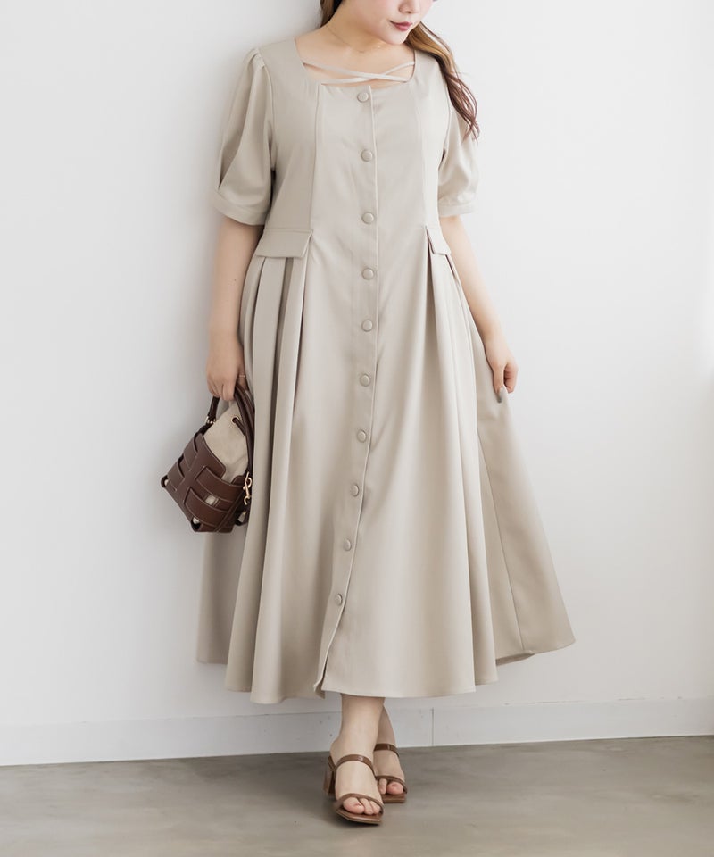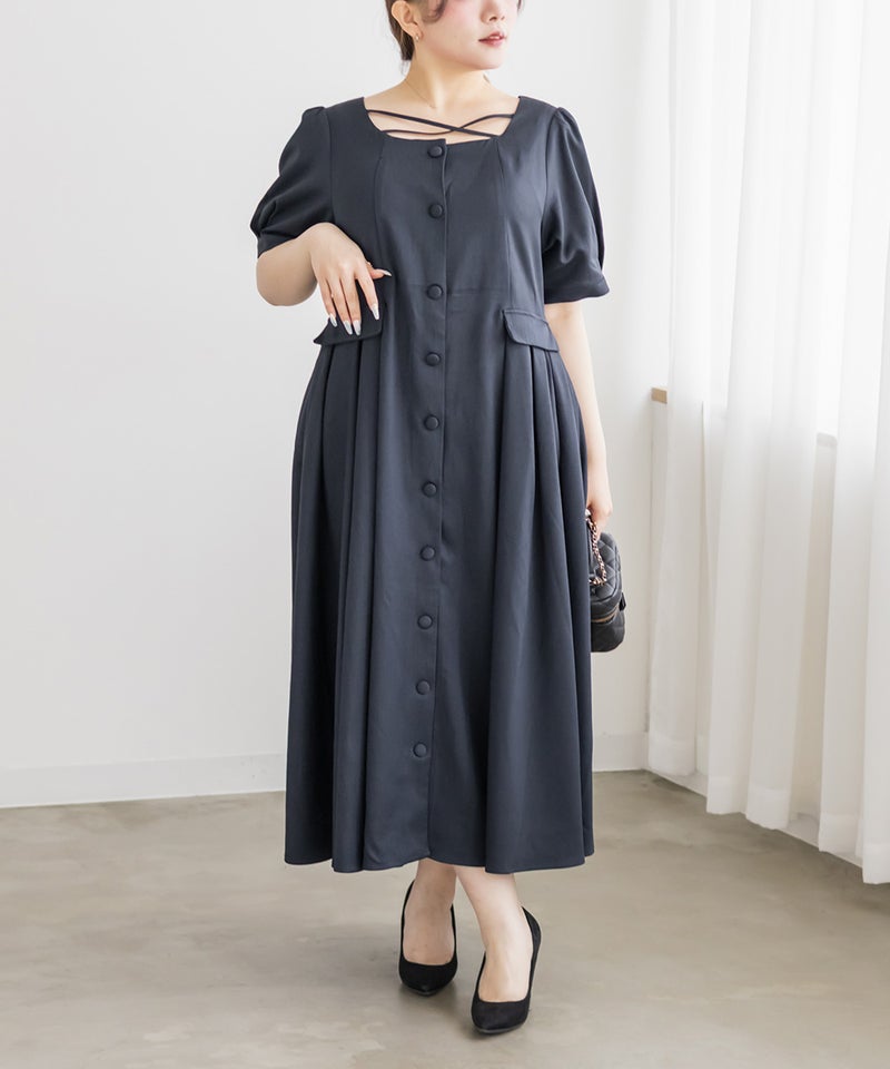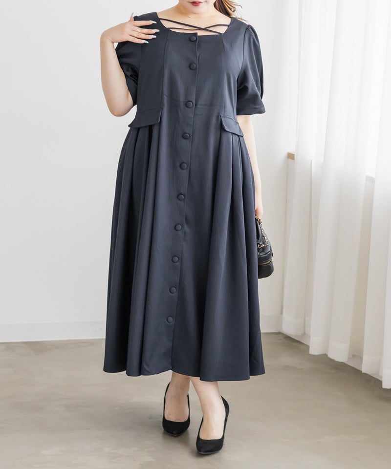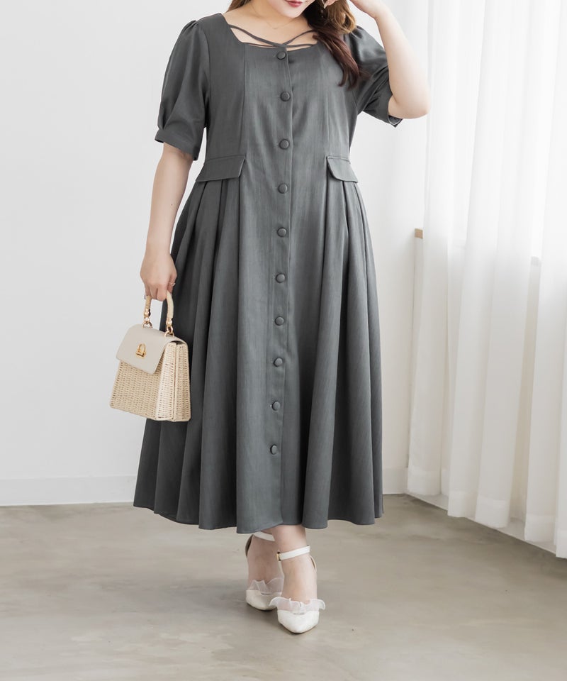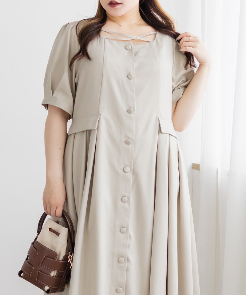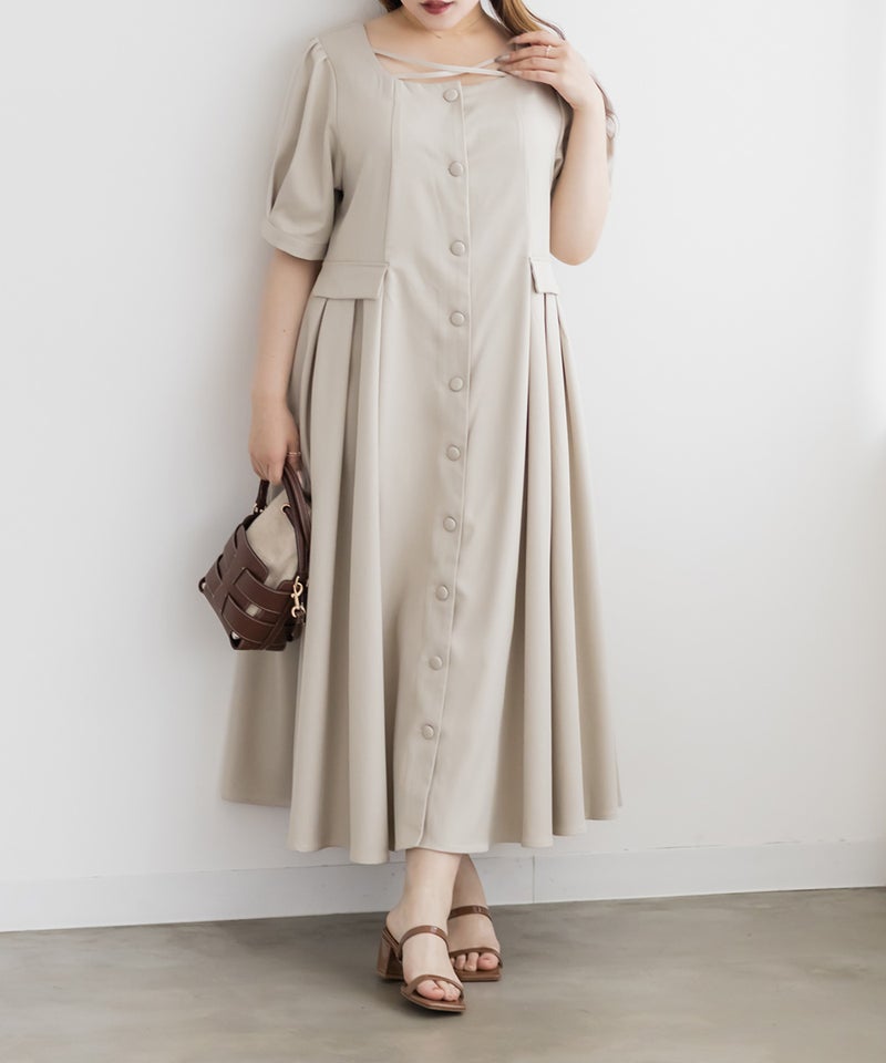 【design】サイドプリーツで体型をさりげなくカバーしつつ、胸元のクロスチョーカーデザインがトレンド感をプラス。大きめのフロントボタンが縦のラインを強調し、すっきりとしたシルエットに導きます。上品で洗練された印象を演出できるワンピースです。【material】程よくしっかりとしたさらりとした素材です。【styling】一枚でさらりと着用でき、ヒールやパンプスと合わせた上品なスタイリングがおすすめです。