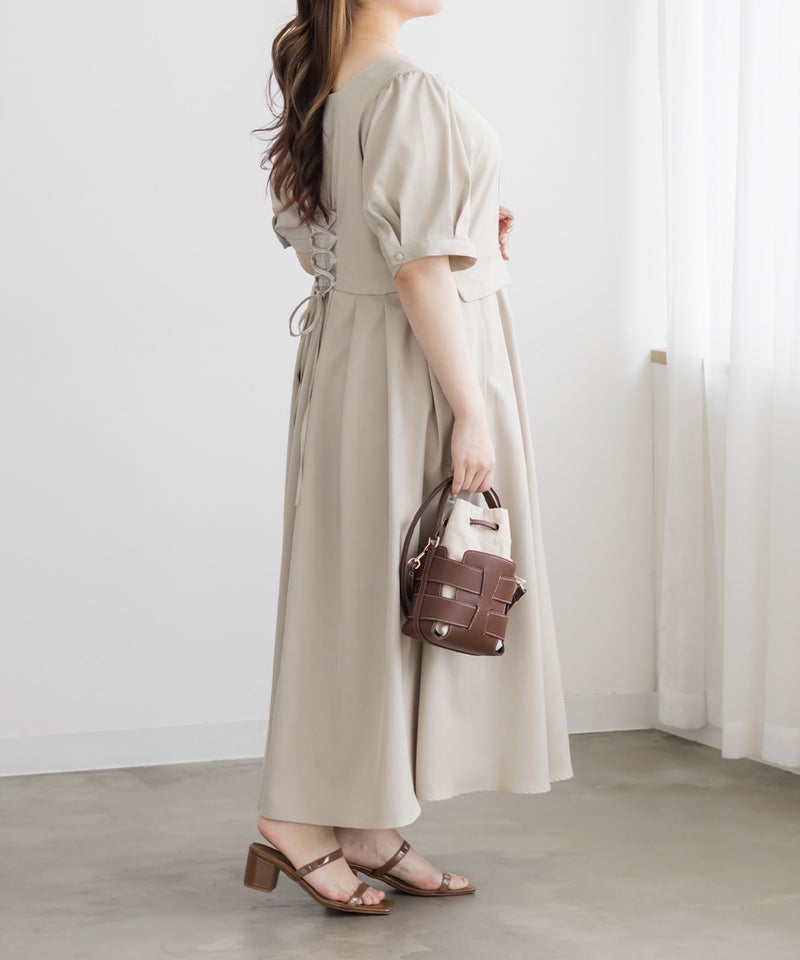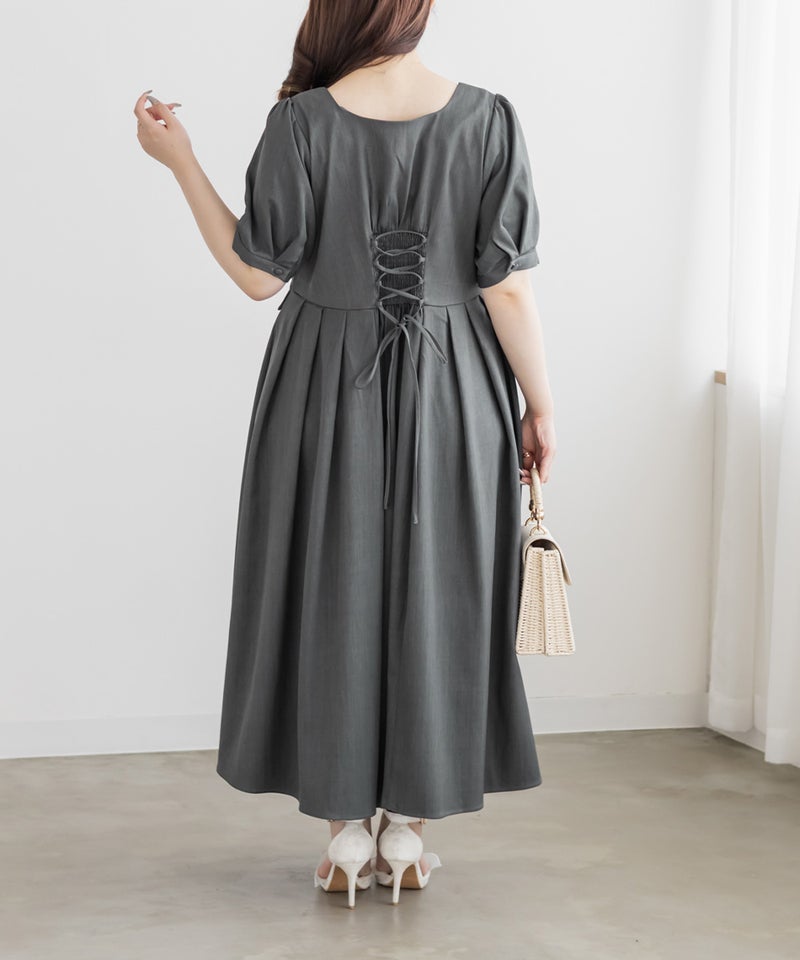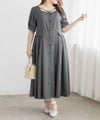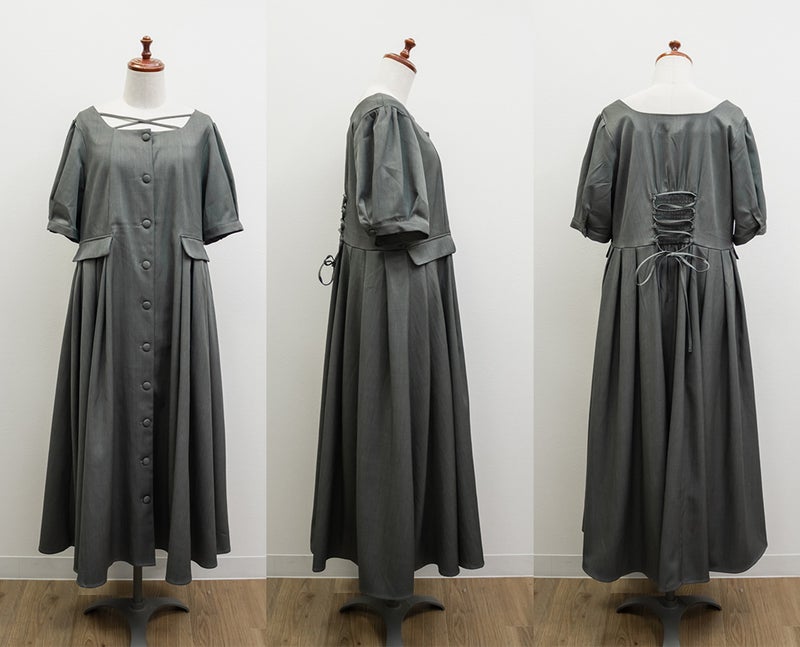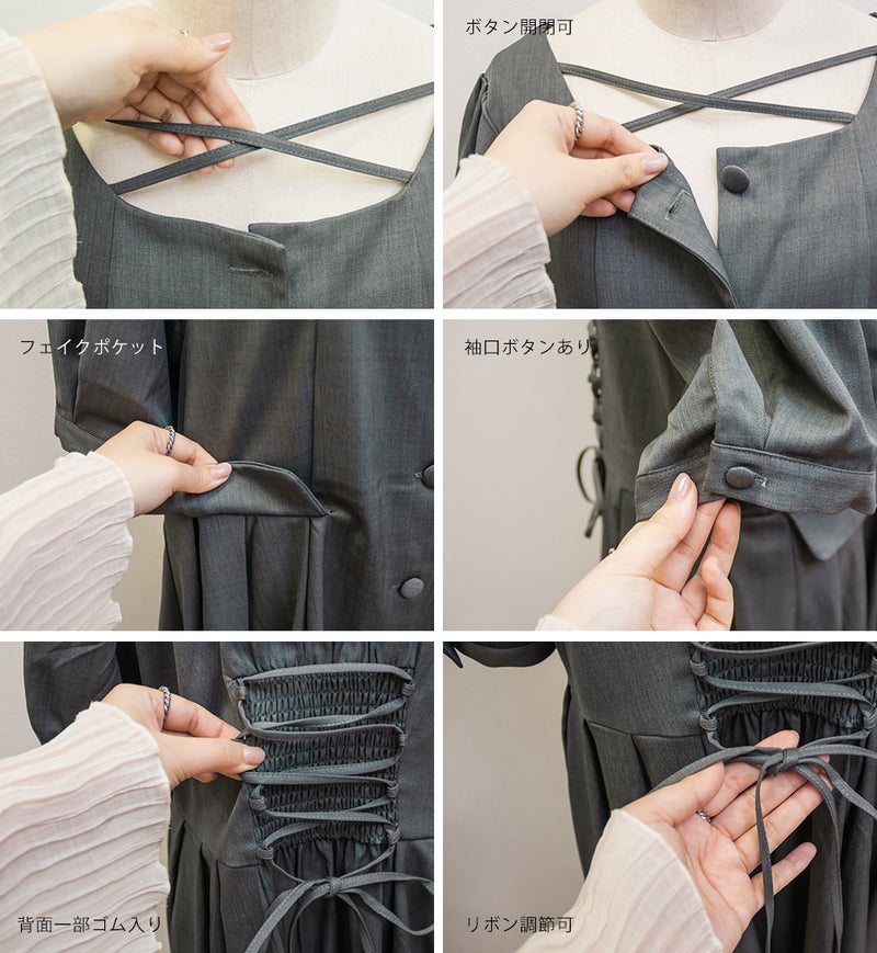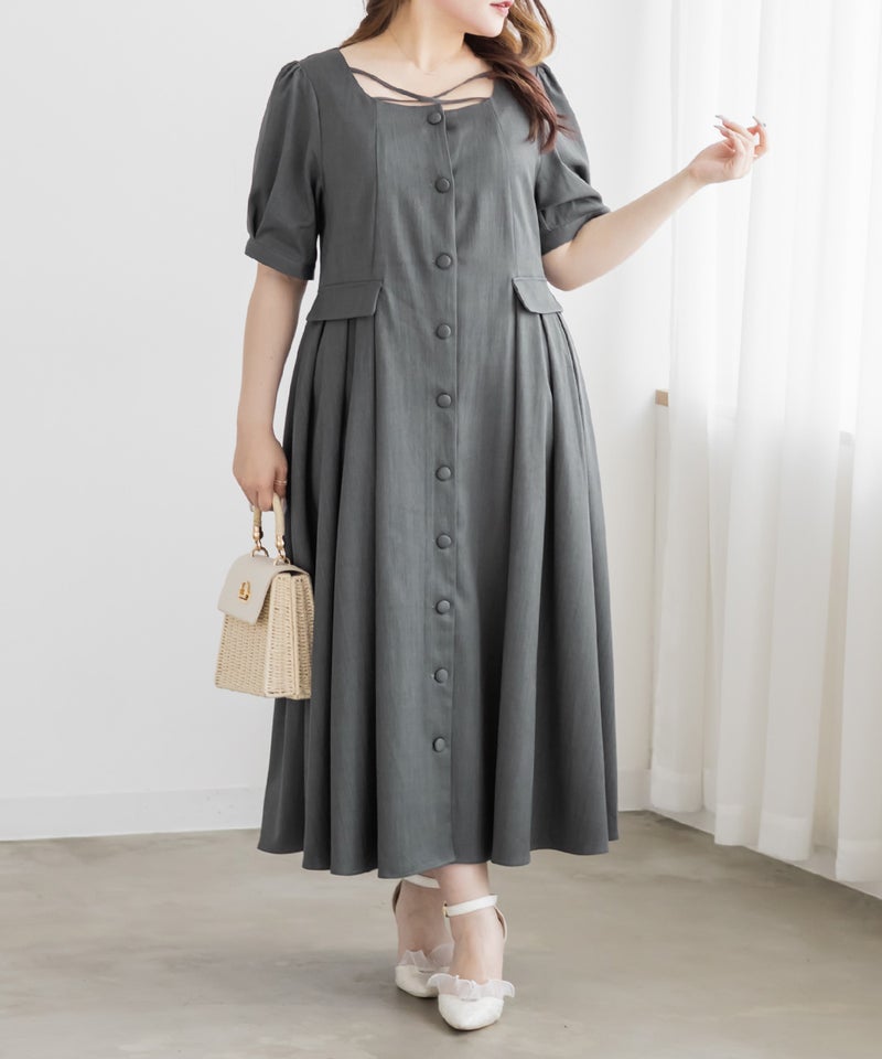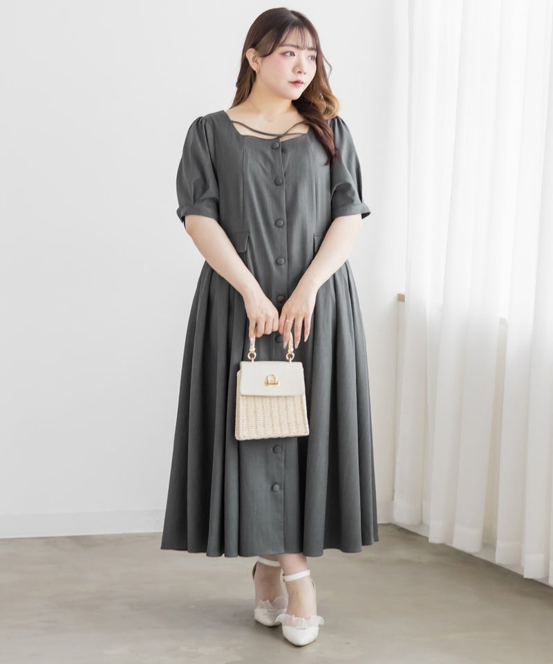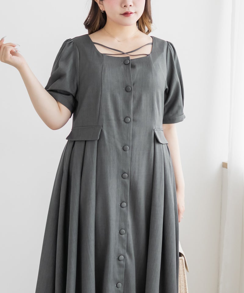 【design】サイドプリーツで体型をさりげなくカバーしつつ、胸元のクロスチョーカーデザインがトレンド感をプラス。大きめのフロントボタンが縦のラインを強調し、すっきりとしたシルエットに導きます。上品で洗練された印象を演出できるワンピースです。【material】程よくしっかりとしたさらりとした素材です。【styling】一枚でさらりと着用でき、ヒールやパンプスと合わせた上品なスタイリングがおすすめです。