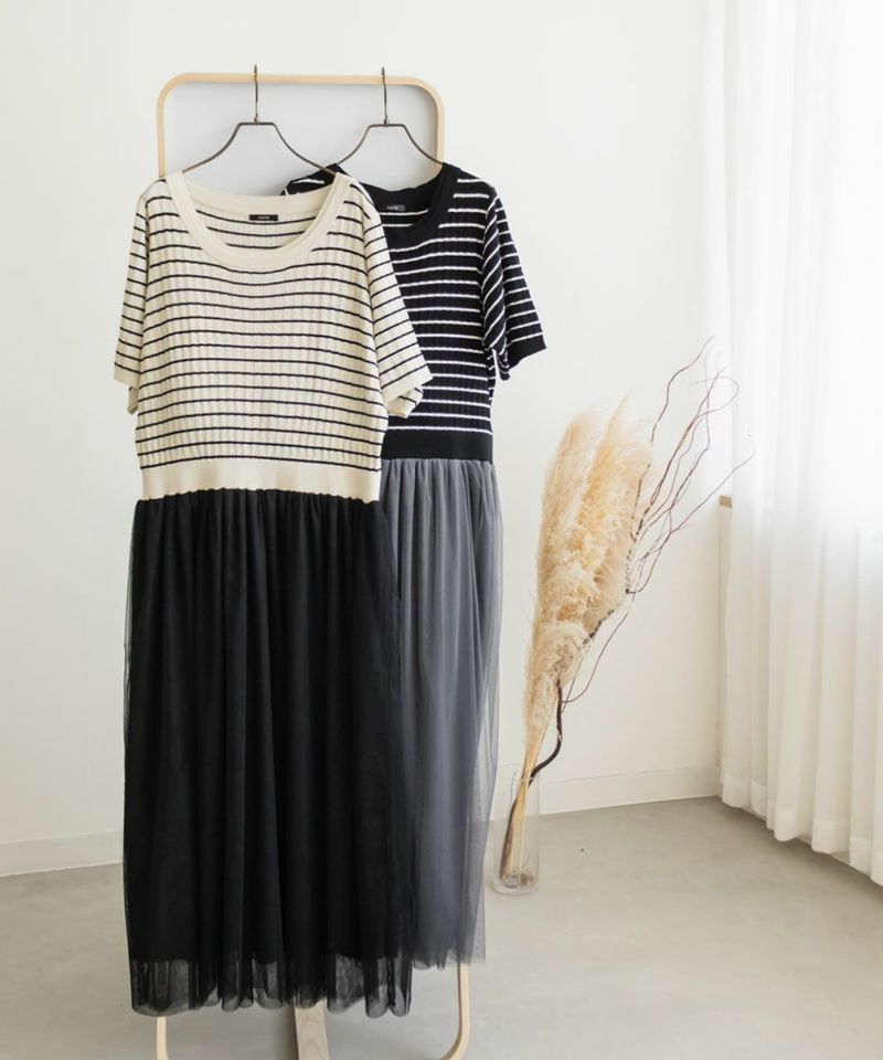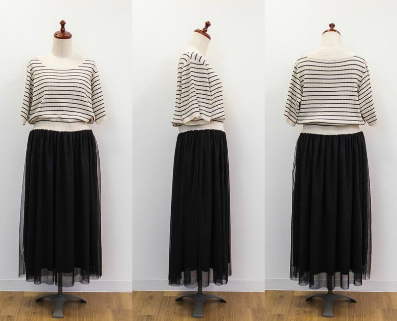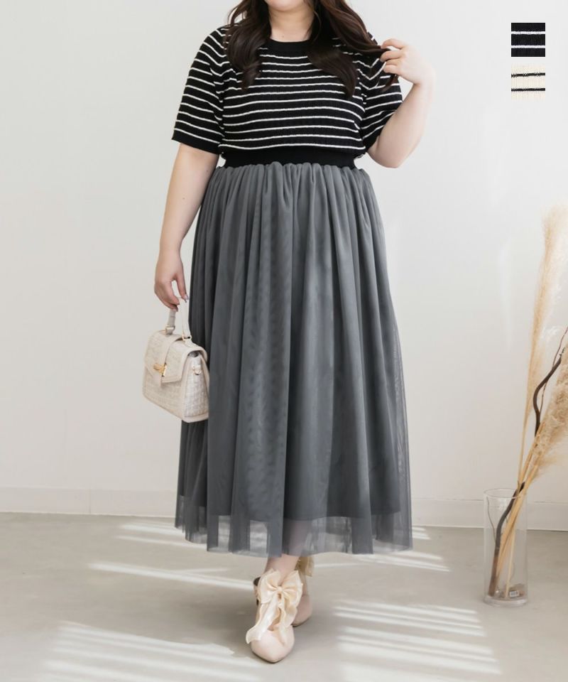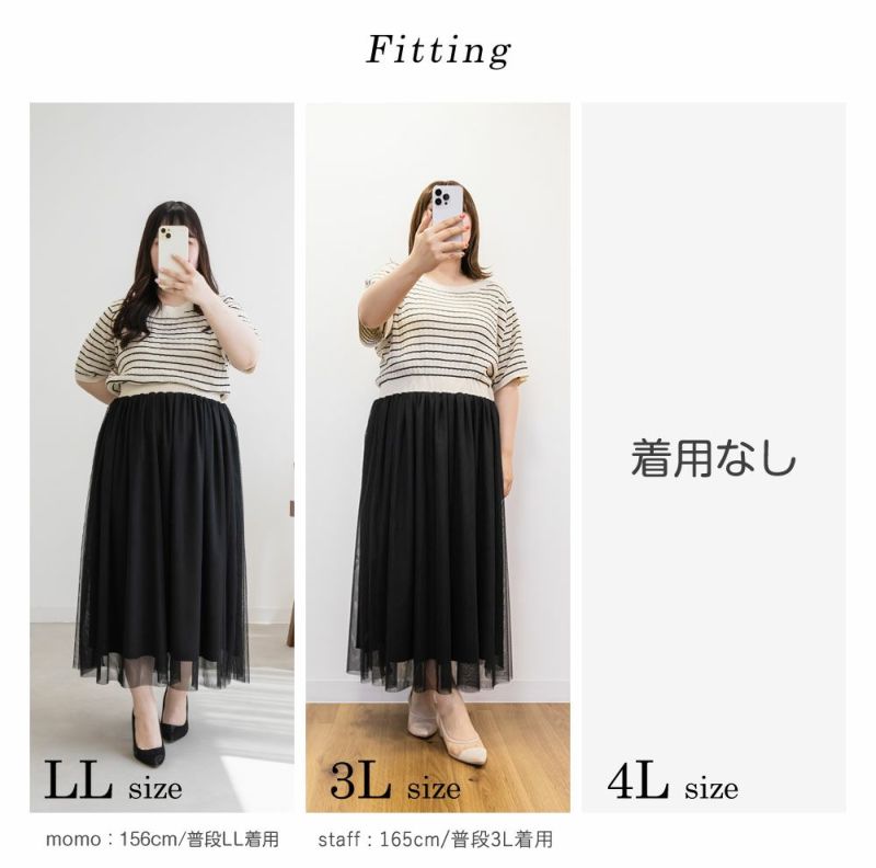 LLを着てちょうどいいサイズでした。窮屈感のないウエストゴムでブラウジングっぽく着られるから、おなか周りもぴたっとしないで、ストレスなく着ることができます◎ふわりとしたギャザー入りのチュールが腰回りや気になる部分を体型カバーしてくれます。ニット部分もフィットしすぎないからボディラインを拾いません。コーディネートが苦手な人も、さっと着るだけで女性らしいトレンドコーデになれるデザインです!