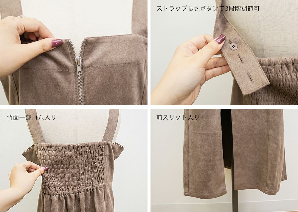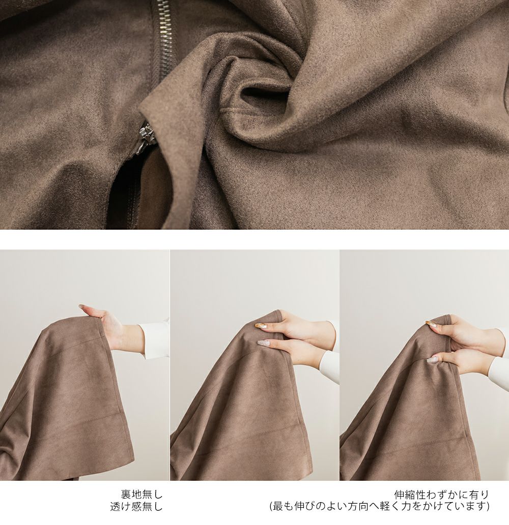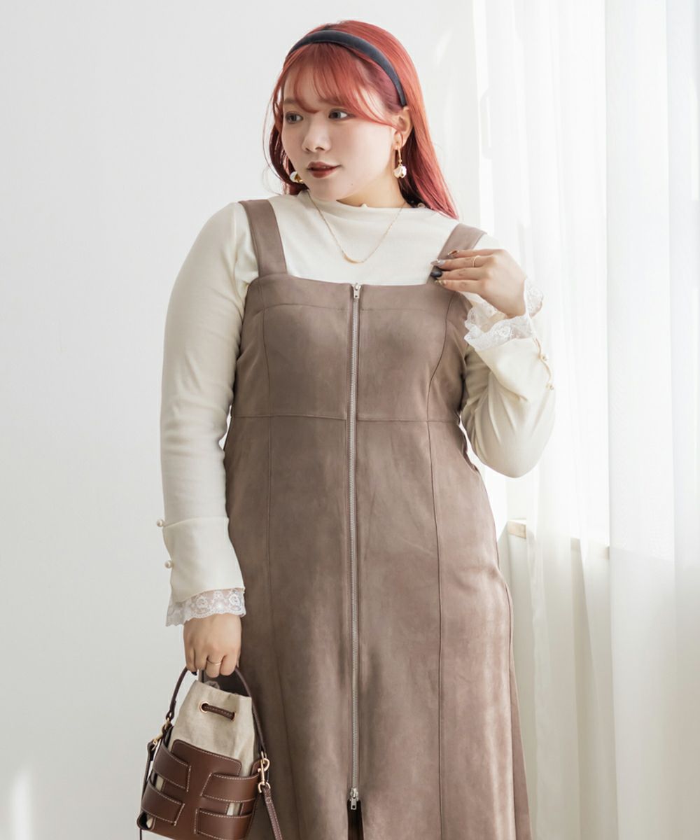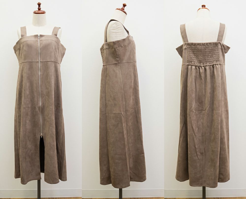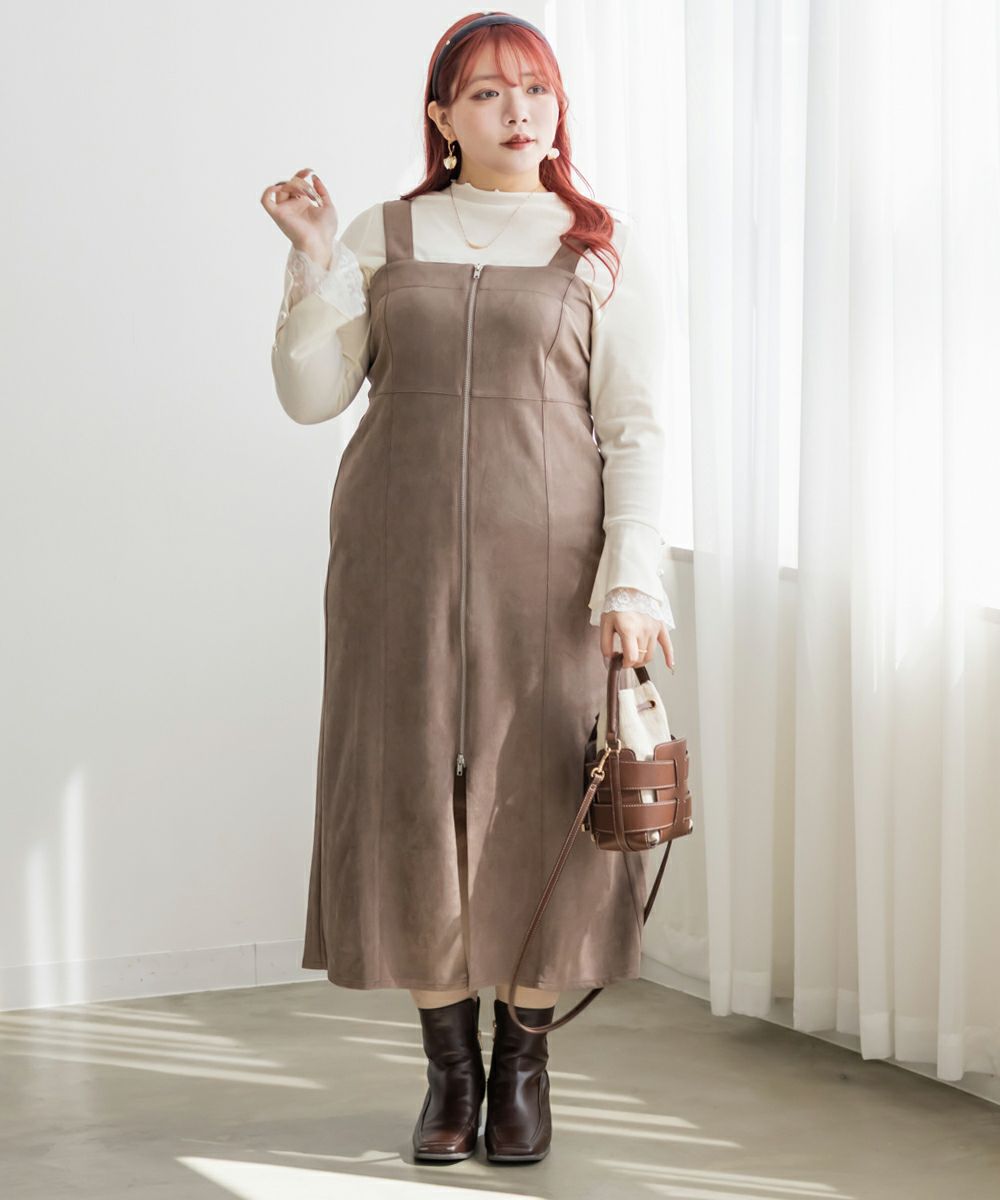3Lサイズを着用してピッタリのサイズ感でした。やわらかいスエード調の生地で着心地ラクチンでした◎切り替え位置が高めなのでスタイルアップしてすっきりした印象で着ることができました!真ん中ジップデザインが縦のラインを強調してくれるのもポイントです!Iラインのワンピースだけど、タイト過ぎないシルエットなので、ボディラインも拾いにくいのが嬉しいです。インナー次第で様々な雰囲気になれるのでたくさん着回しできます♪
