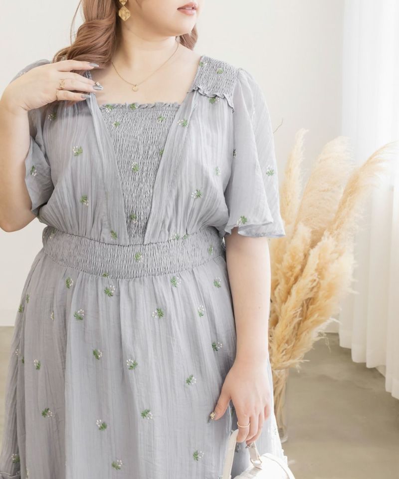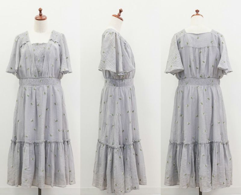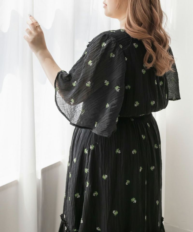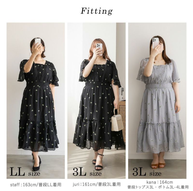 3Lを着てちょうどいいサイズでした。花柄の生地が可愛いのもありますが、派手ではないけど洗練されたデザインになっていて、細かいところまで可愛いです!胸元が見えないけれどすっきりとしたネックデザインと、ひらりとしたフレア袖が上品に着やせ効果をプラスしています。ウエストシャーリングで着心地が楽なのも嬉しいです!大人っぽいけどフェミニンになれる、他にはないワンピースです♪