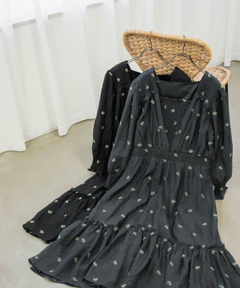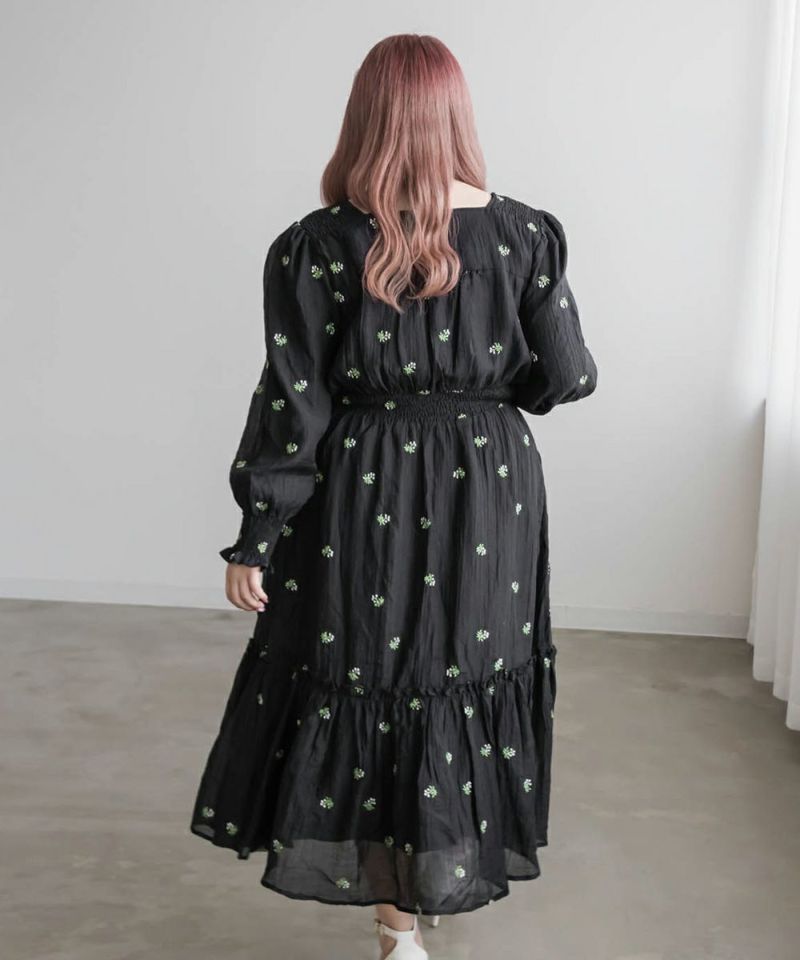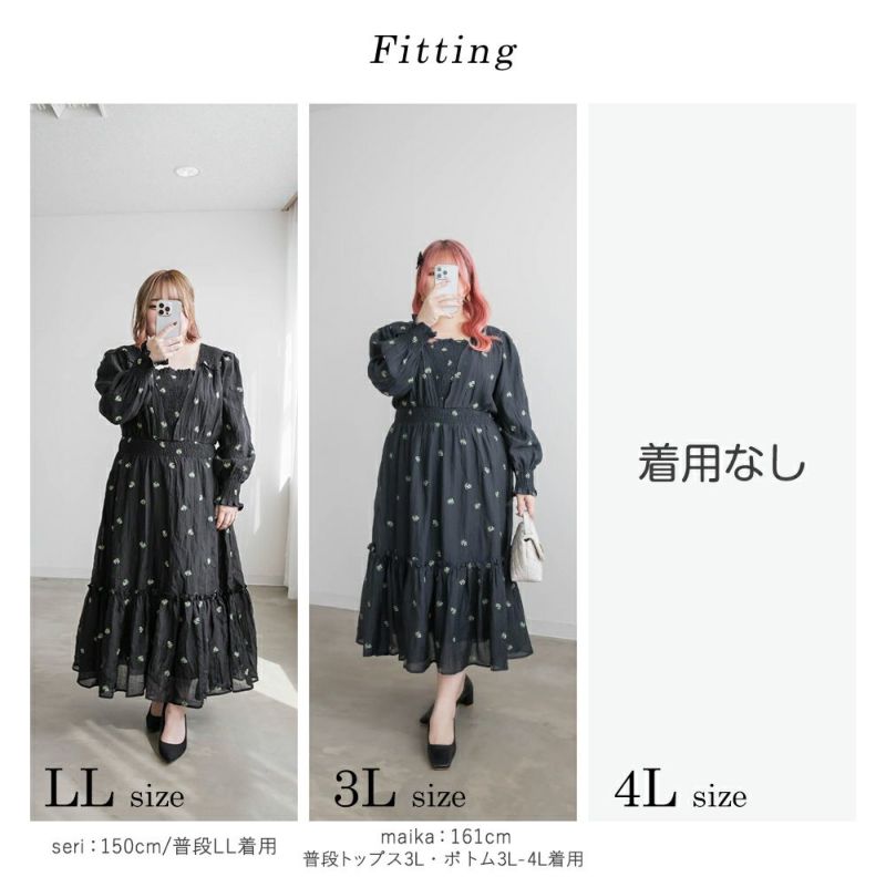 3Lを着てちょうどいいサイズでした。花柄の生地が派手ではないけど洗練されたデザインになっていて、細かいところまで可愛いです!胸元が見えないけれどすっきりとしたネックデザインがポイントでウエストシャーリングで着心地が楽なのも嬉しいです!大人っぽいけどフェミニンになれる、他にはないワンピースです♪