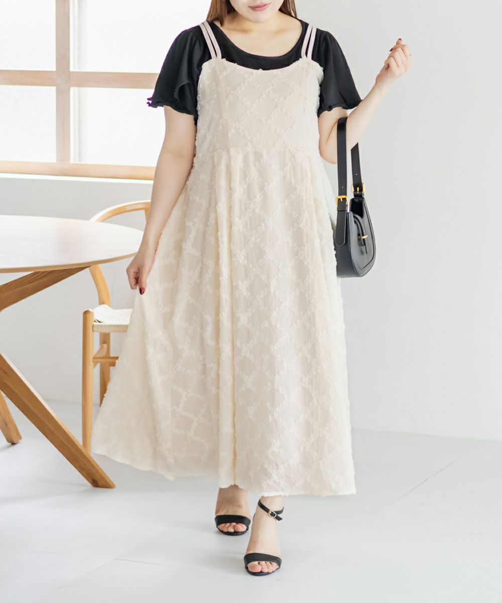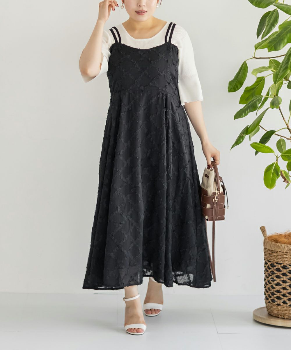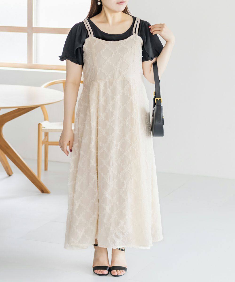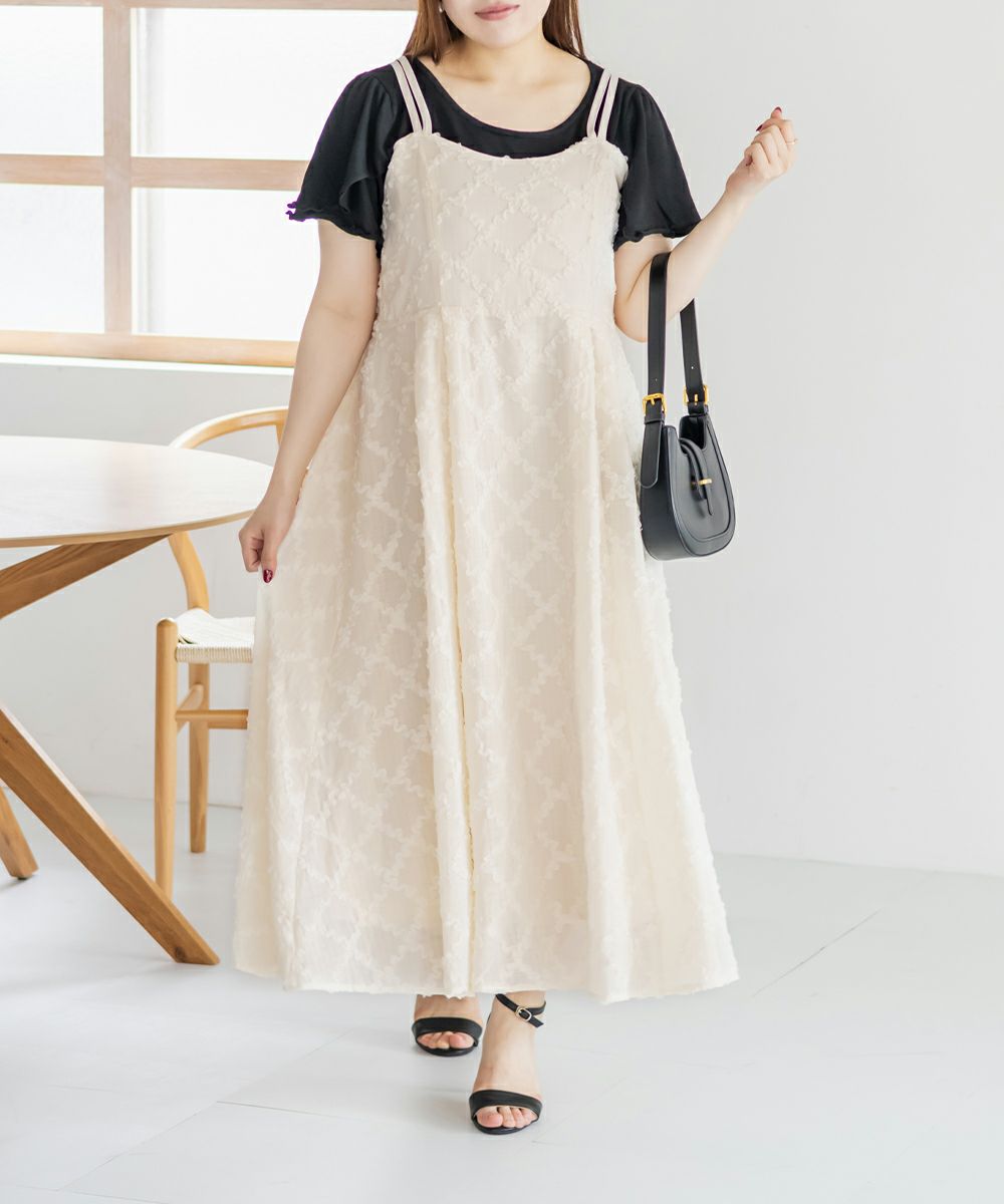 3Lサイズを着用しましたが、後ろはゴムでバストやウエストまわりに程よいゆとりがあり、全体的にちょうどいい着心地でした◎ チェックになったフリルの生地が可愛くて甘すぎず大人っぽい雰囲気で、カットソーやブラウスとのレイヤードも楽しめます!スカート部分はふんわりと広がり、気になる腰まわりやヒップも自然にカバーしてくれるシルエットでした!ダブルストラップになっていて、1つは自由にネックラインを変えられる仕様です。ホルターネックやクロスネックにして雰囲気が変えられるのもポイントです!オールシーズン使用できるのであると嬉しい1枚!お出かけやデートにピッタリな可愛いキャミワンピースです♪