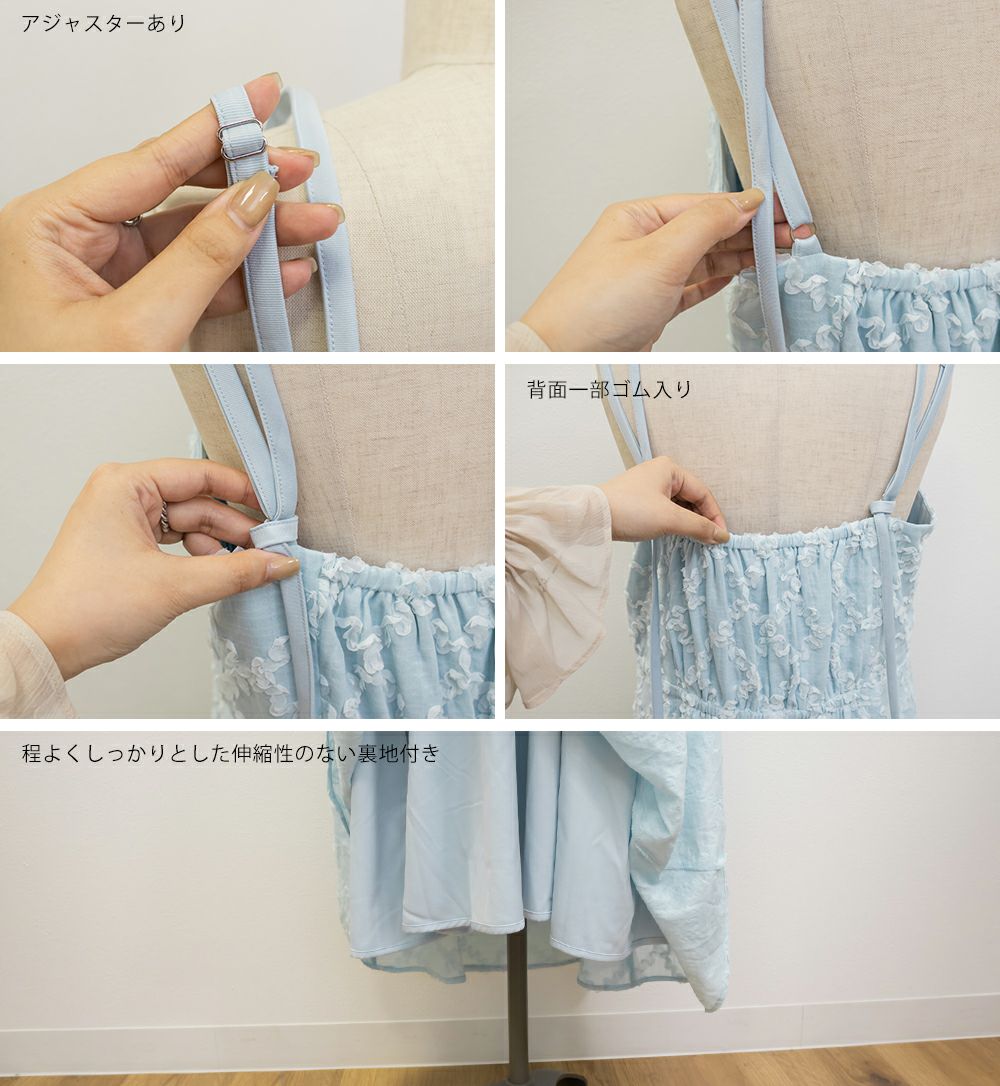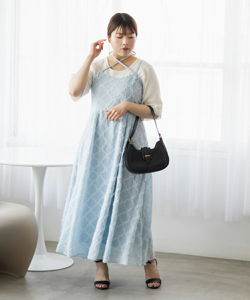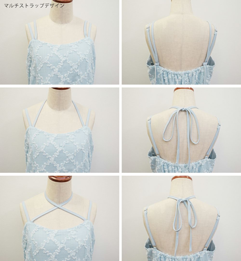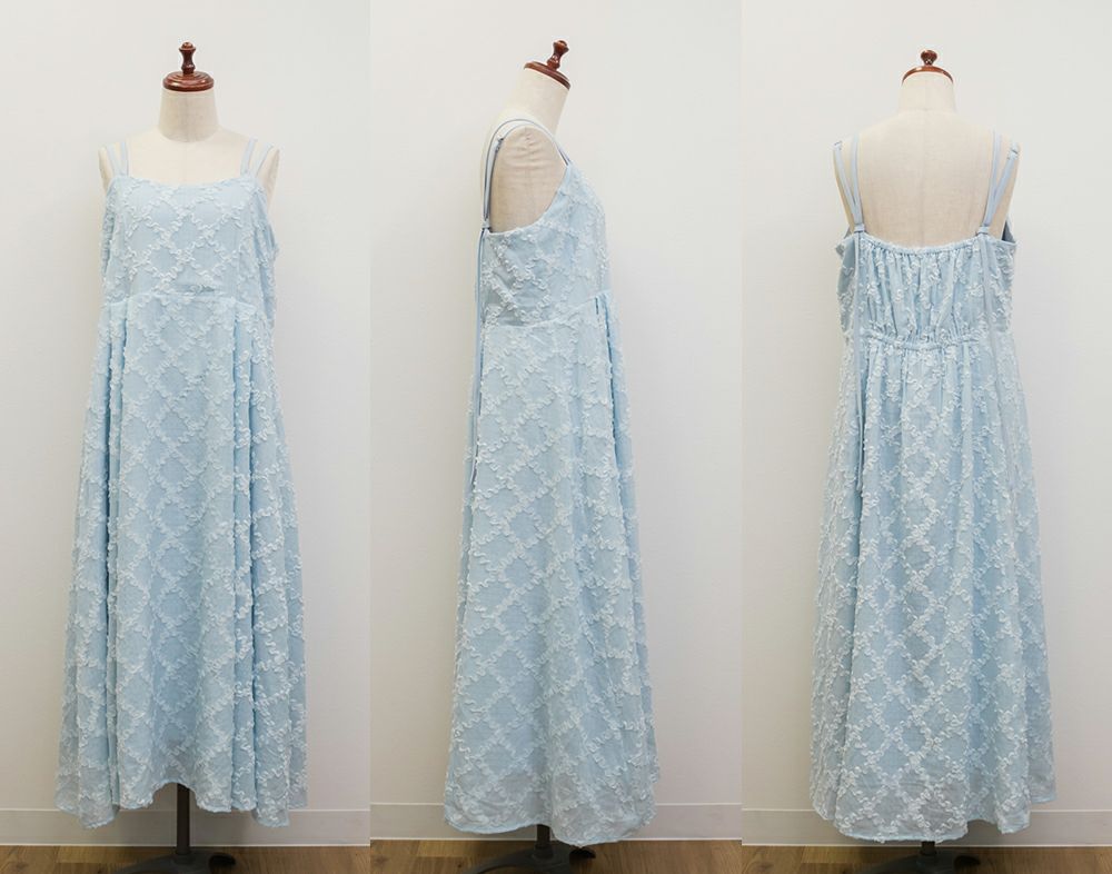 3Lサイズを着用しましたが、後ろはゴムでバストやウエストまわりに程よいゆとりがあり、全体的にちょうどいい着心地でした◎ チェックになったフリルの生地が可愛くて甘すぎず大人っぽい雰囲気で、カットソーやブラウスとのレイヤードも楽しめます!スカート部分はふんわりと広がり、気になる腰まわりやヒップも自然にカバーしてくれるシルエットでした!ダブルストラップになっていて、1つは自由にネックラインを変えられる仕様です。ホルターネックやクロスネックにして雰囲気が変えられるのもポイントです!オールシーズン使用できるのであると嬉しい1枚!お出かけやデートにピッタリな可愛いキャミワンピースです♪