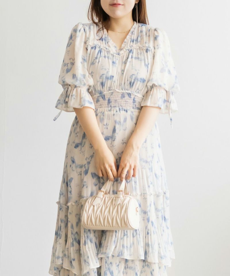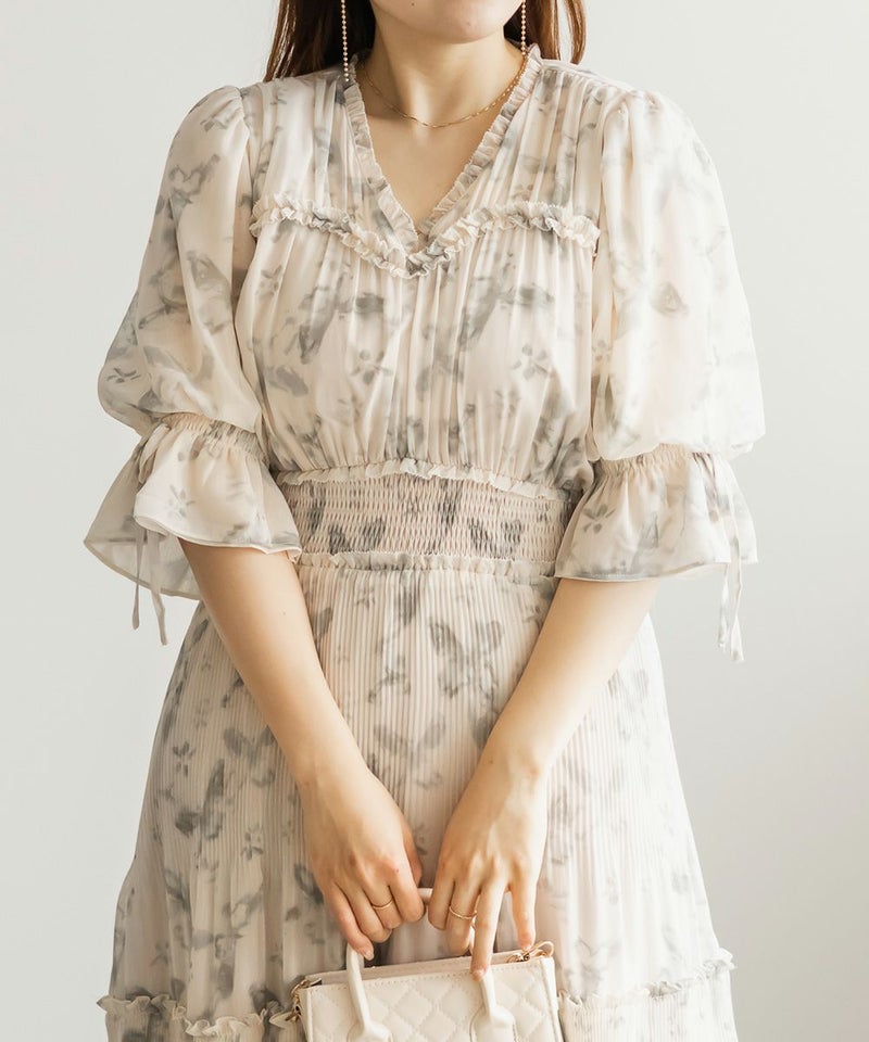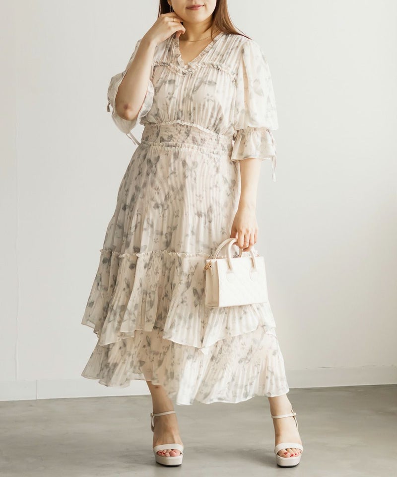 3Lサイズを着用しましたが、窮屈感なくちょうどいい着心地でした◎ウエストや袖口はゴム入りで、とってもらくちんです!バタフライ柄がほんのり個性を出しつつ、甘すぎない印象で大人っぽく着こなせます♪Vネックになっていて、小さいフリルもあしらわれていて顔回りをすっきり華やかに見せてくれます◎ウエスト切替と細かなプリーツがスタイルアップ効果もあって、着るだけでサマになる1枚です!さらっと着るだけで主役級の華やかさがあるので、お出かけやデートにもおすすめです!