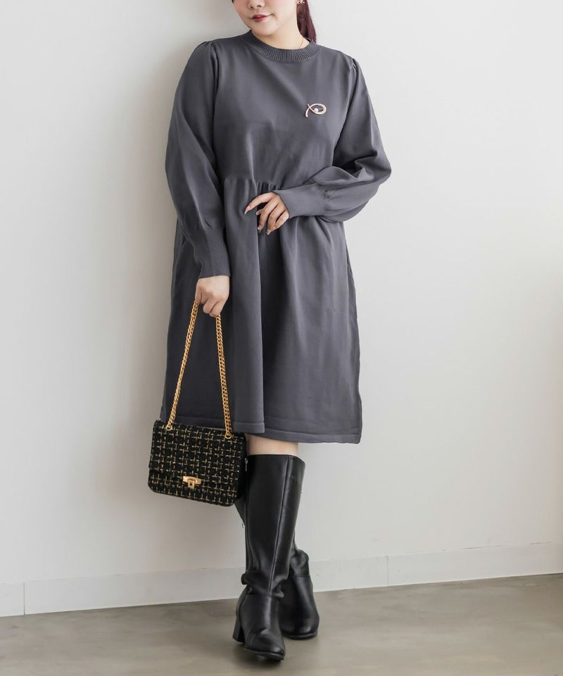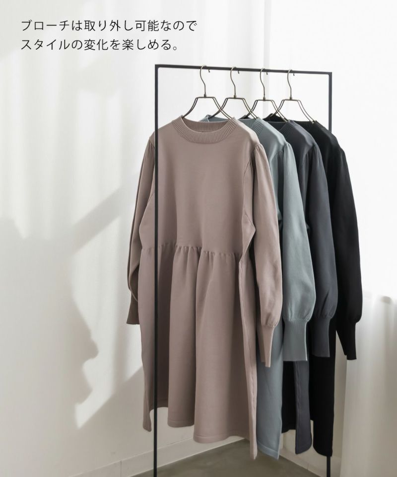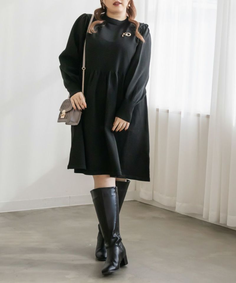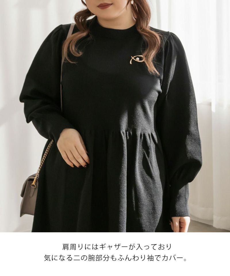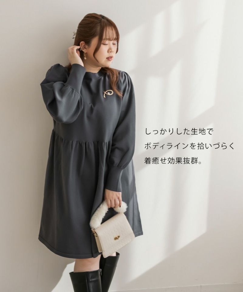 3Lサイズを着用してちょうどいいサイズ感でした。伸縮性があって着心地が良いけど程よくハリがあってボディラインも拾いづらい生地感なのが嬉しいです◎スポンジニットなのでとっても軽いのも魅力!首元はプチハイになっていて女性らしい雰囲気です。お腹やお尻のシルエットが出にくいフィット&フレアシルエットで、スカートもミニ丈になり過ぎない膝丈なので大人っぽく着られます。ブローチは大人っぽいデザインでカジュアルになりすぎず大人かわいく着れるワンピースです♪