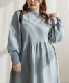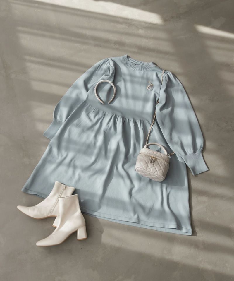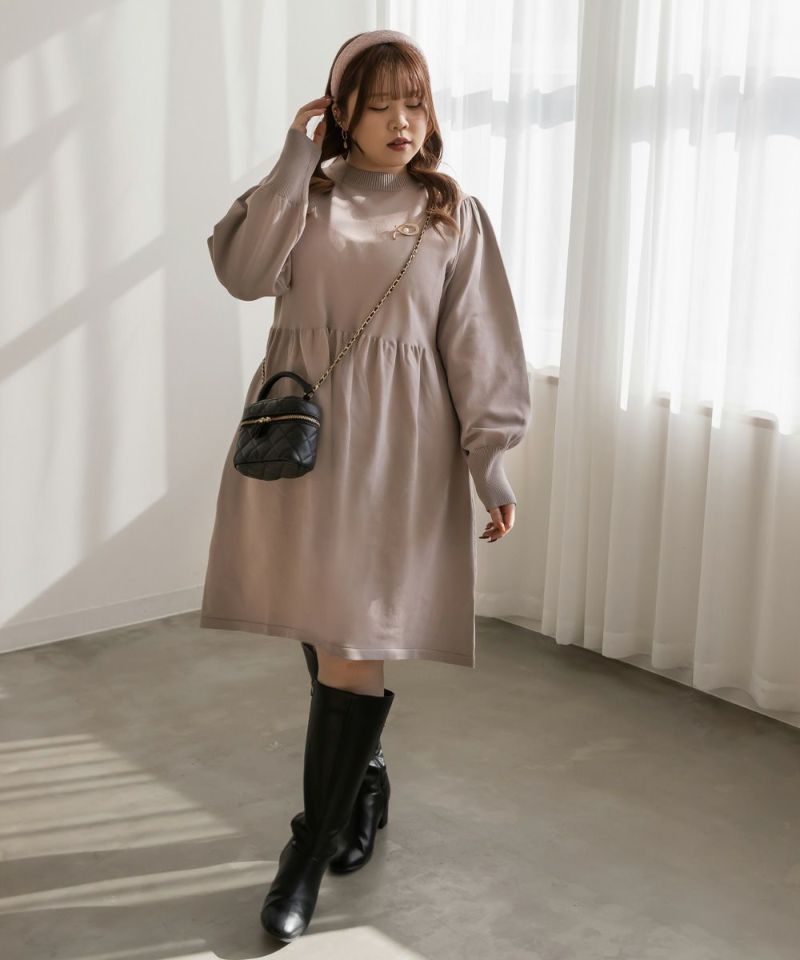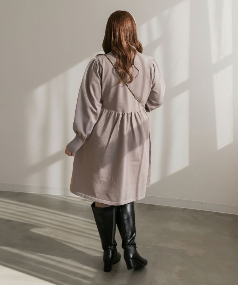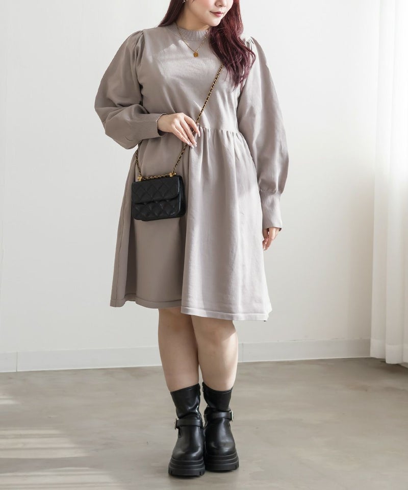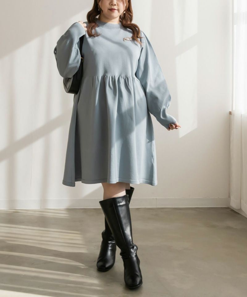 3Lサイズを着用してちょうどいいサイズ感でした。伸縮性があって着心地が良いけど程よくハリがあってボディラインも拾いづらい生地感なのが嬉しいです◎スポンジニットなのでとっても軽いのも魅力!首元はプチハイになっていて女性らしい雰囲気です。お腹やお尻のシルエットが出にくいフィット&フレアシルエットで、スカートもミニ丈になり過ぎない膝丈なので大人っぽく着られます。ブローチは大人っぽいデザインでカジュアルになりすぎず大人かわいく着れるワンピースです♪