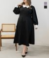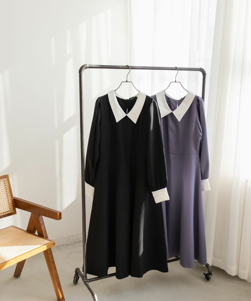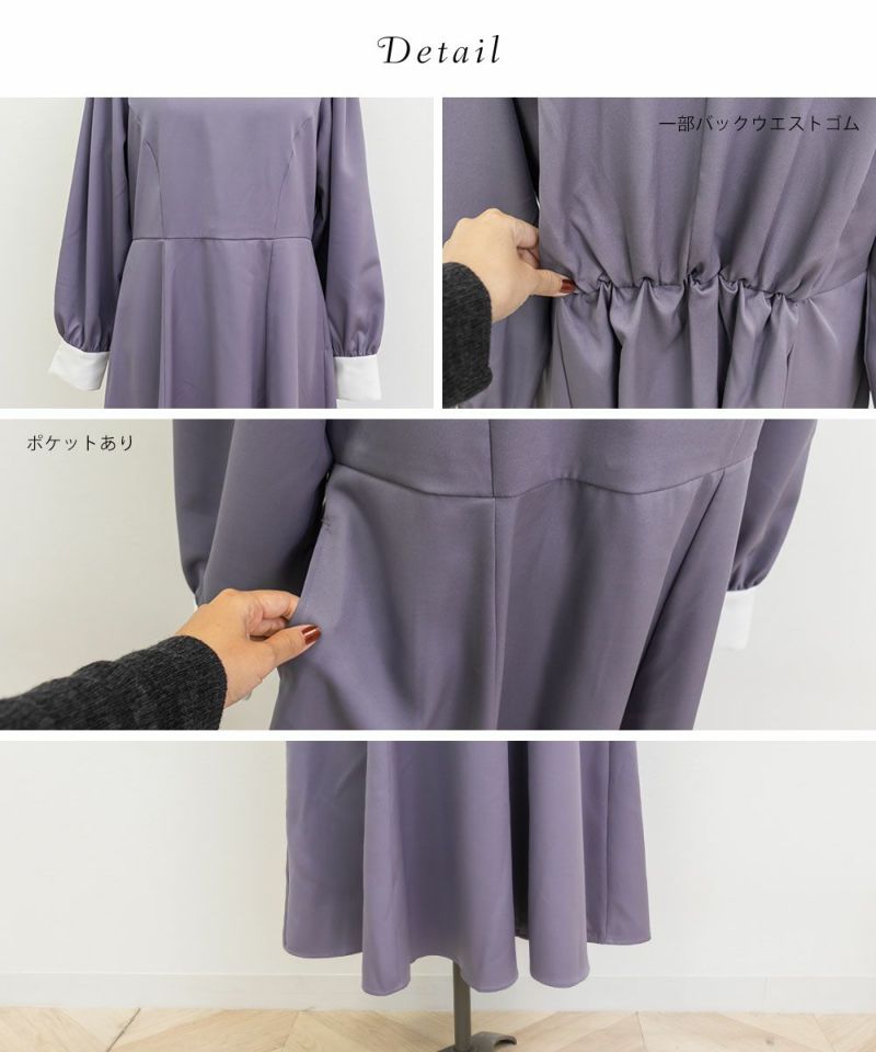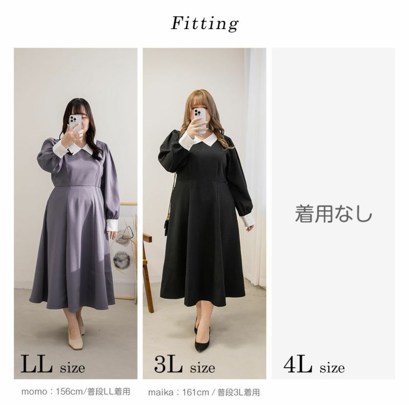 3Lを着て丁度いいサイズでした。女性らしいフィット&フレアでシルエットがとても綺麗なので着るだけで着やせできるワンピースです♪襟と袖が配色になっていて、レトロっぽさもあってフェミニンな雰囲気に着こなせます!夏以外のロングシーズン使えるおすすめワンピースです◎