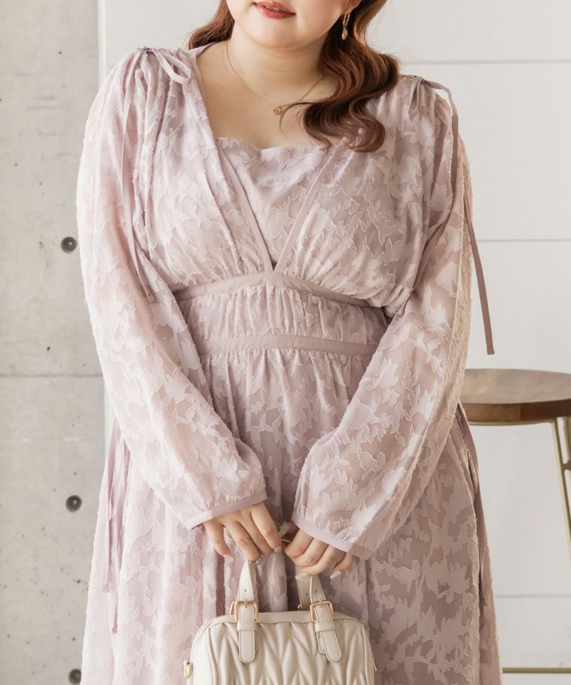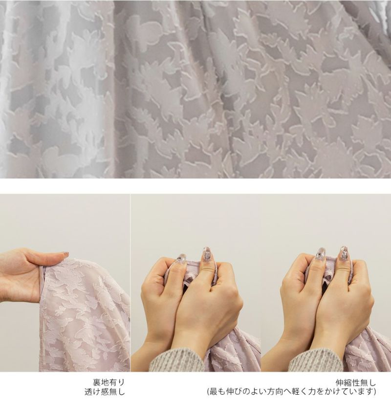 透け感のある花柄調の布帛生地。少し表面感のあるシアー素材で甘くなり過ぎない大人っぽい雰囲気です。伸縮性のないさらりとした裏地付き。デコルテ、袖部分は裏地無しで程よい透け感がアクセントになっています。
