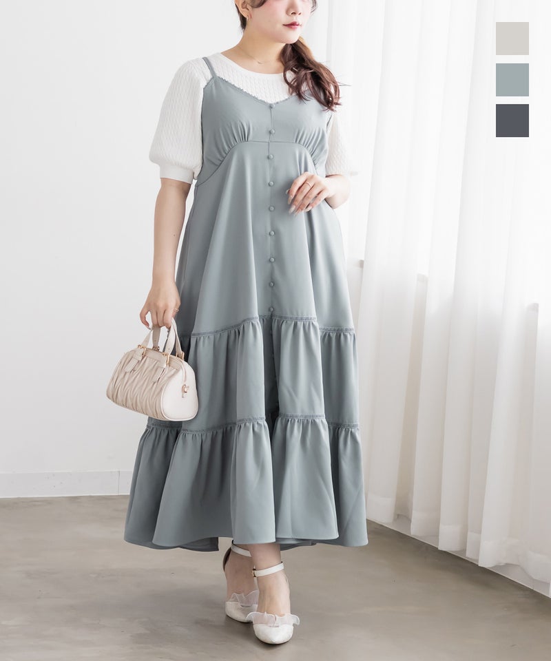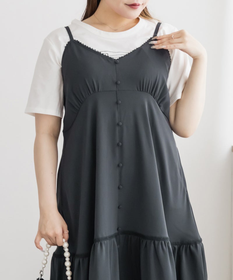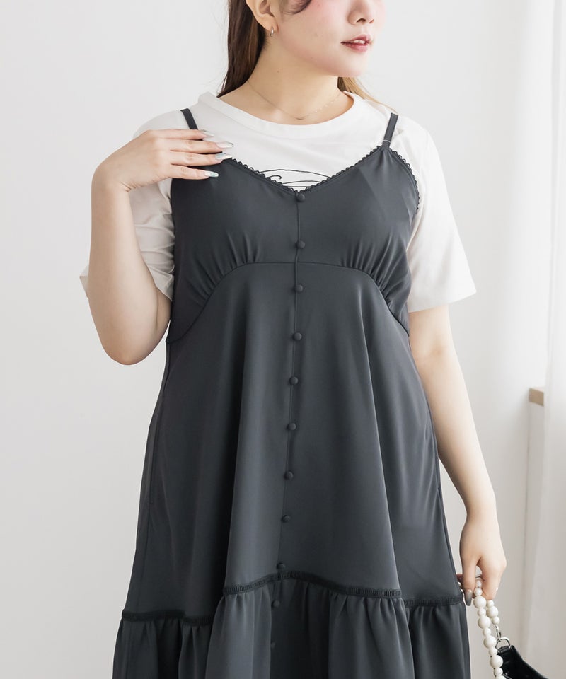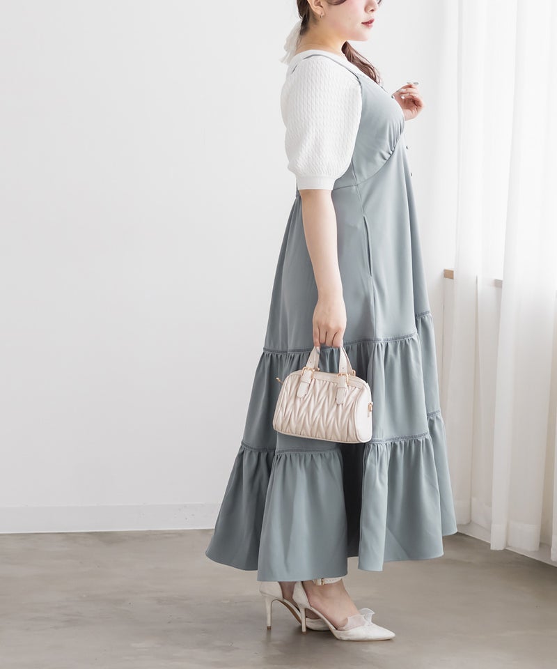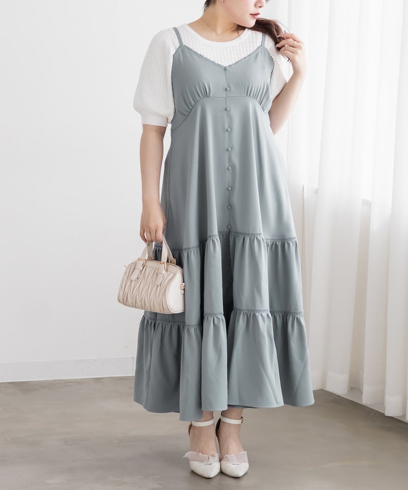 LLサイズを着用しました。程よくゆとりを持たせたシルエット感で、厚みのあるインナーを合わせても問題なさそうな着心地でした◎ 胸元の切替やギャザーで自然にメリハリが出て、バランスよく着こなせました! ティアードデザインが広がりすぎずフェミニンな雰囲気になって、シンプルなキャミワンピに飽きてきた方にもおすすめです!胸元やティアード部分にレースがあしらわれていて無地だけどお洒落な雰囲気です。インナーや小物合わせで印象チェンジしやすく、着回し力も高そうです!