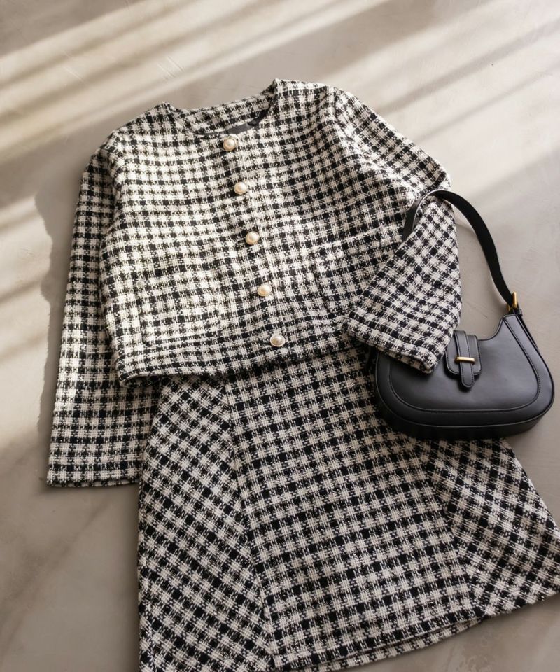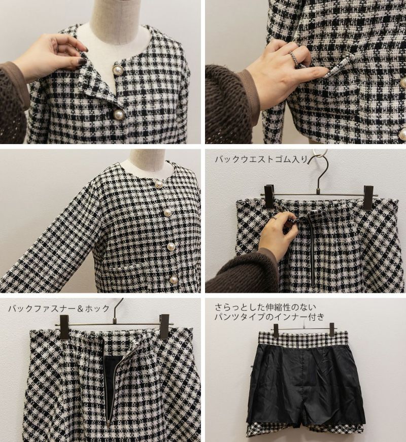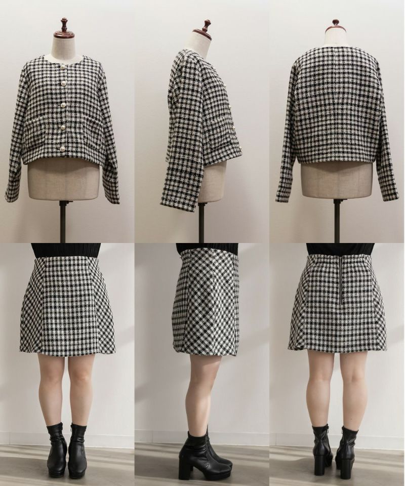 3Lサイズを着用してジャストサイズでした!しっかりしたツイード生地なので心配な方はサイズ確認をお勧めします。ハリのある素材でボディラインを拾いにくいのが嬉しいです。セットアップで着用してスタイリング完成するのでコーデいらずで可愛いです♪それぞれ単品でも使いやすいデザインなので1セットあるとたくさん着回しができます!