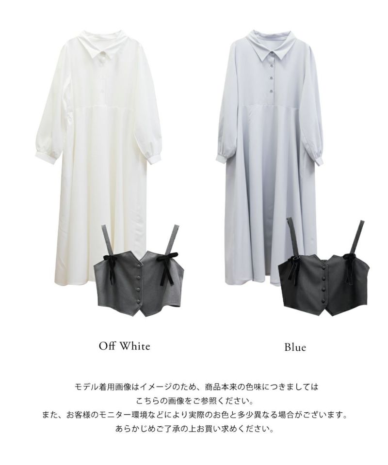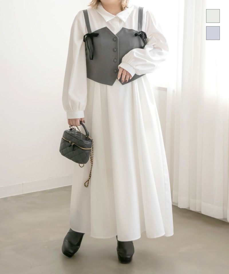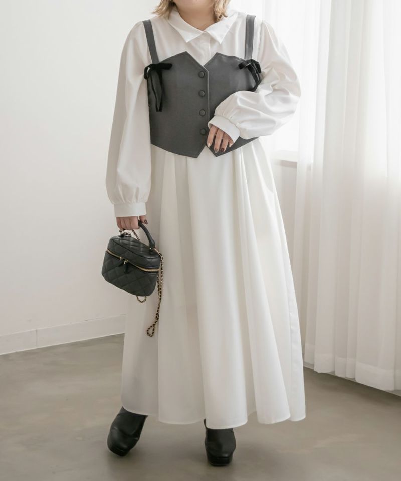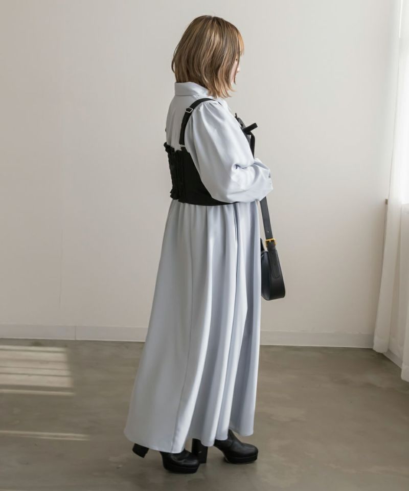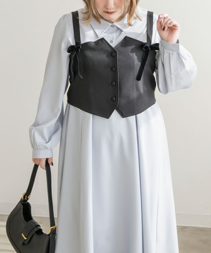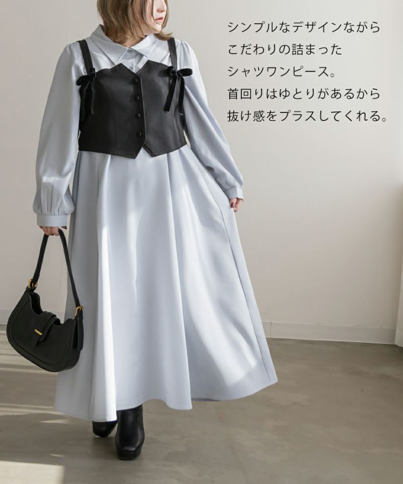 LLサイズを着てちょうどいいサイズ感でした。特に窮屈感はなく着用出来たので、いつも通りのサイズ選びで問題なさそうです。シャツ襟も詰まりすぎていないので苦しくないのが嬉しいです!シャツワンピースにビスチェがセットになったアイテムで、このセットで着るだけでお洒落な雰囲気になれます♪ワンピース単品で着ても大人っぽい雰囲気だし、ビスチェもほかのブラウスなどとコーデしてもかわいいので、着回しも楽しめます◎