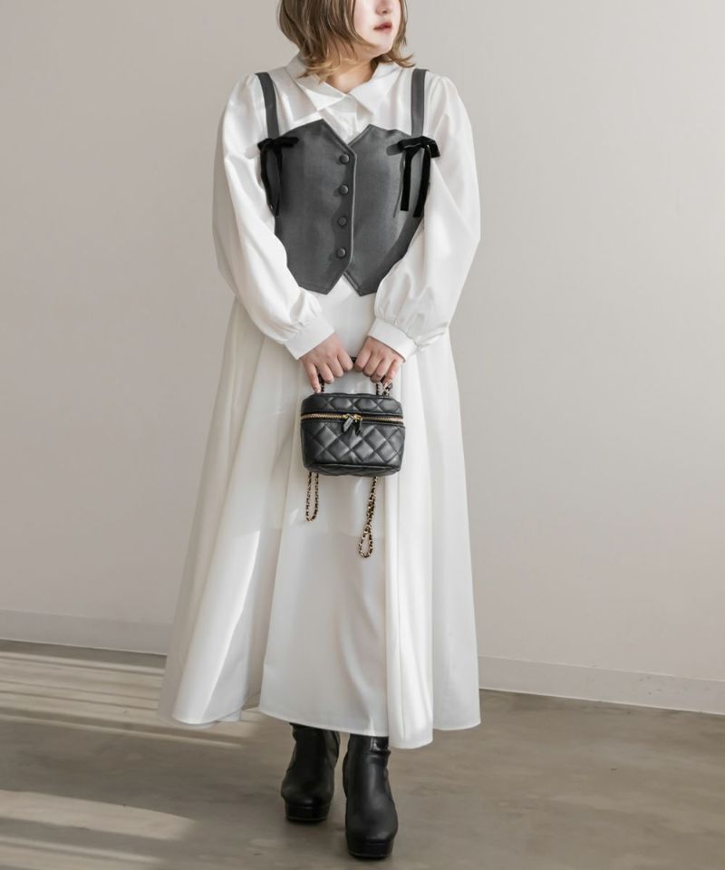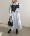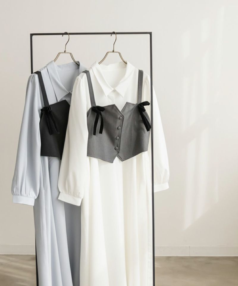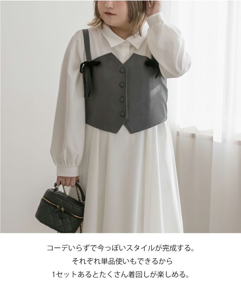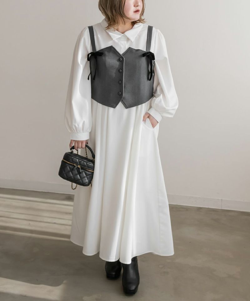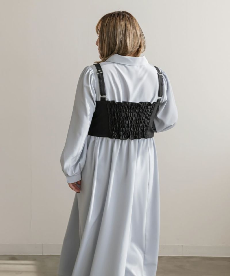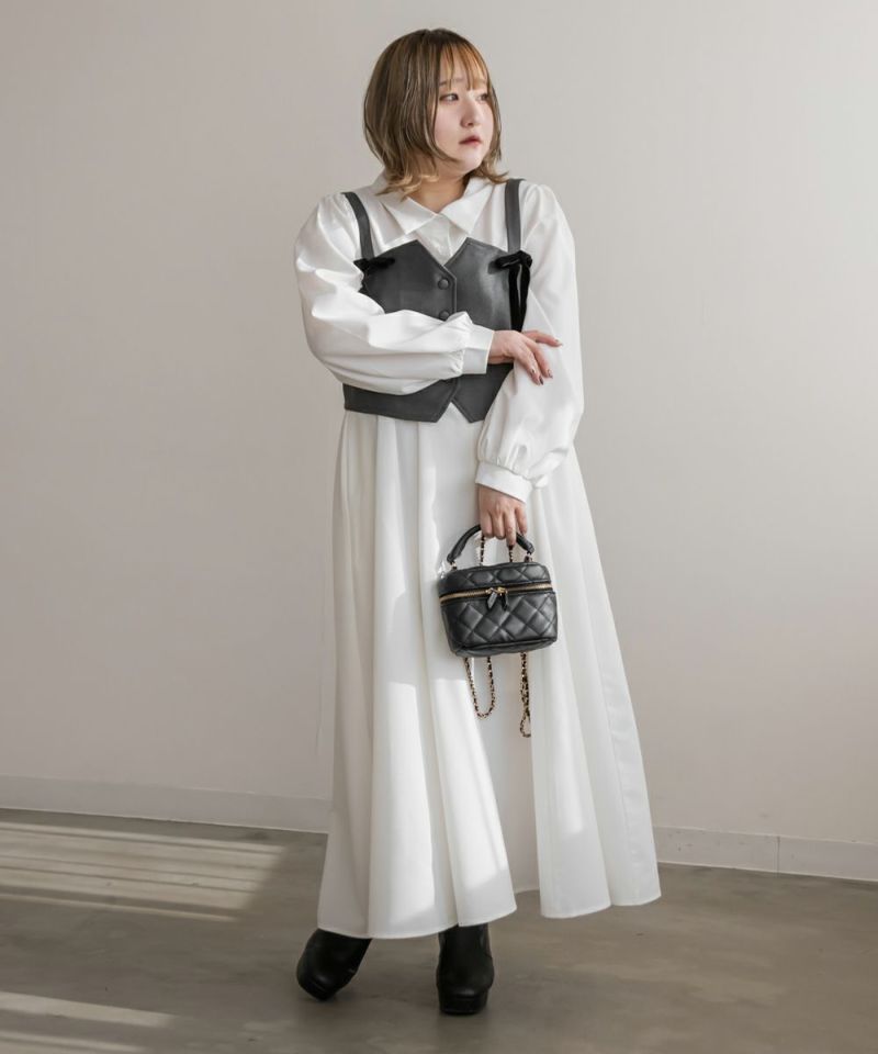LLサイズを着てちょうどいいサイズ感でした。特に窮屈感はなく着用出来たので、いつも通りのサイズ選びで問題なさそうです。シャツ襟も詰まりすぎていないので苦しくないのが嬉しいです!シャツワンピースにビスチェがセットになったアイテムで、このセットで着るだけでお洒落な雰囲気になれます♪ワンピース単品で着ても大人っぽい雰囲気だし、ビスチェもほかのブラウスなどとコーデしてもかわいいので、着回しも楽しめます◎