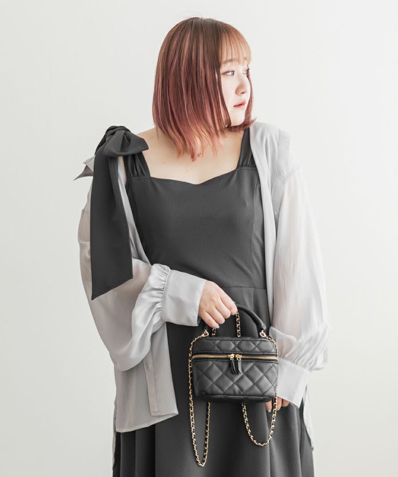 3Lサイズを着用しましたが、肩まわりやバストまわりも窮屈感なく、全体的にちょうどいいサイズ感でした◎生地に少しハリがあって、体のラインを拾いにくいのが嬉しいです!しっかり伸びもあるのでらくちんな着心地でした。肩のリボンがアクセントになっていて、甘くなりすぎず、さりげなく可愛さをプラスしてくれます。ノースリーブでも着用できるよう肩紐が隠せるデザインになっているのがポイントで、インナー次第でロングシーズン使えてたくさんの着回しが可能です♪