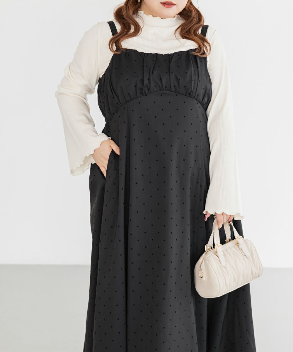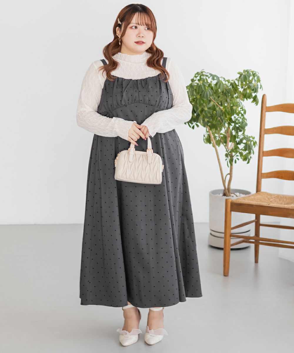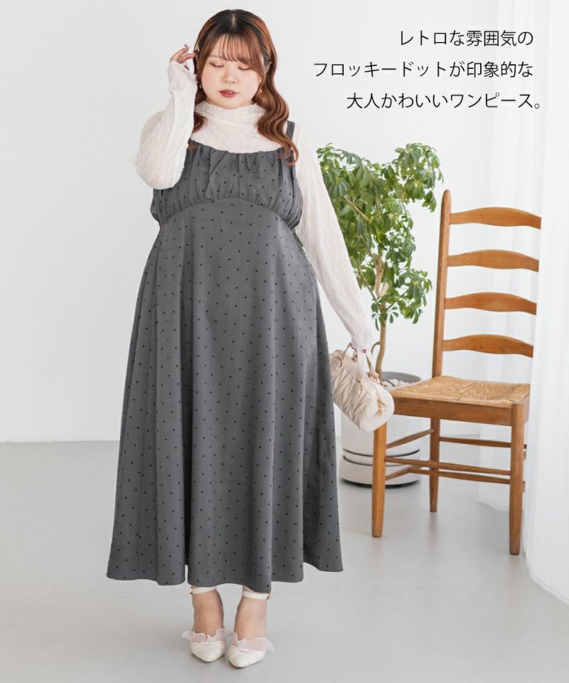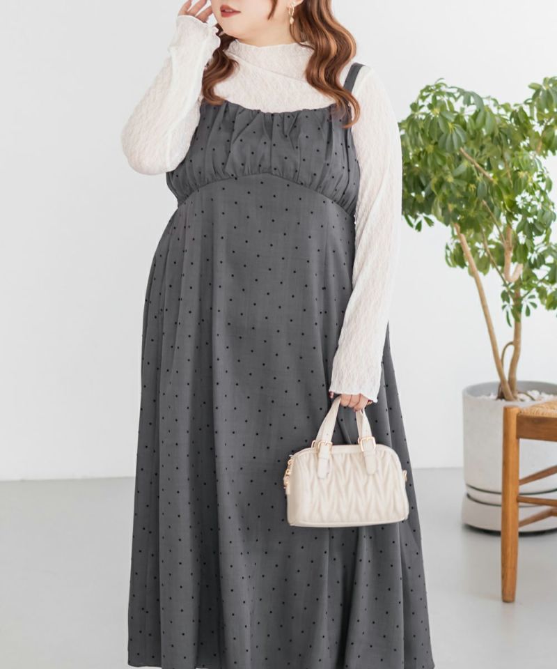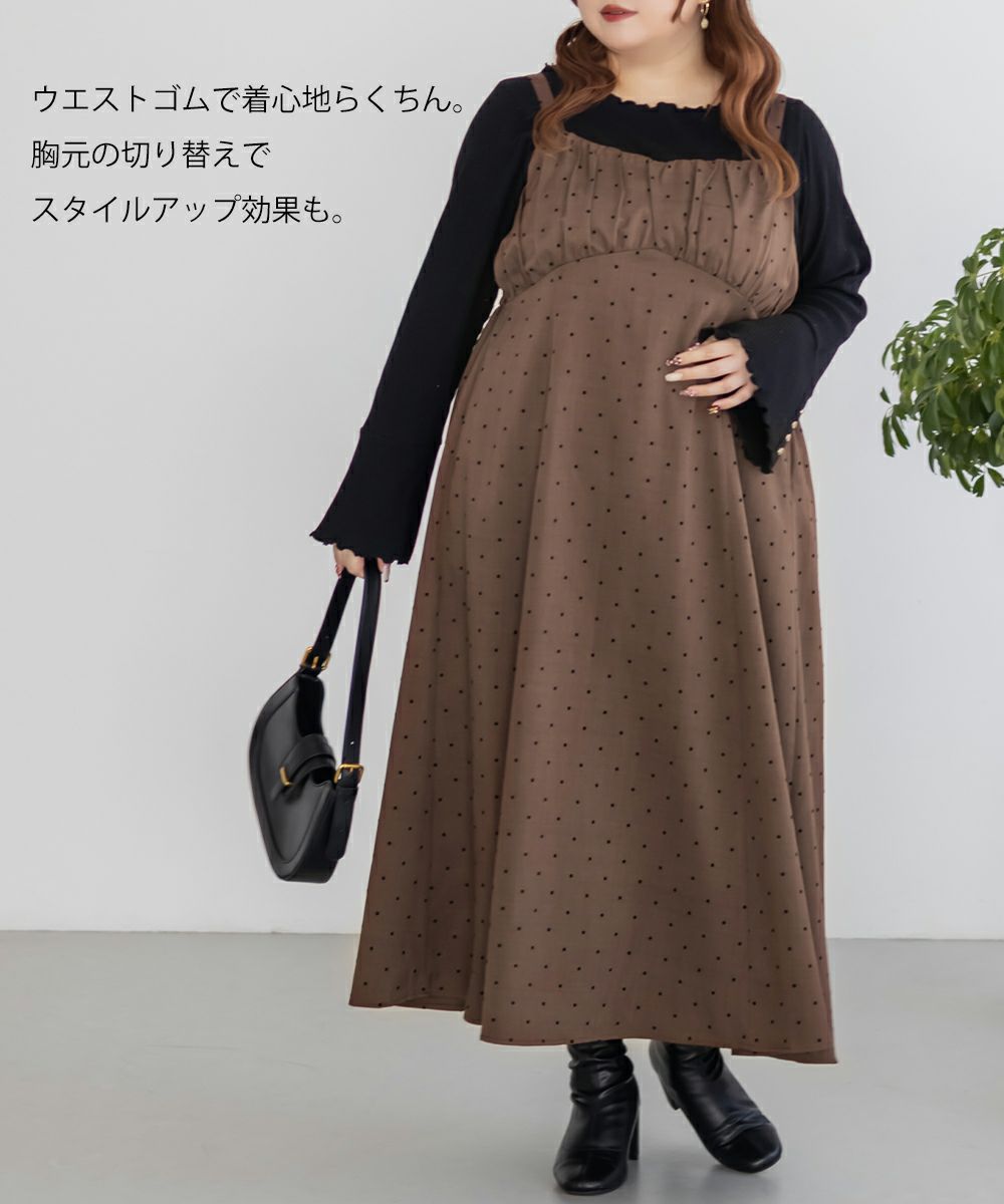 3Lサイズを着用して丁度良い着心地で、いつも通りのサイズで問題なく着用出来ました。後ろはゴム入りなのと、肩紐は調節できる仕様で、ストレスフリーな着心地です。生地もさらっとした感じで重さも少なくオールシーズン着られる1枚。胸元は今っぽいギャザーがあしらわれたデザインで、バストをコンパクトに見せてくれます。胸下に切り替えがあるので足が長くスタイルアップして見えました!トレンドのドット柄のワンピースは今季持っておきたいアイテムの一つです!落ち着いた色味なので、インナー次第で様々な着こなしが楽しめます♪