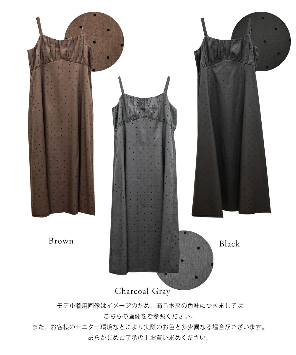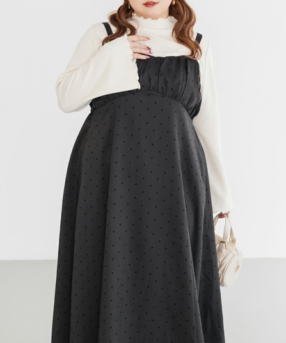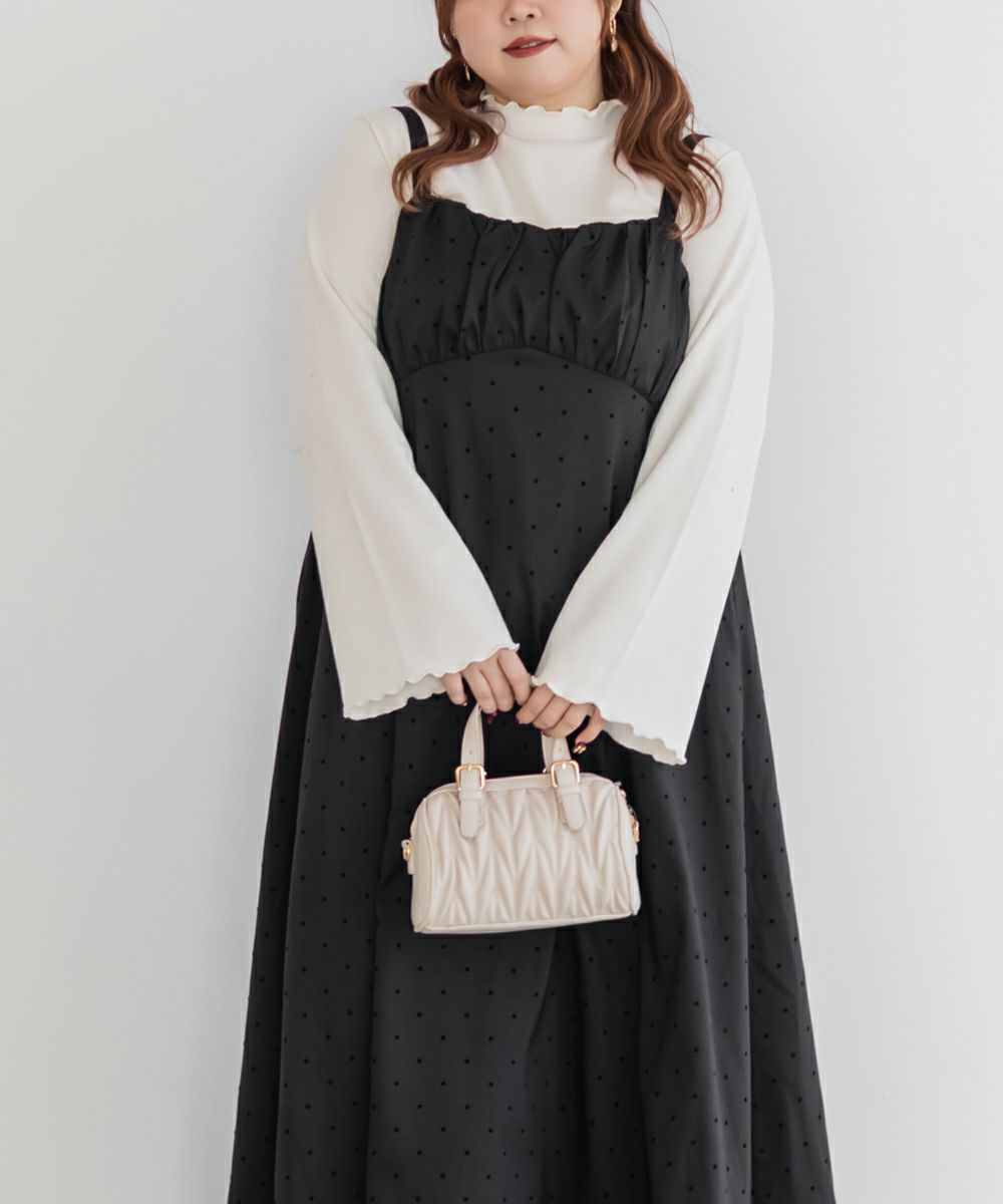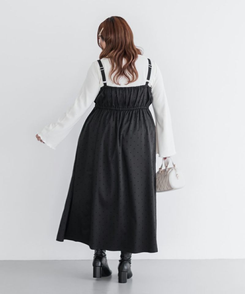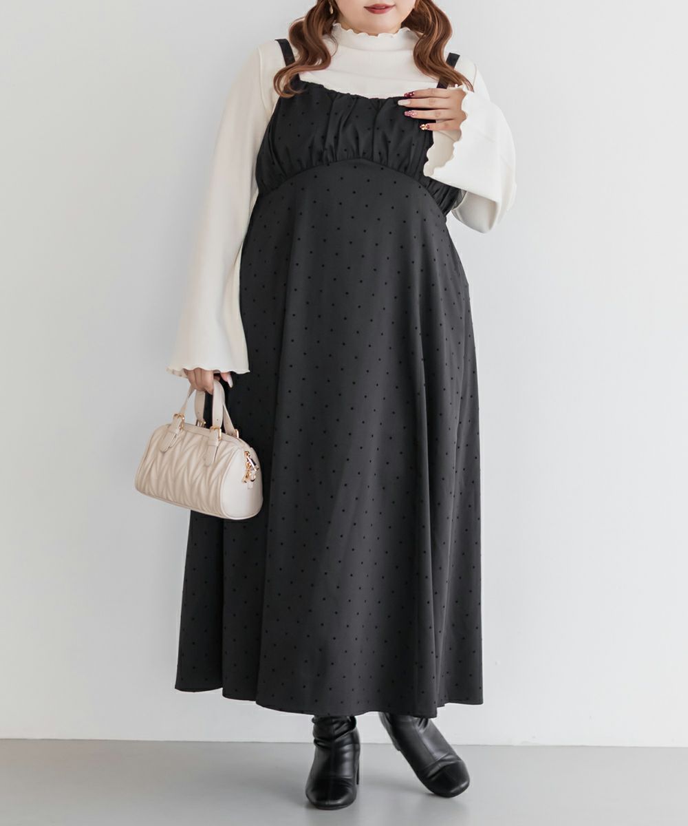 3Lサイズを着用して丁度良い着心地で、いつも通りのサイズで問題なく着用出来ました。後ろはゴム入りなのと、肩紐は調節できる仕様で、ストレスフリーな着心地です。生地もさらっとした感じで重さも少なくオールシーズン着られる1枚。胸元は今っぽいギャザーがあしらわれたデザインで、バストをコンパクトに見せてくれます。胸下に切り替えがあるので足が長くスタイルアップして見えました!トレンドのドット柄のワンピースは今季持っておきたいアイテムの一つです!落ち着いた色味なので、インナー次第で様々な着こなしが楽しめます♪