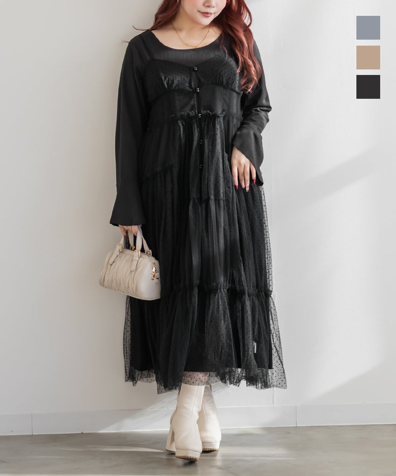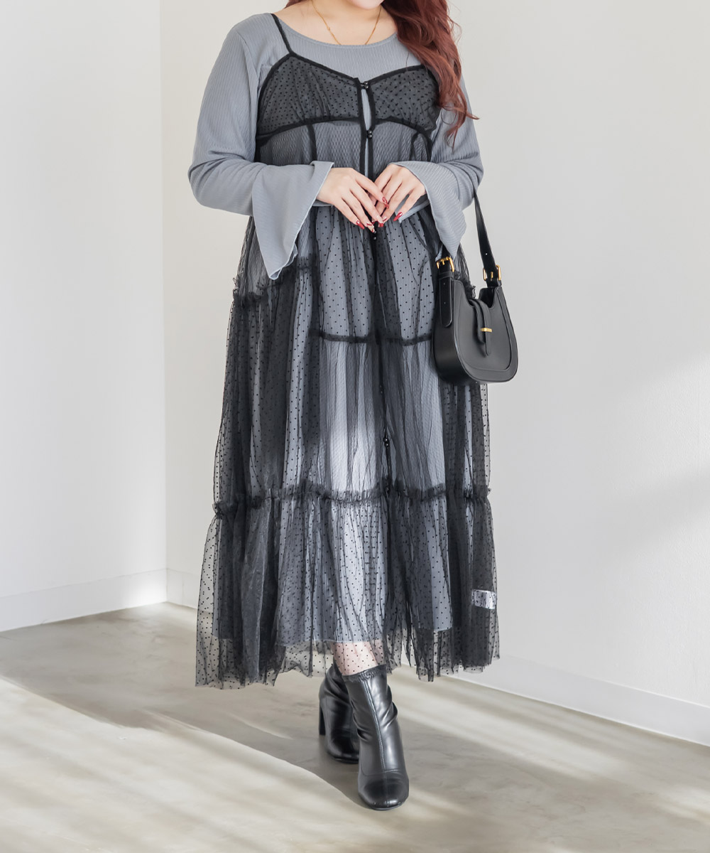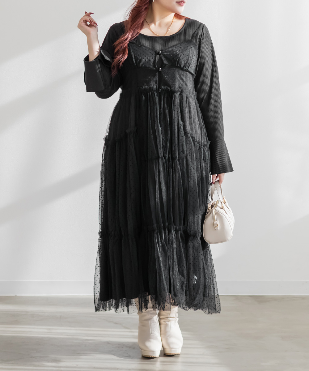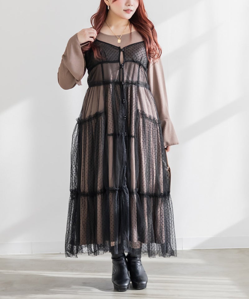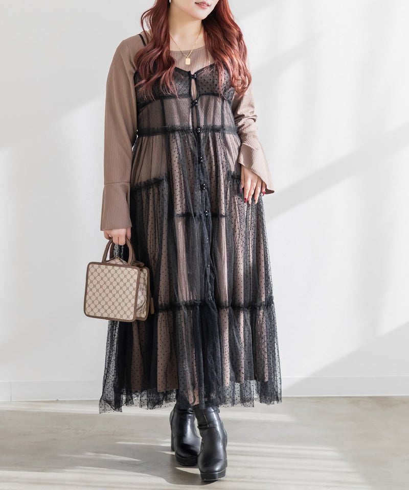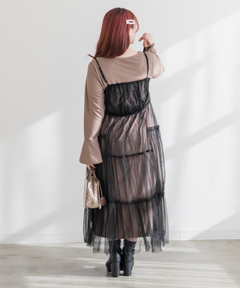 ダイヤ柄とドット柄のチュールをパッチワーク調に組み合わせたキャミワンピースに、インナーのリブワンピースもセットになったコーディネートいらずのアイテム。ふんわりとしたティアードシルエットのチュールは透け感が軽やかな風合い。