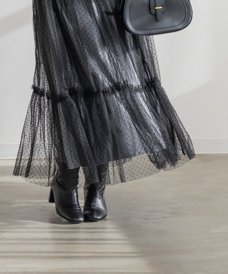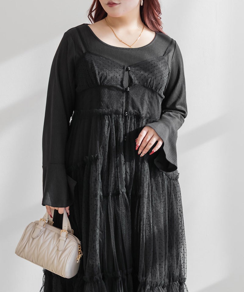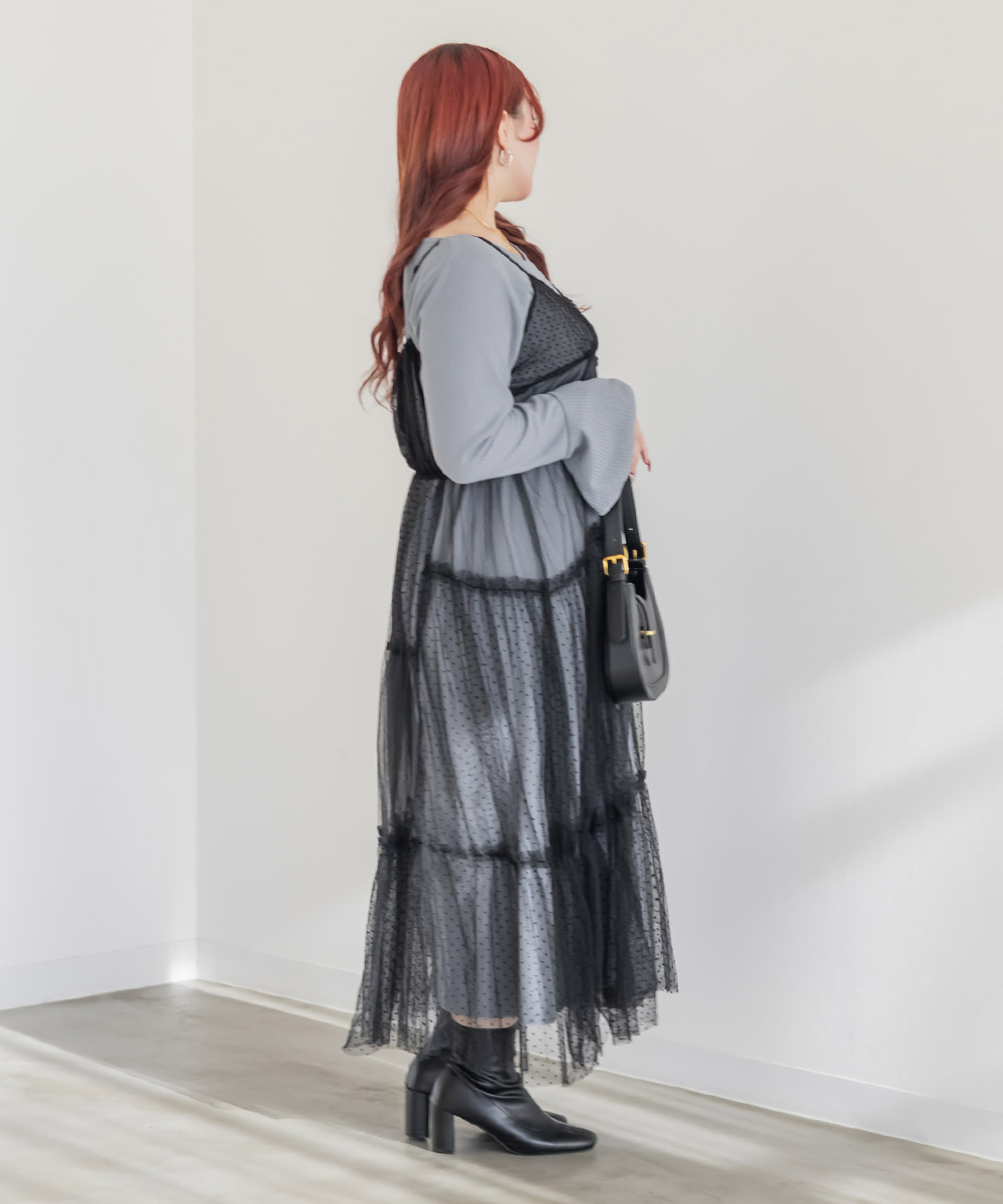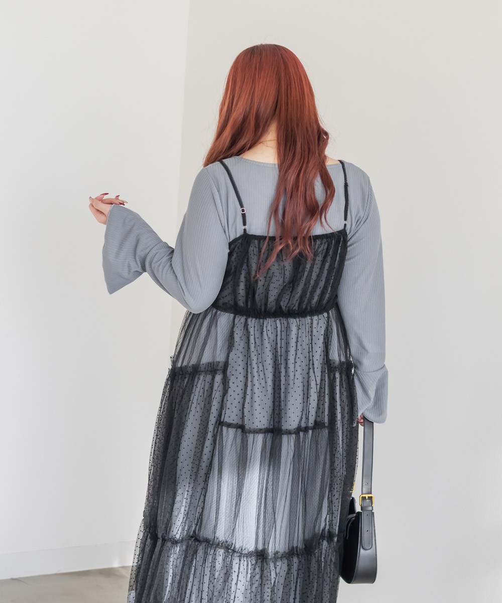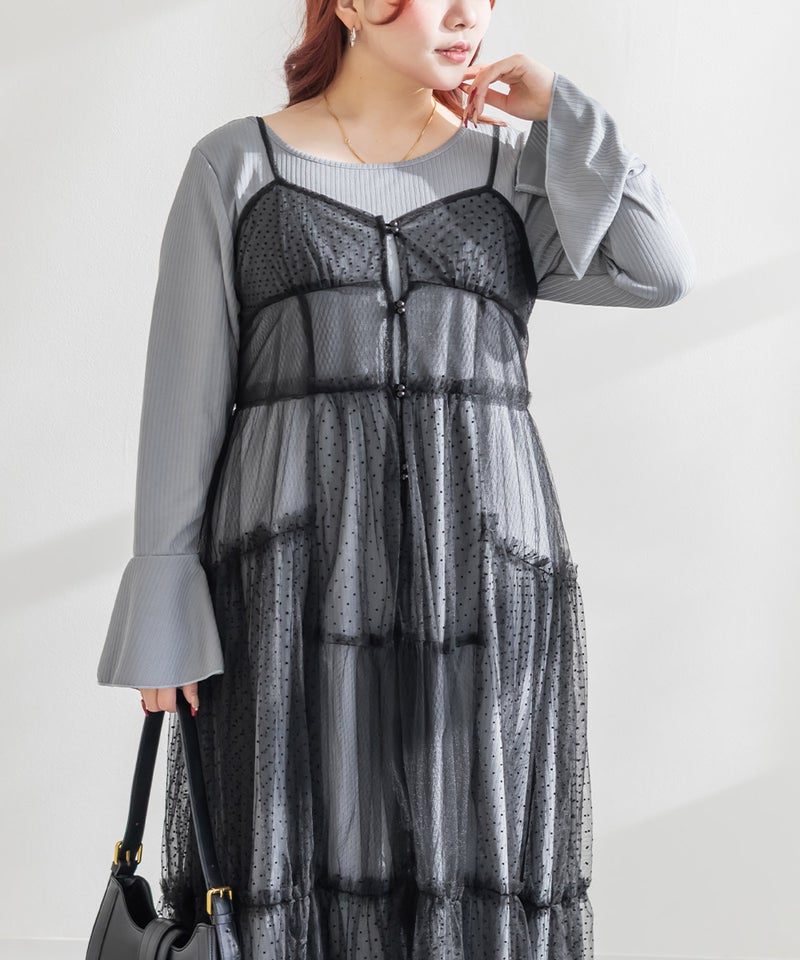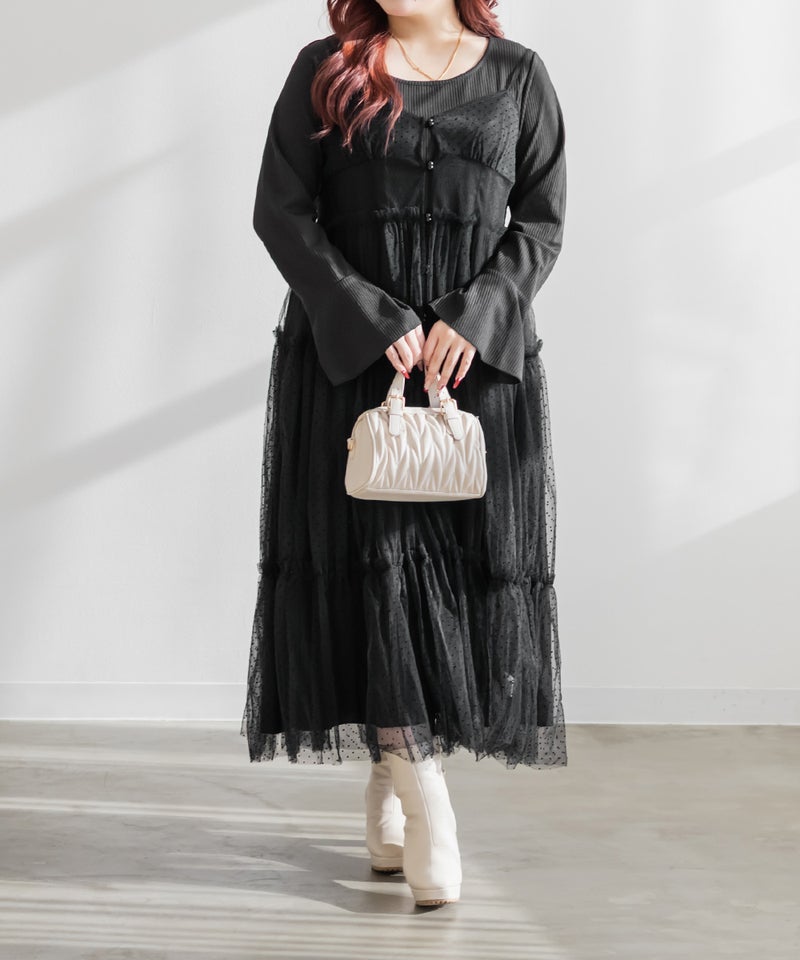 ダイヤ柄とドット柄のチュールをパッチワーク調に組み合わせたキャミワンピースに、インナーのリブワンピースもセットになったコーディネートいらずのアイテム。ふんわりとしたティアードシルエットのチュールは透け感が軽やかな風合い。