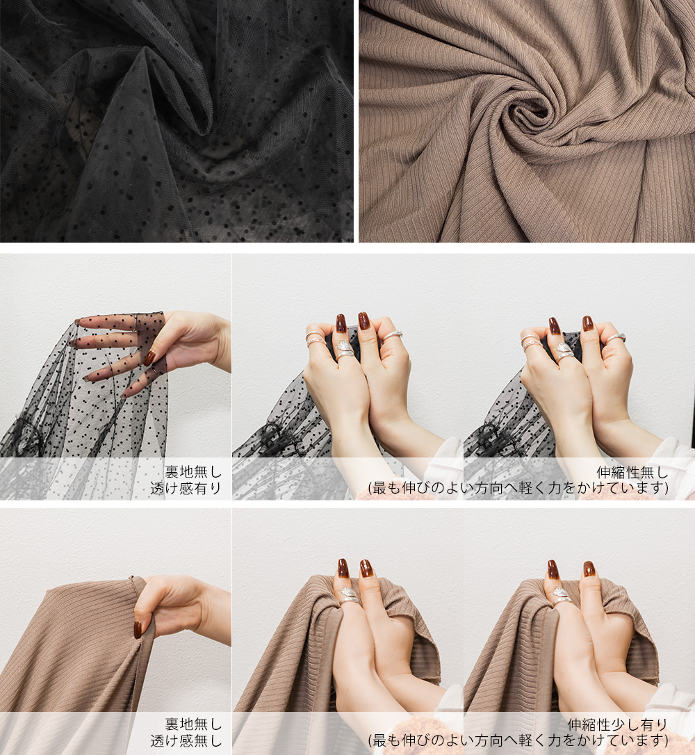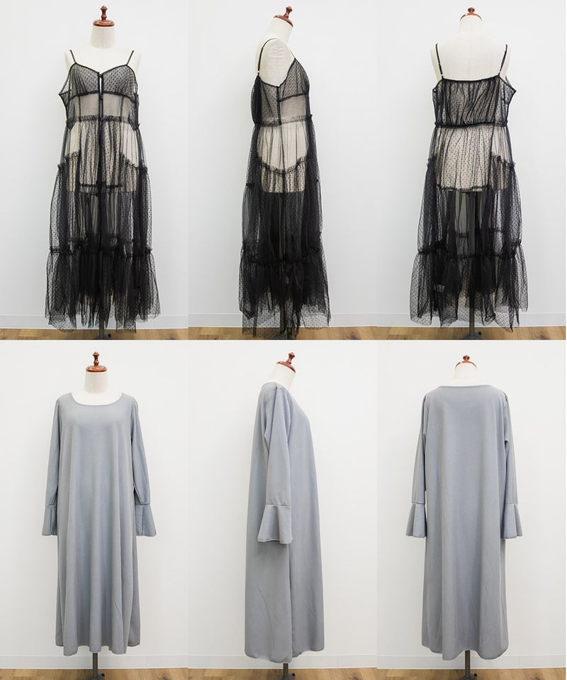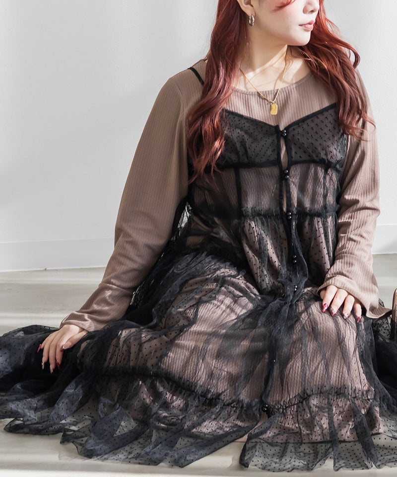 インナーワンピースは程よくしっかりとしたリブカットソー。キャミワンピースはダイヤ柄とドット柄の柔らかいチュール素材。真夏以外のロングシーズン着用可能な生地感です。