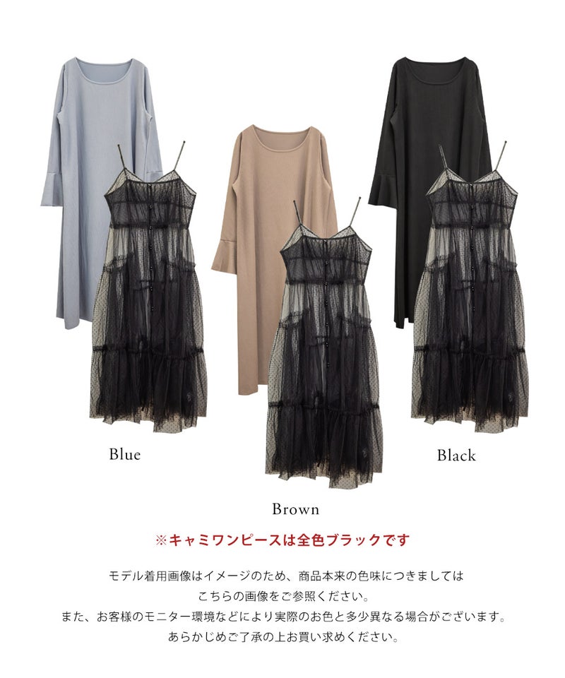 ロング丈だからヒスニーカーやローヒールシューズでもバランス良く着る事ができます。お出かけしたくなる着映えするデザインで、旅行にもおすすめ。インナーワンピースとキャミワンピース、それぞれ単品使いもできるので色々なパターンで着回し可能。チュールワンピースはパンツと合わせてトレンド感のあるレイヤードコーデも出来るから、この1セットあればスタイリングの幅が広がります。