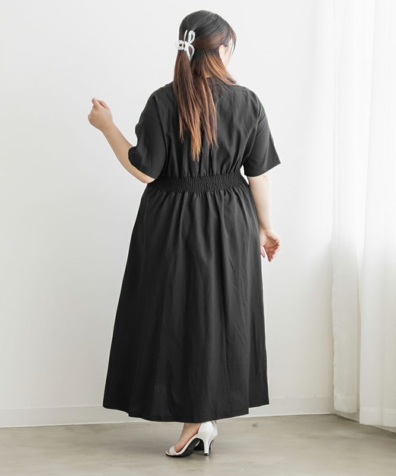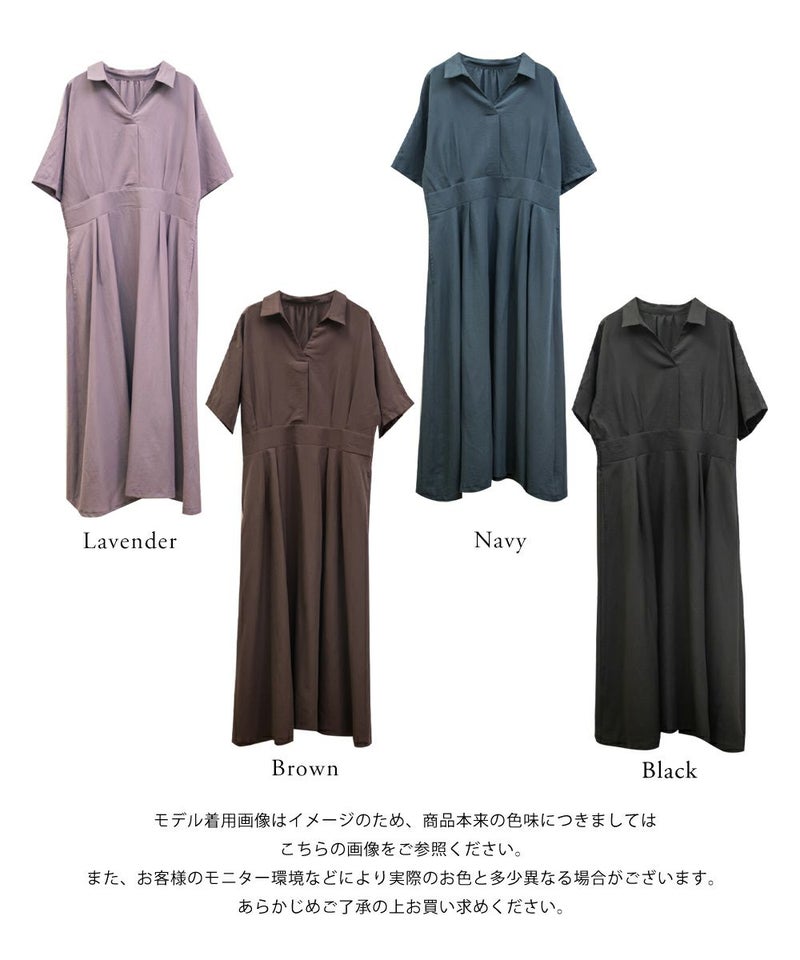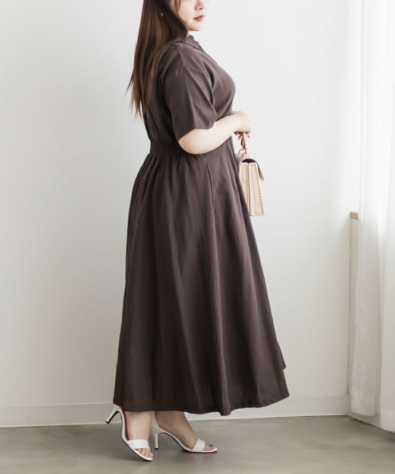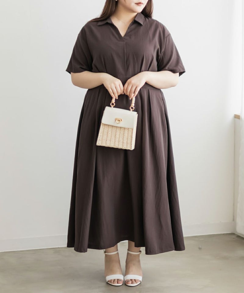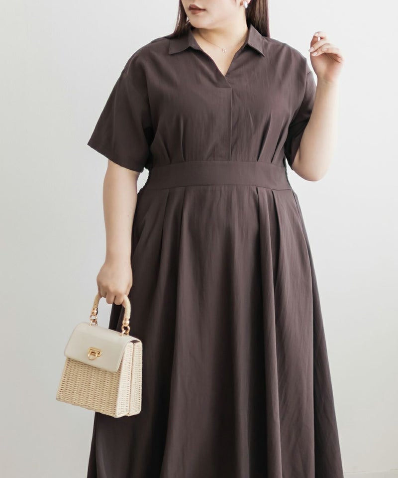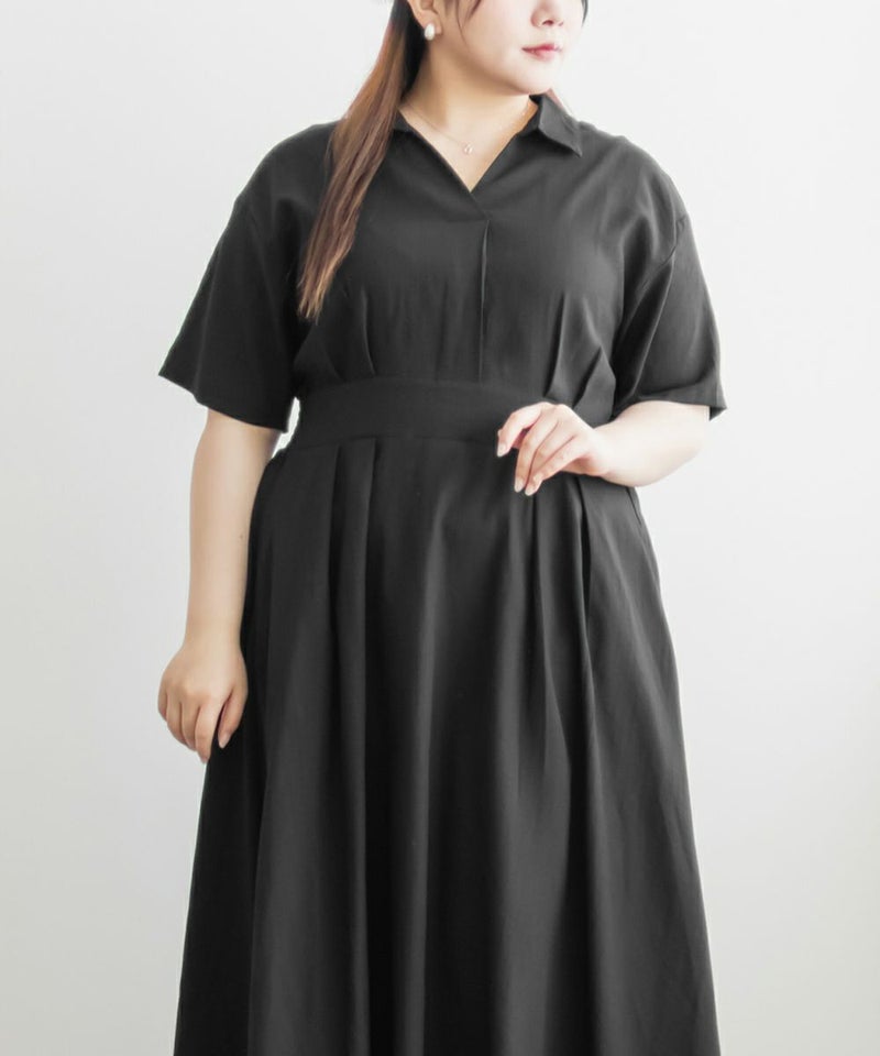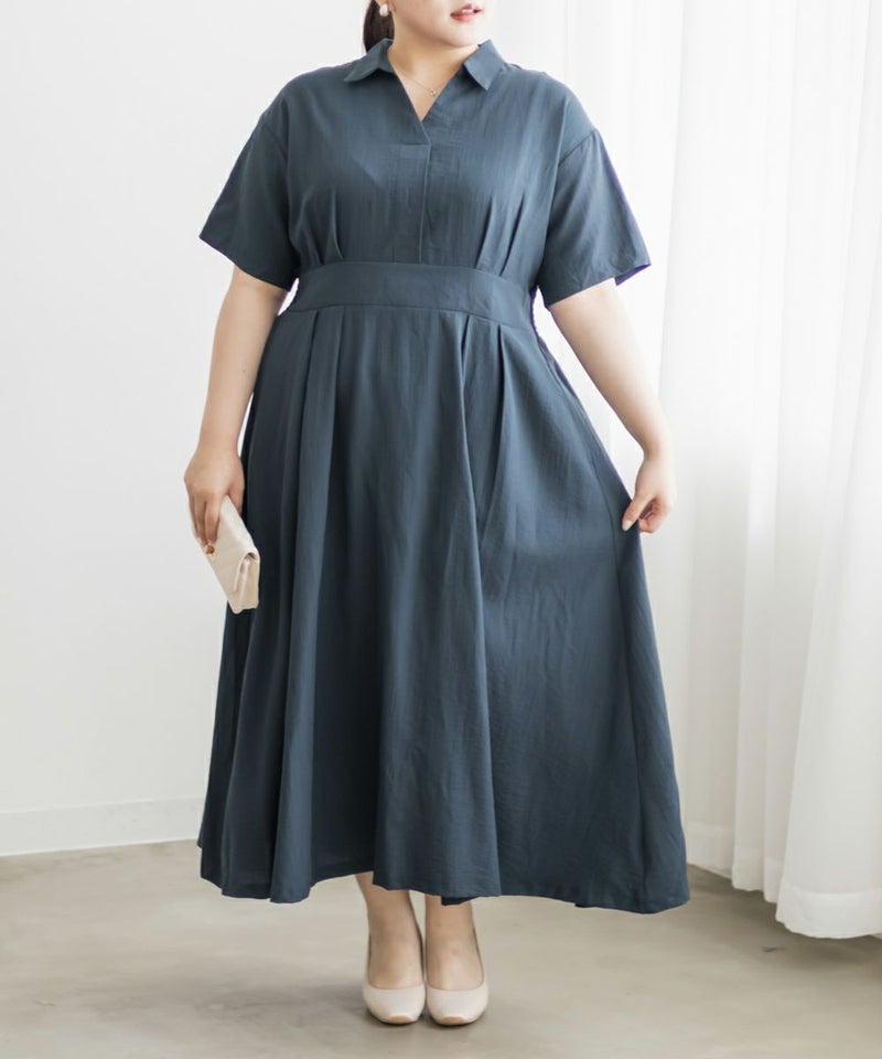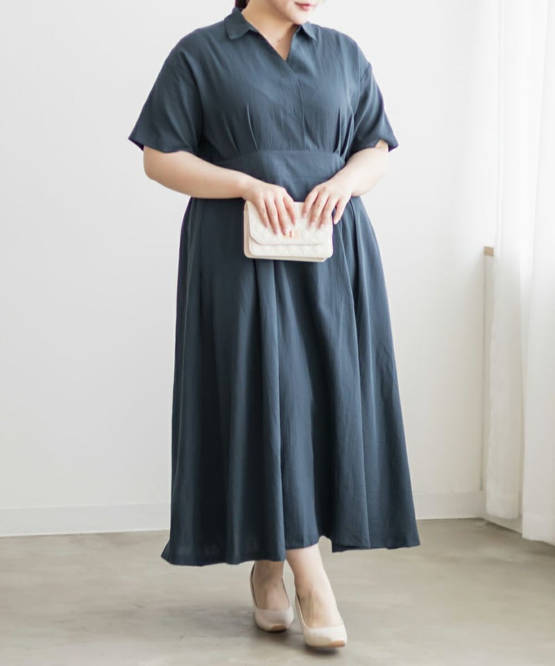 3Lサイズを着て身幅や腕まわりにも余裕があり、窮屈さは感じませんでした。ウエストのタックがしっかり効いていて、着るだけで自然にメリハリのあるシルエットに◎ネックはしっかり開いていて、着脱がしやすいのも嬉しいポイントです♪スキッパー襟は首まわりがすっきり見えて、大人っぽくきちんと感のある印象に。丈感は足首が少し見えるくらいで、フラットシューズとも好相性です。シンプルながらも女性らしさが詰まったデザインで、お仕事やお出かけにも活躍しそうな1枚です!